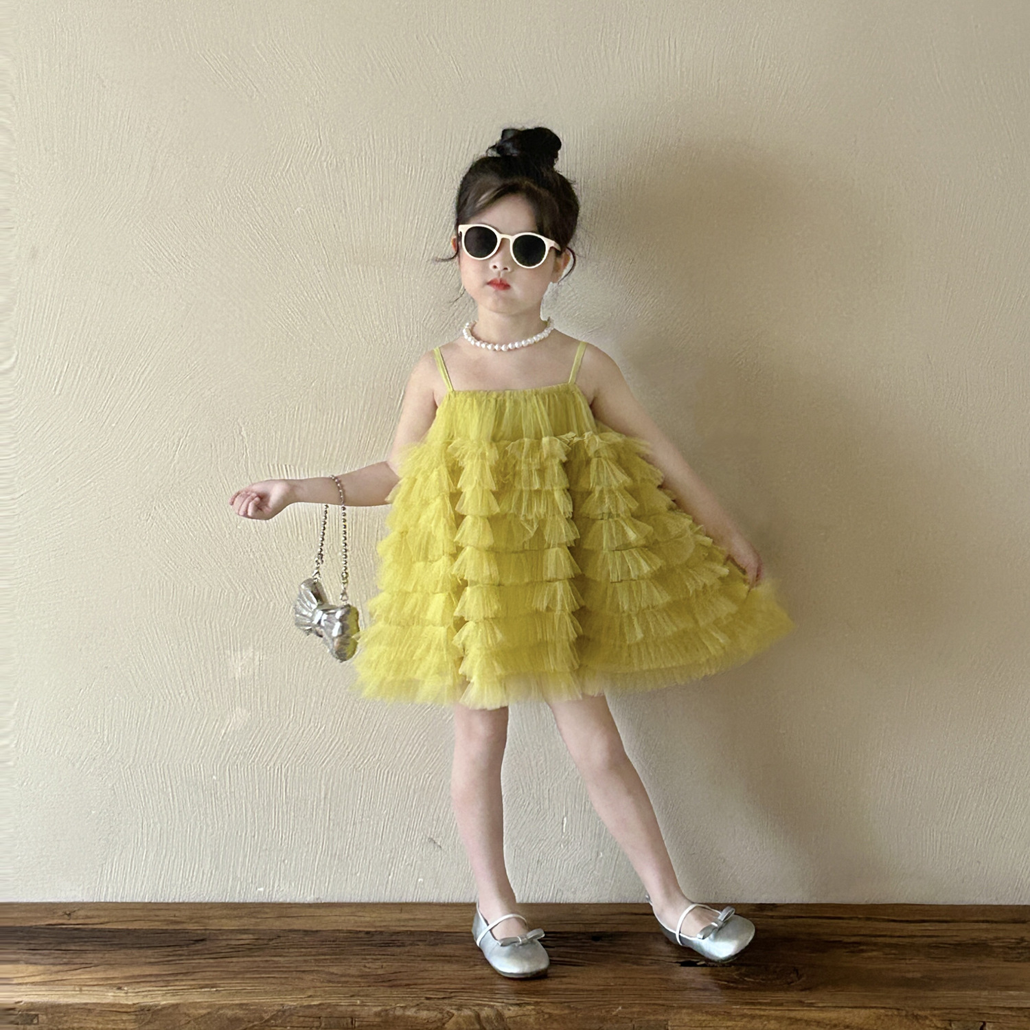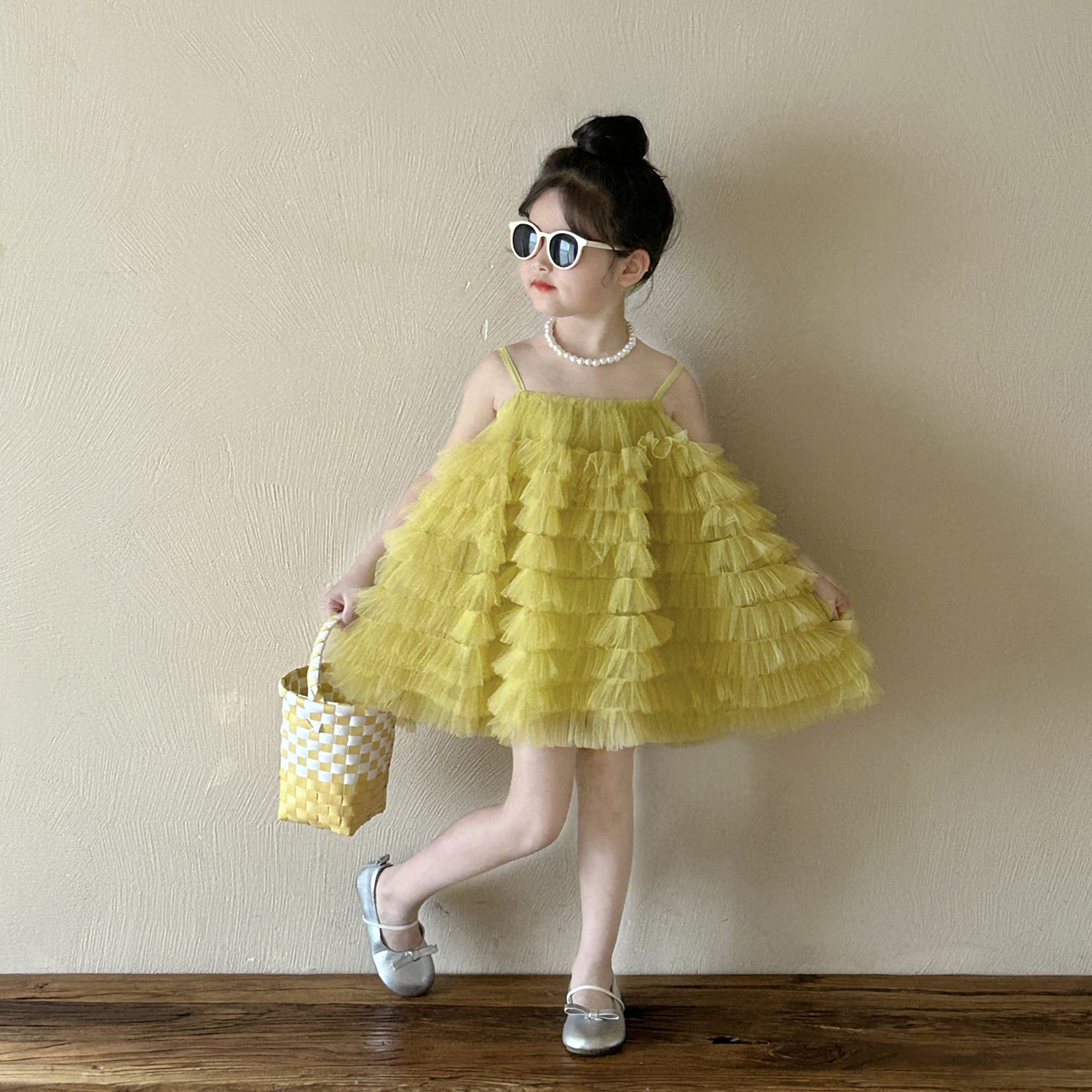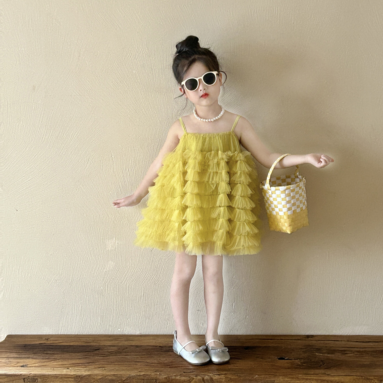 여자 프렌치 스타일 우아한 메쉬 슬링 원피스 2025 여름 새 소녀의 푹신한 케이크 스커트 공주 스커트
