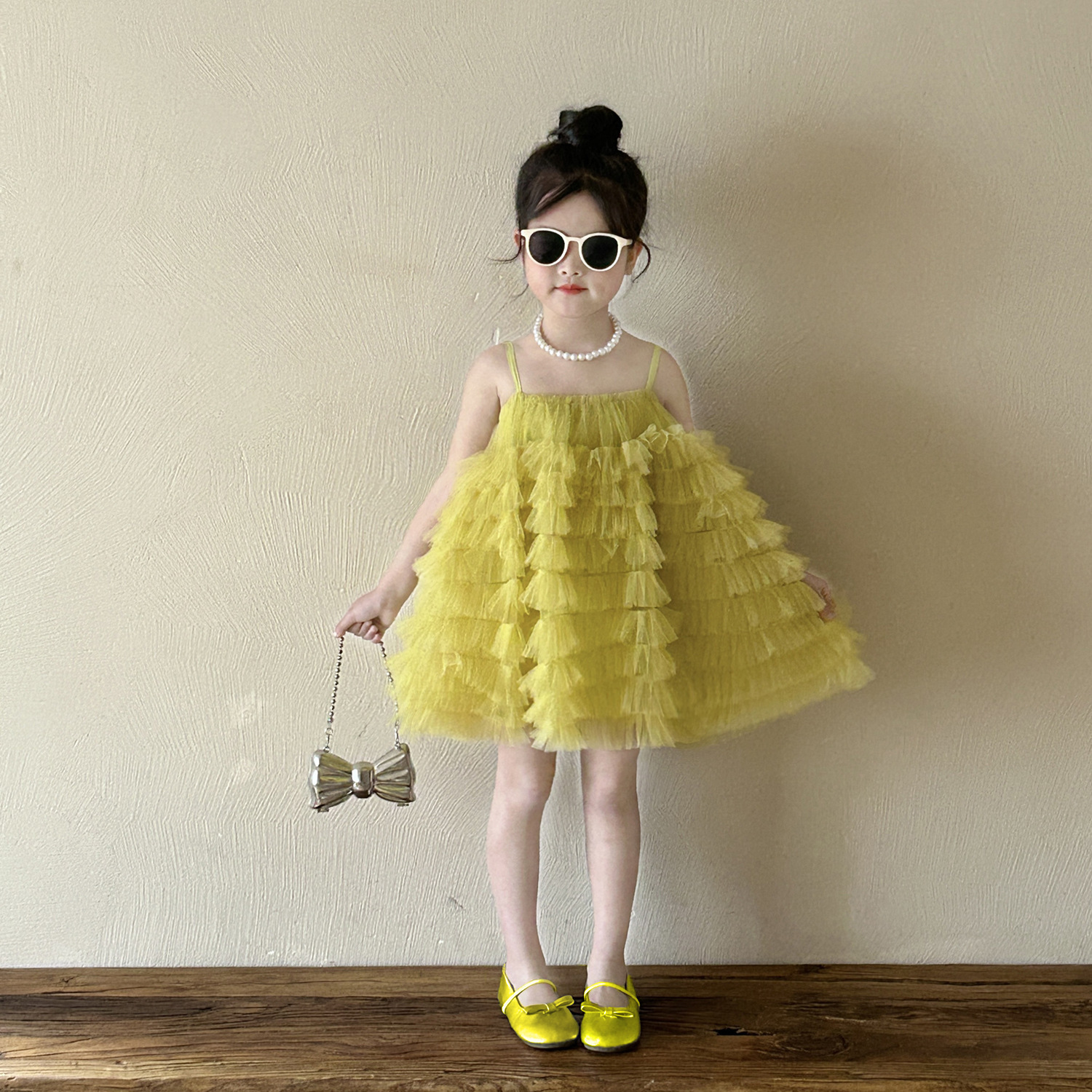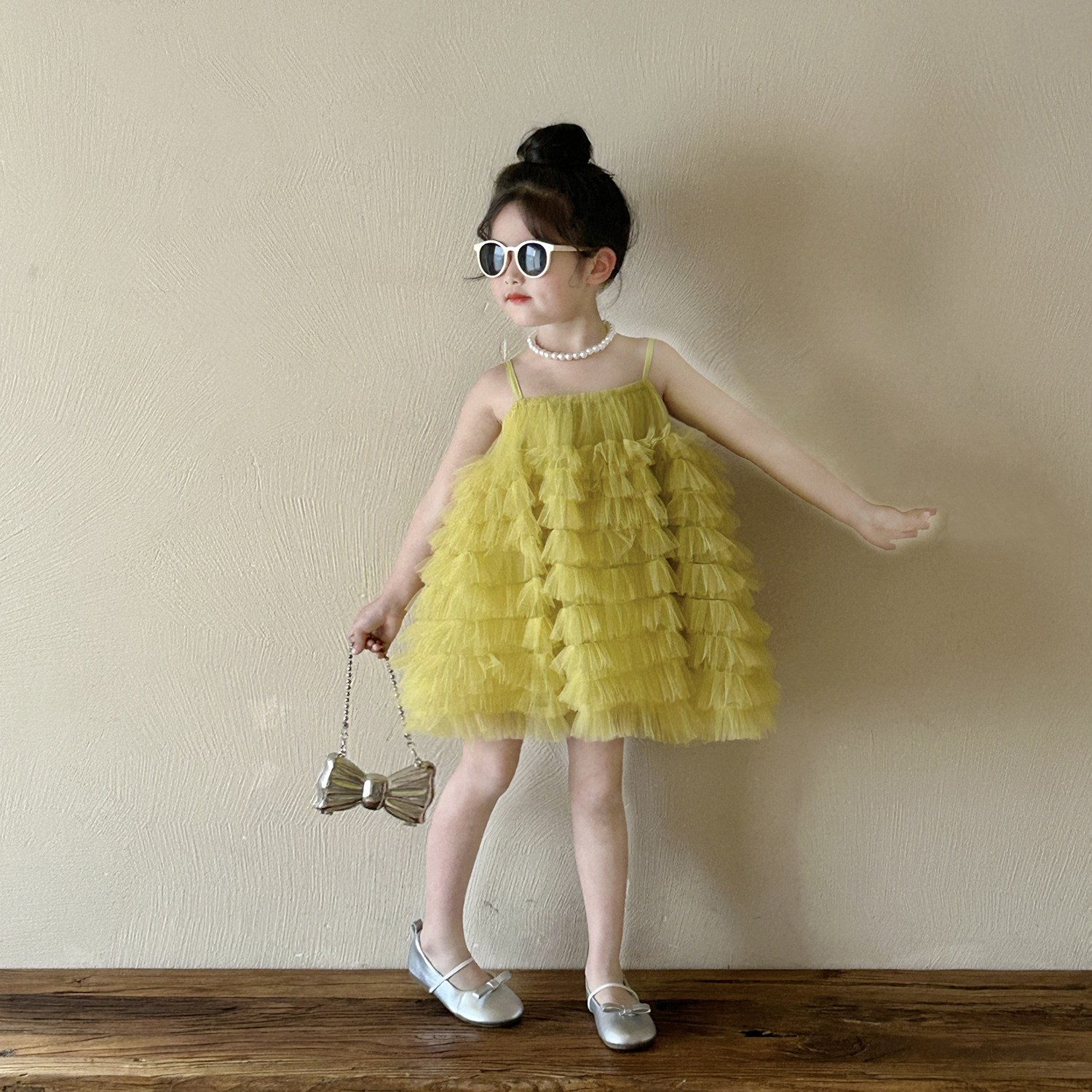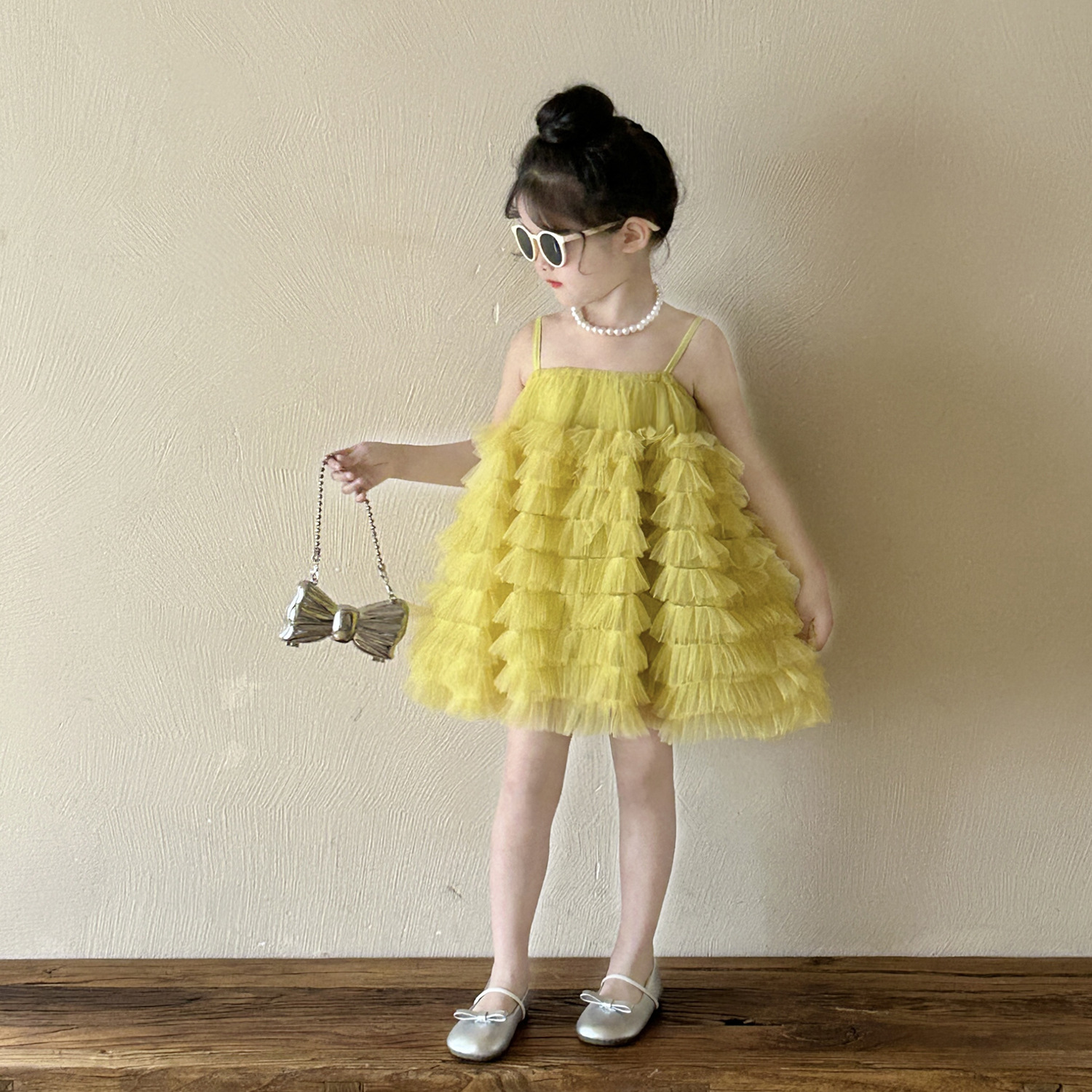 여자 프렌치 스타일 우아한 메쉬 슬링 원피스 2025 여름 새 소녀의 푹신한 케이크 스커트 공주 스커트