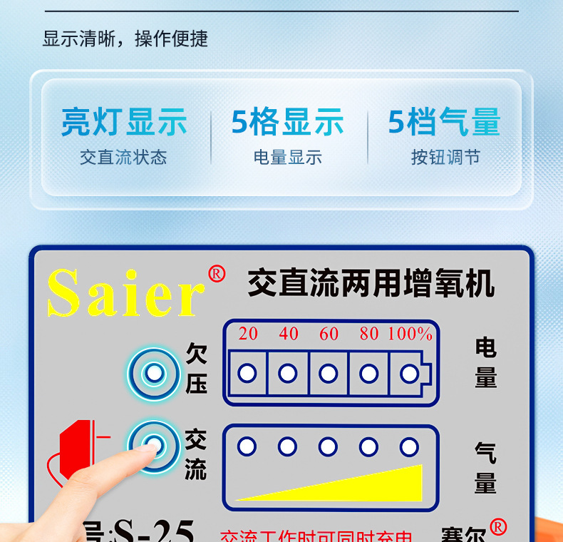 Sailiba 산소 발생기 휴대용 물고기 산소 펌프 야외 충전식 이중 목적 AC 및 DC 고출력 산소 펌프
