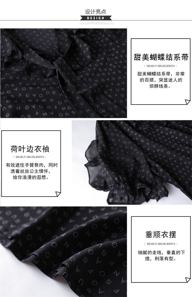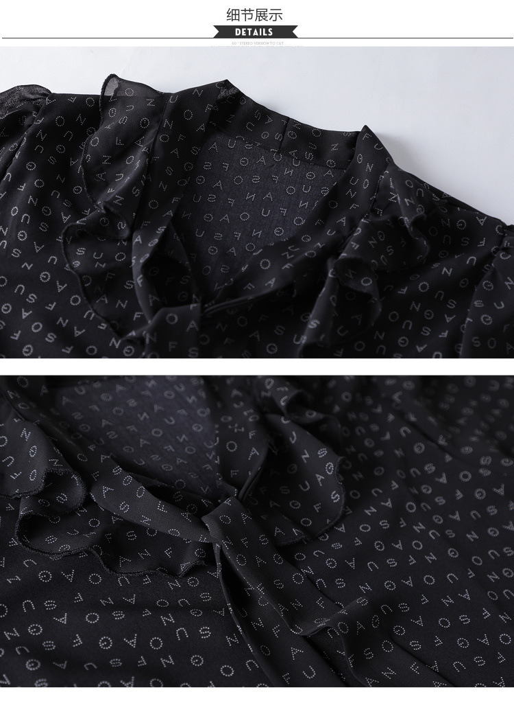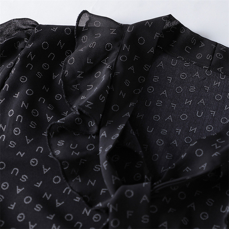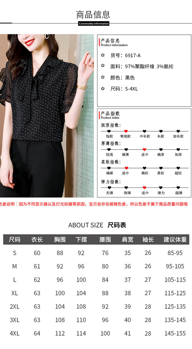 활 편지 리본 러플 반소매 풀오버 셔츠 여성용 여름 블랙 쉬폰 드래핑 주름 방지 티셔츠
