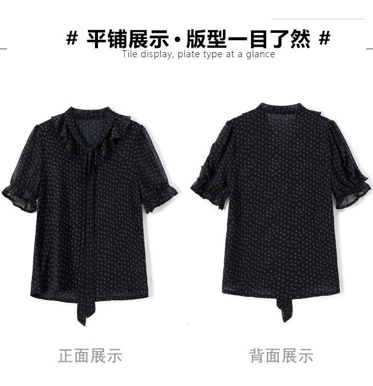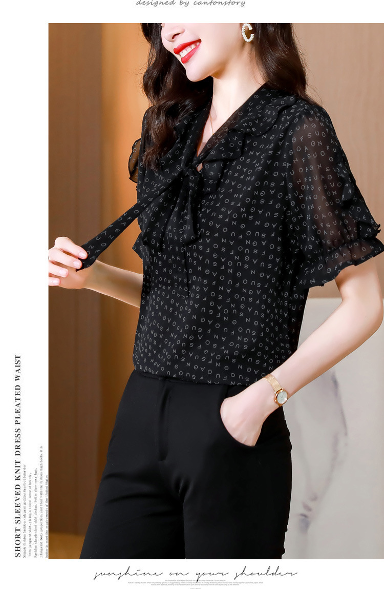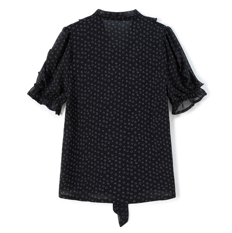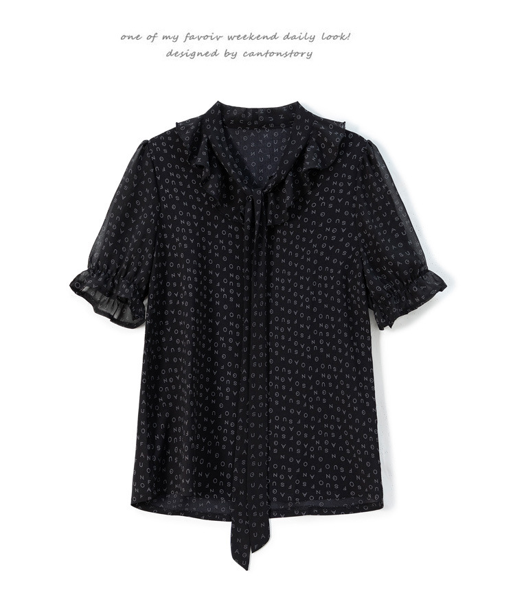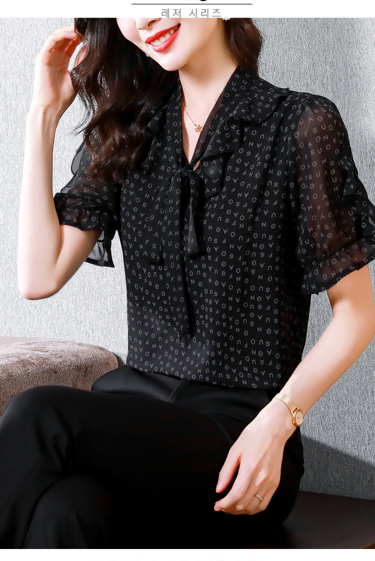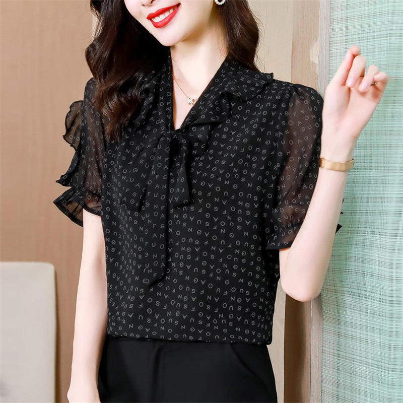 활 편지 리본 러플 반소매 풀오버 셔츠 여성용 여름 블랙 쉬폰 드래핑 주름 방지 티셔츠스토어 가기