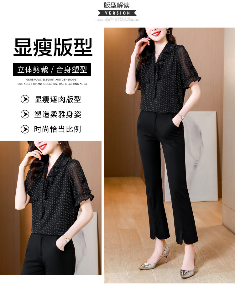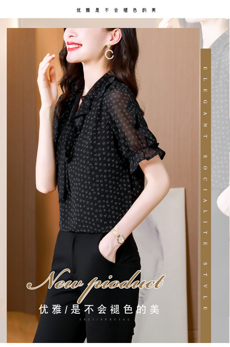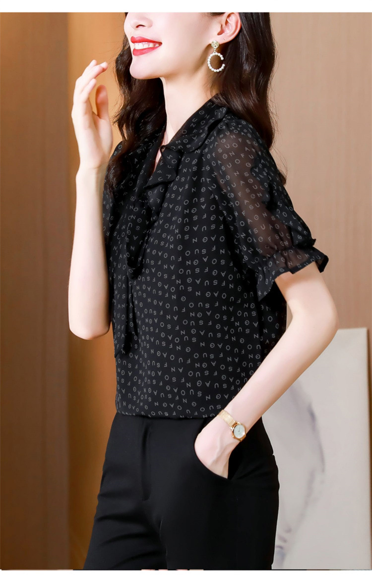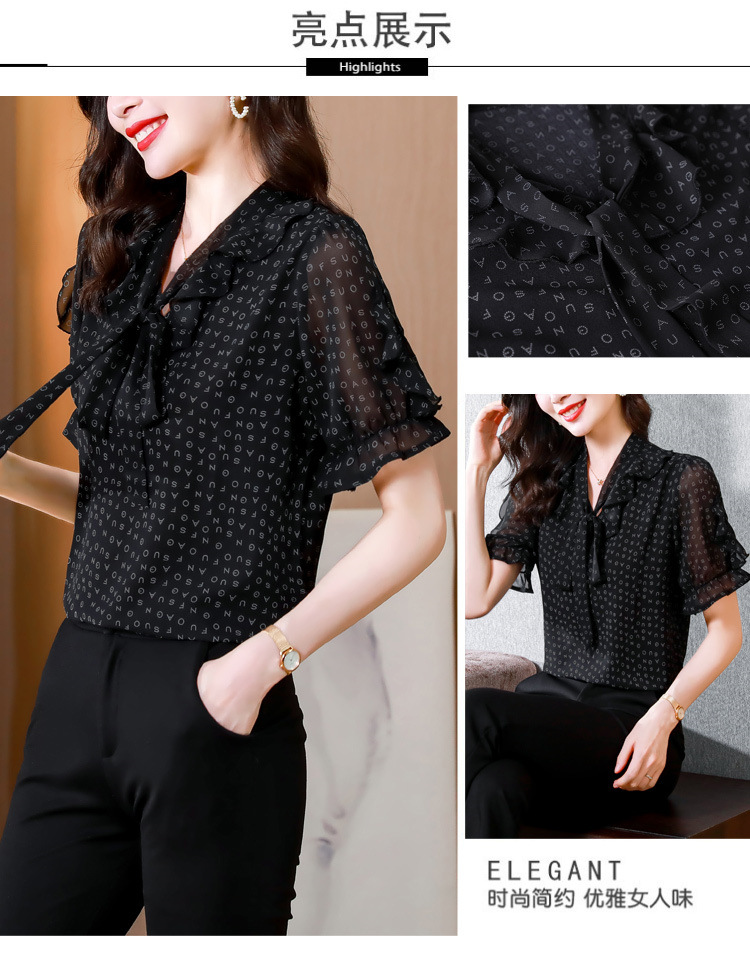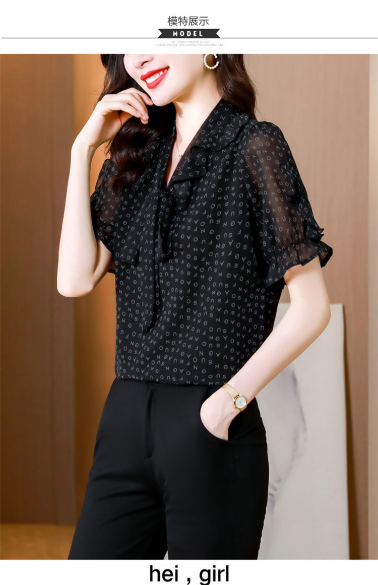 활 편지 리본 러플 반소매 풀오버 셔츠 여성용 여름 블랙 쉬폰 드래핑 주름 방지 티셔츠스토어 가기