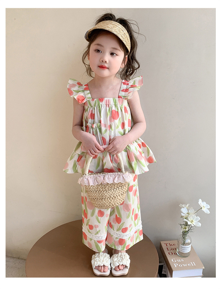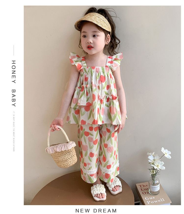 한국 소녀의 꽃 슬링 세트 2025 여름 새로운 투피스 서양식 인터넷 기념 캐주얼 아동복 패션스토어 가기