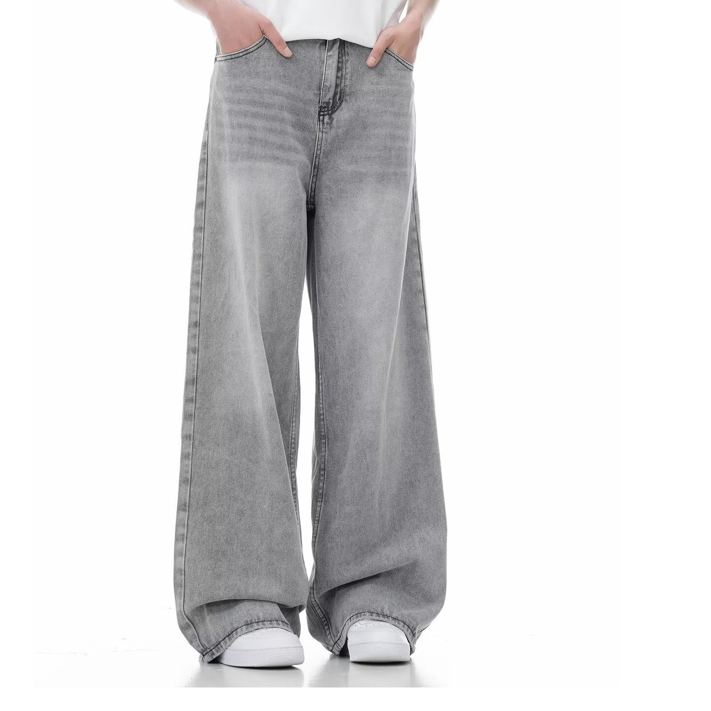 아메리칸 스타일 레트로 시멘트 그레이 하이 허리 청바지 여성의 봄과 가을 하이 스트리트 디자인 센스 루즈 슬리밍 좁은 스트레이트 팬츠
