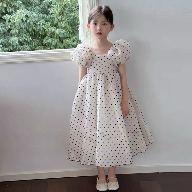 여자 헵번 스타일 버블 슬리브 원피스 여름 어린이 프랑스 진주 빛 베일 원피스 우아한 폴로 도트 공주 원피스스토어 가기