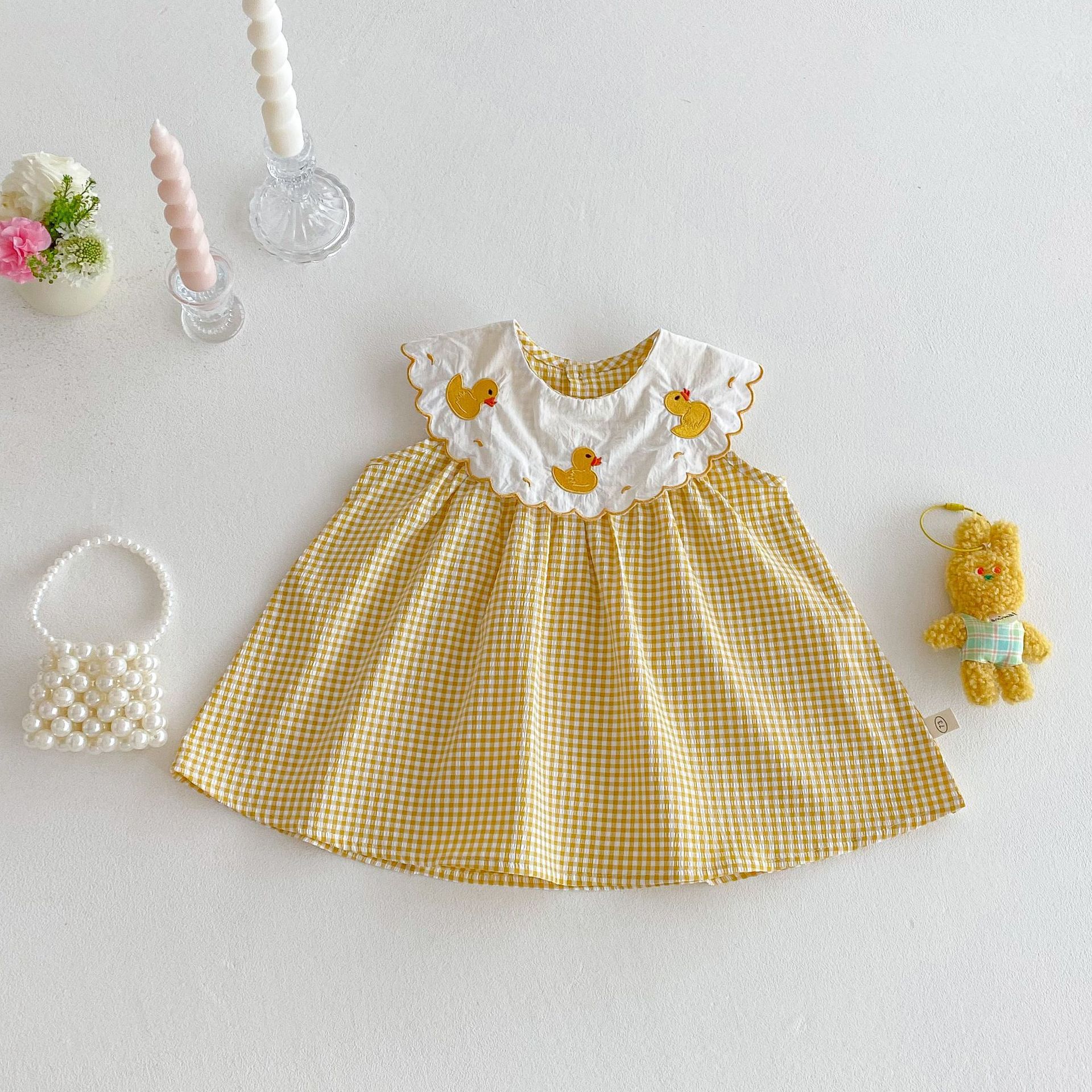 여자 오리 원피스 빅 2025 새로운 여름 어린이 한국 격자 무늬 원피스 아기를위한 만화 원피스 자수스토어 가기