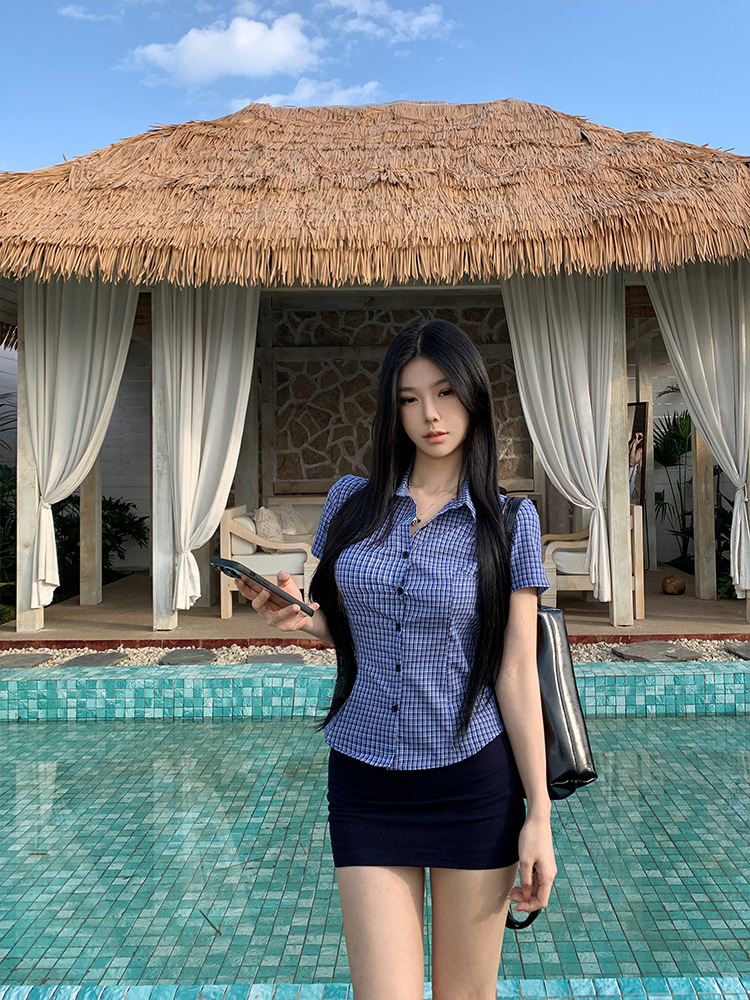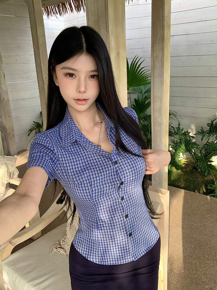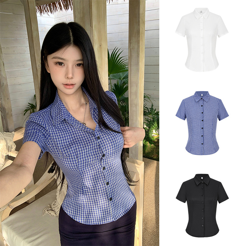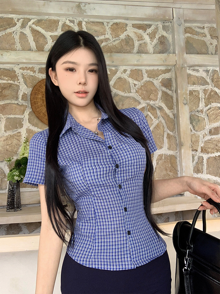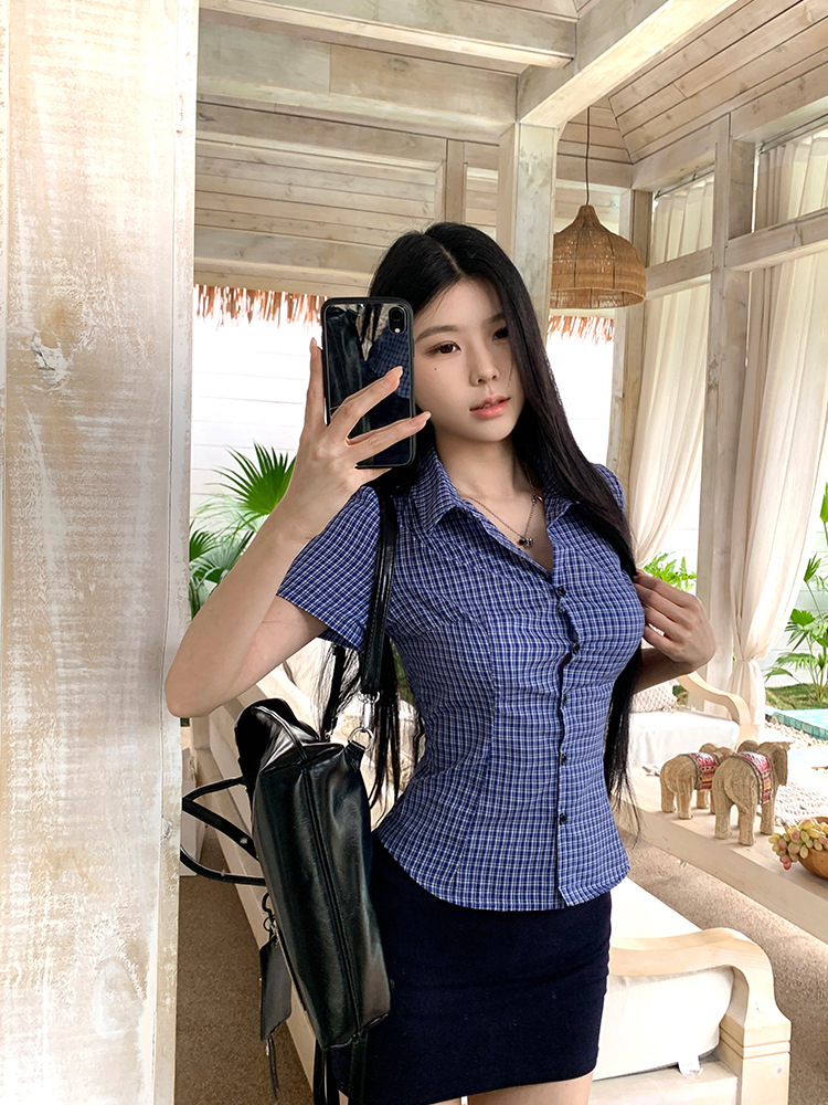 한국식 셔츠 슬림핏 슬림핏 짧은 격자 무늬 여성용 반팔 셔츠
