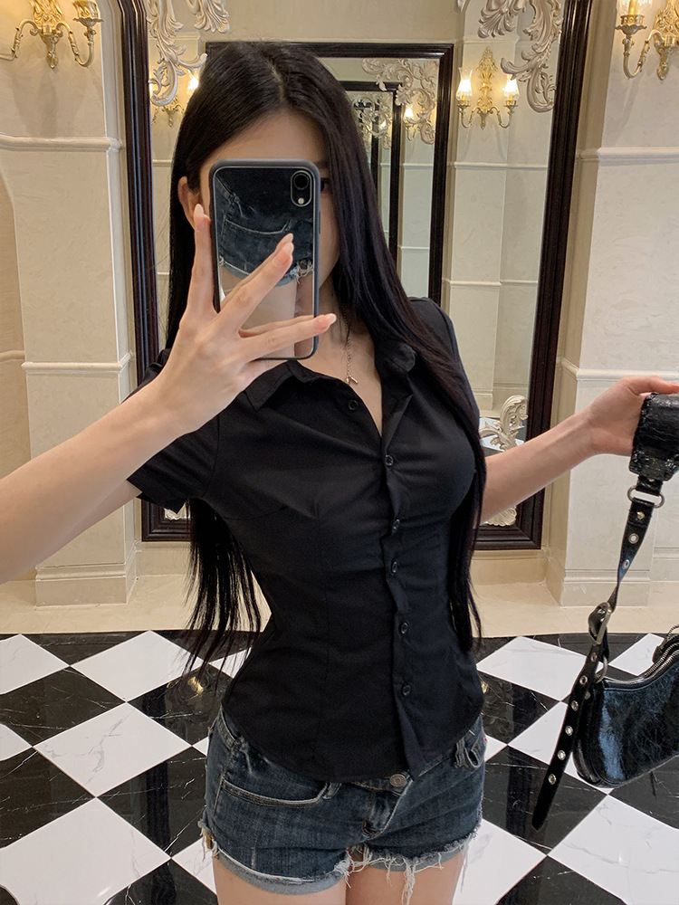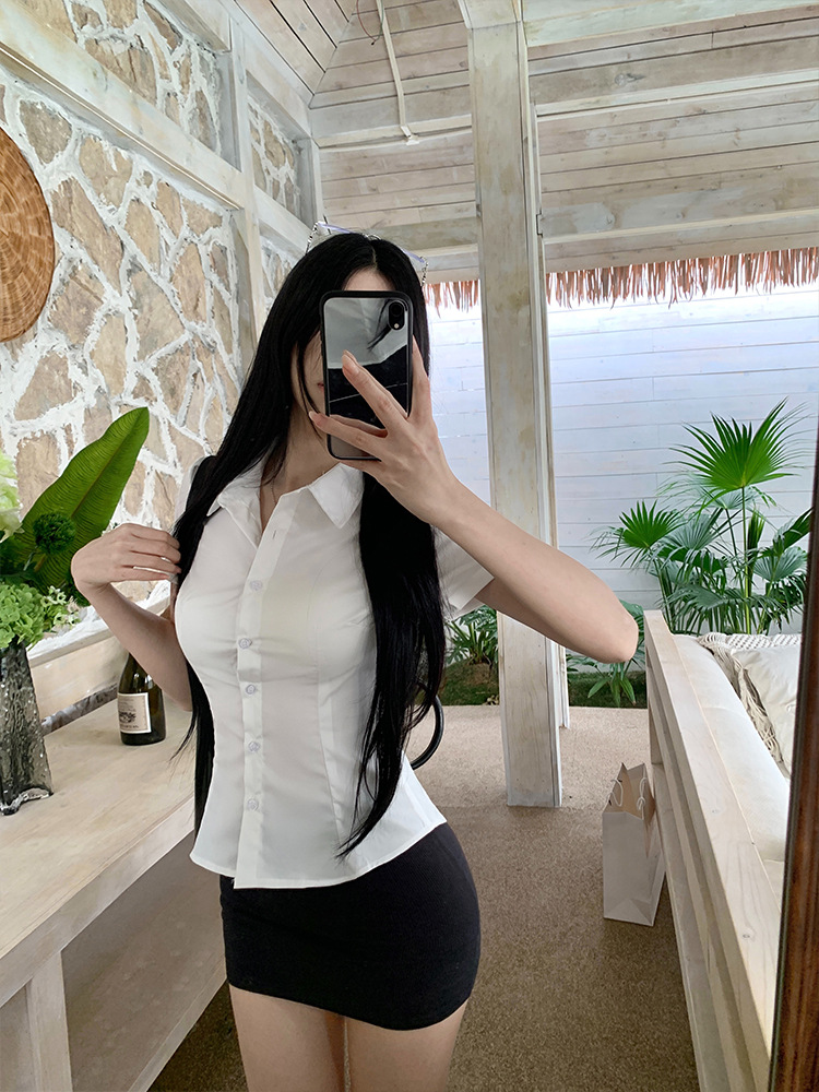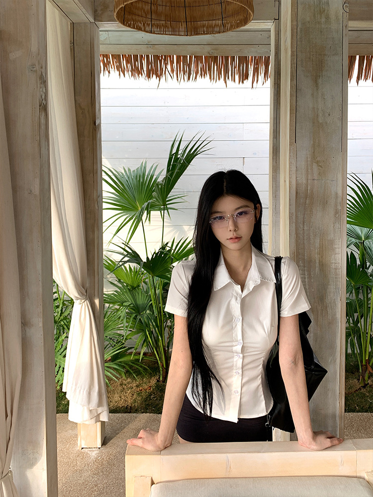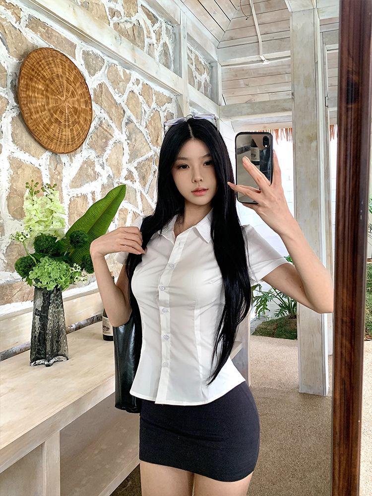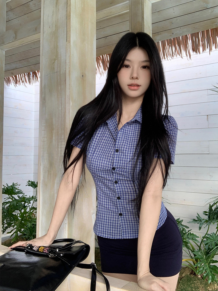 한국식 셔츠 슬림핏 슬림핏 짧은 격자 무늬 여성용 반팔 셔츠