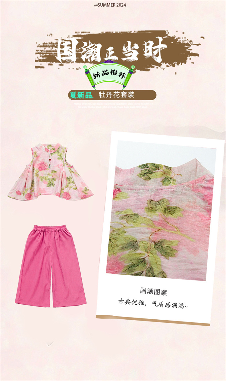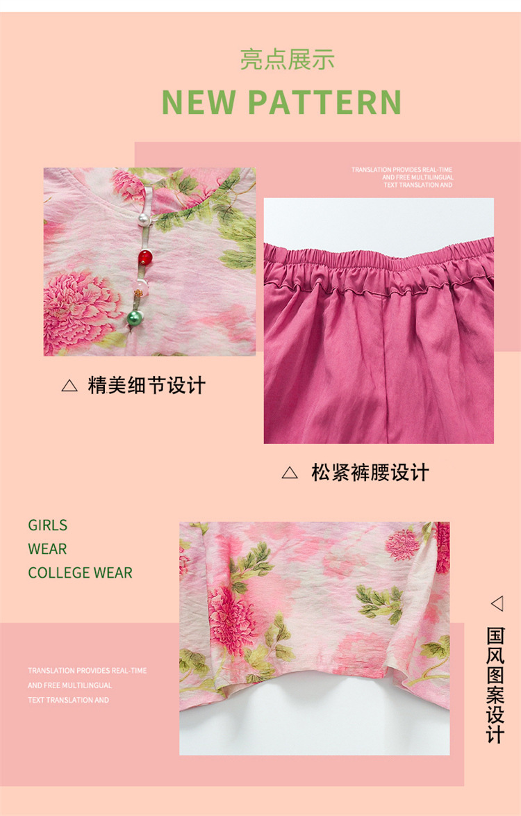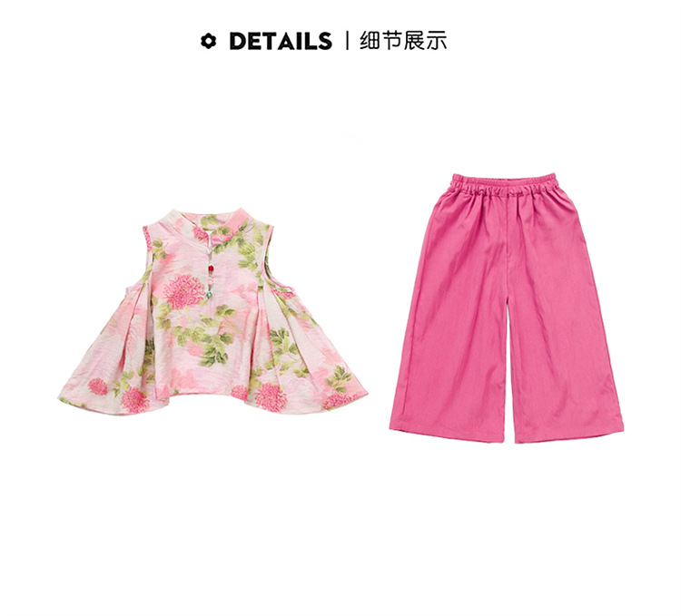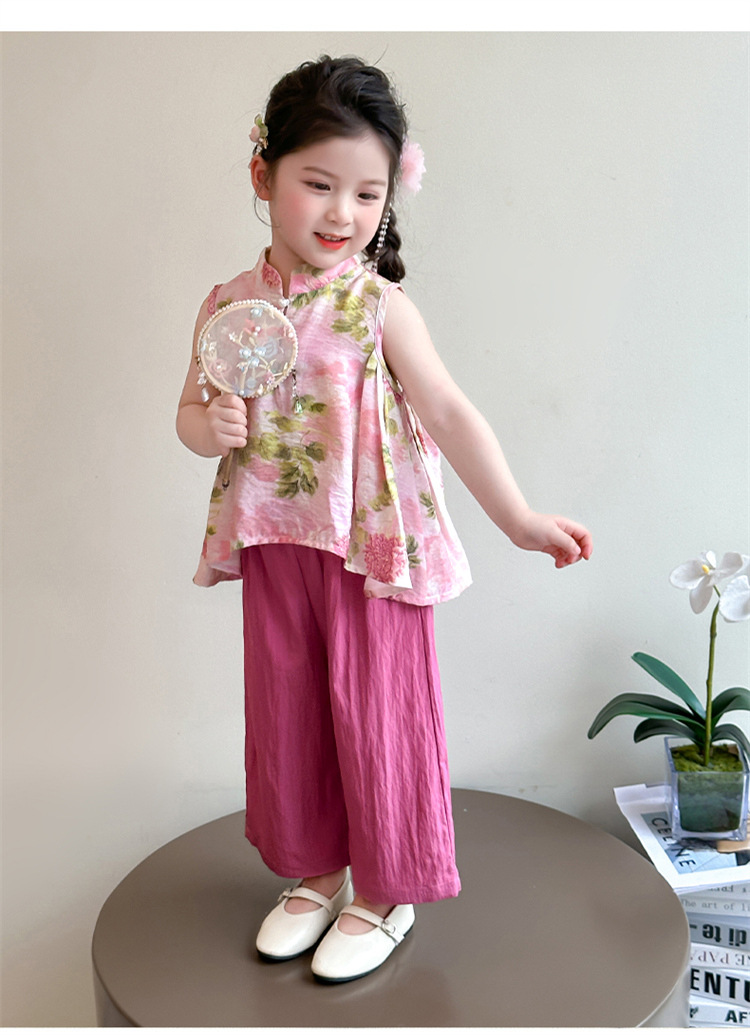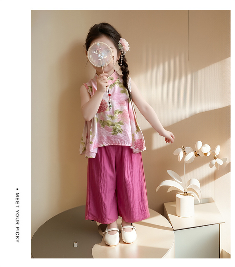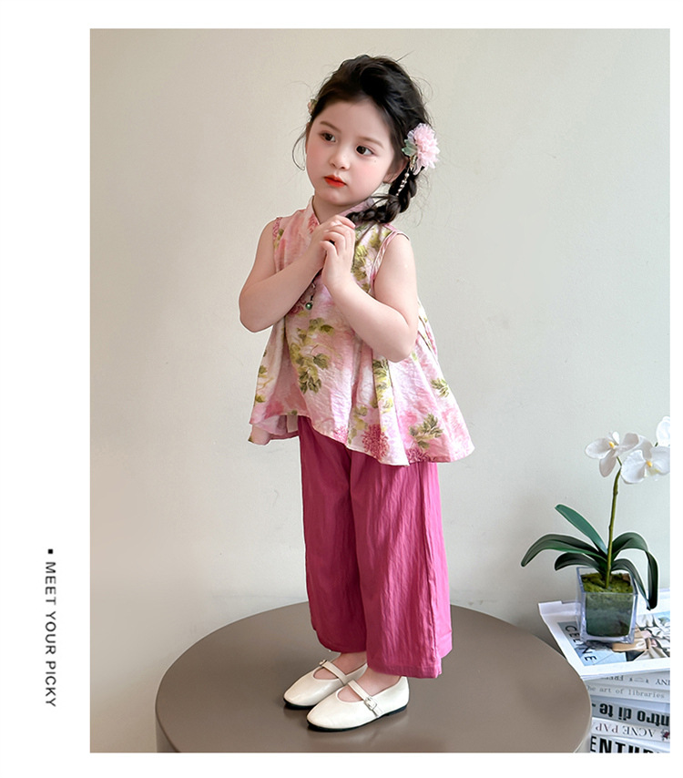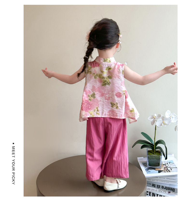 새로운 중국식 소녀의 투피스 여름 원피스 2025 새로운 서양식 어린이 꽃 세트 세트 소녀 넓은 다리 바지스토어 가기