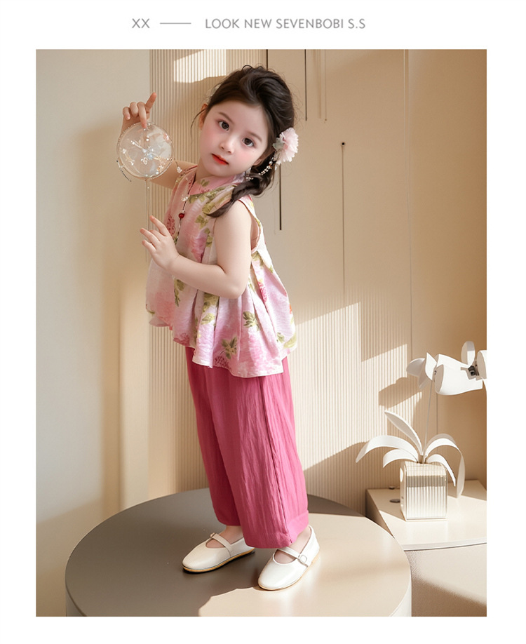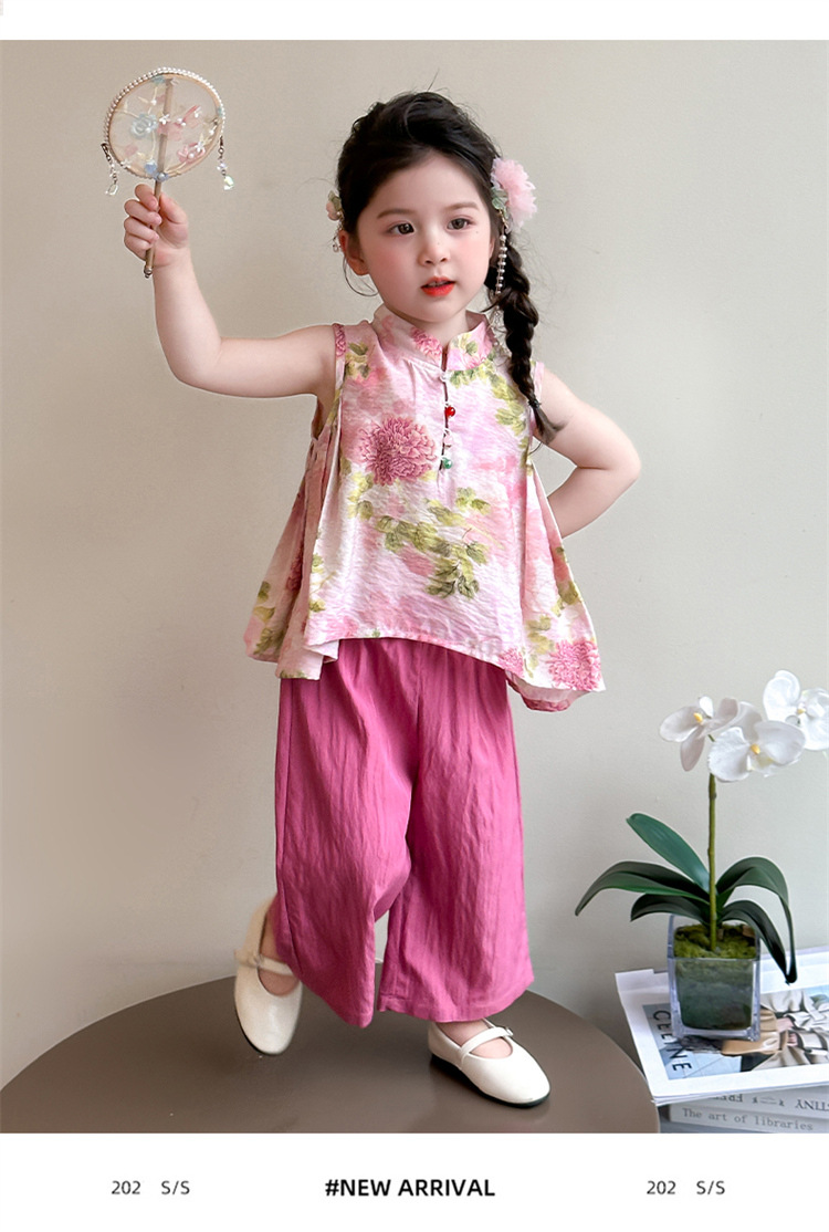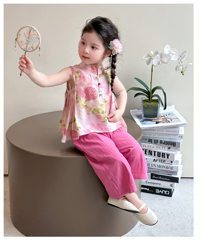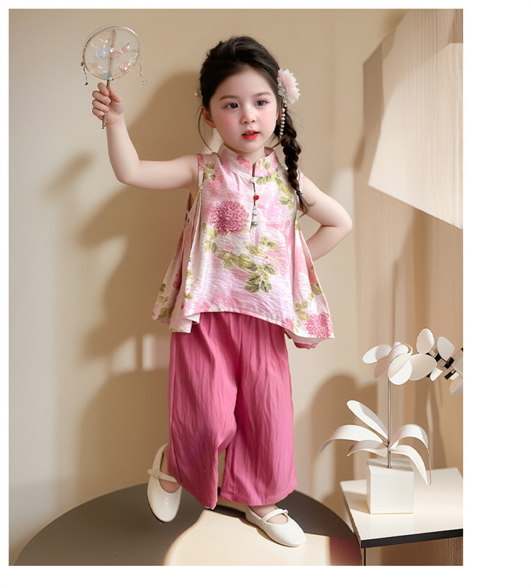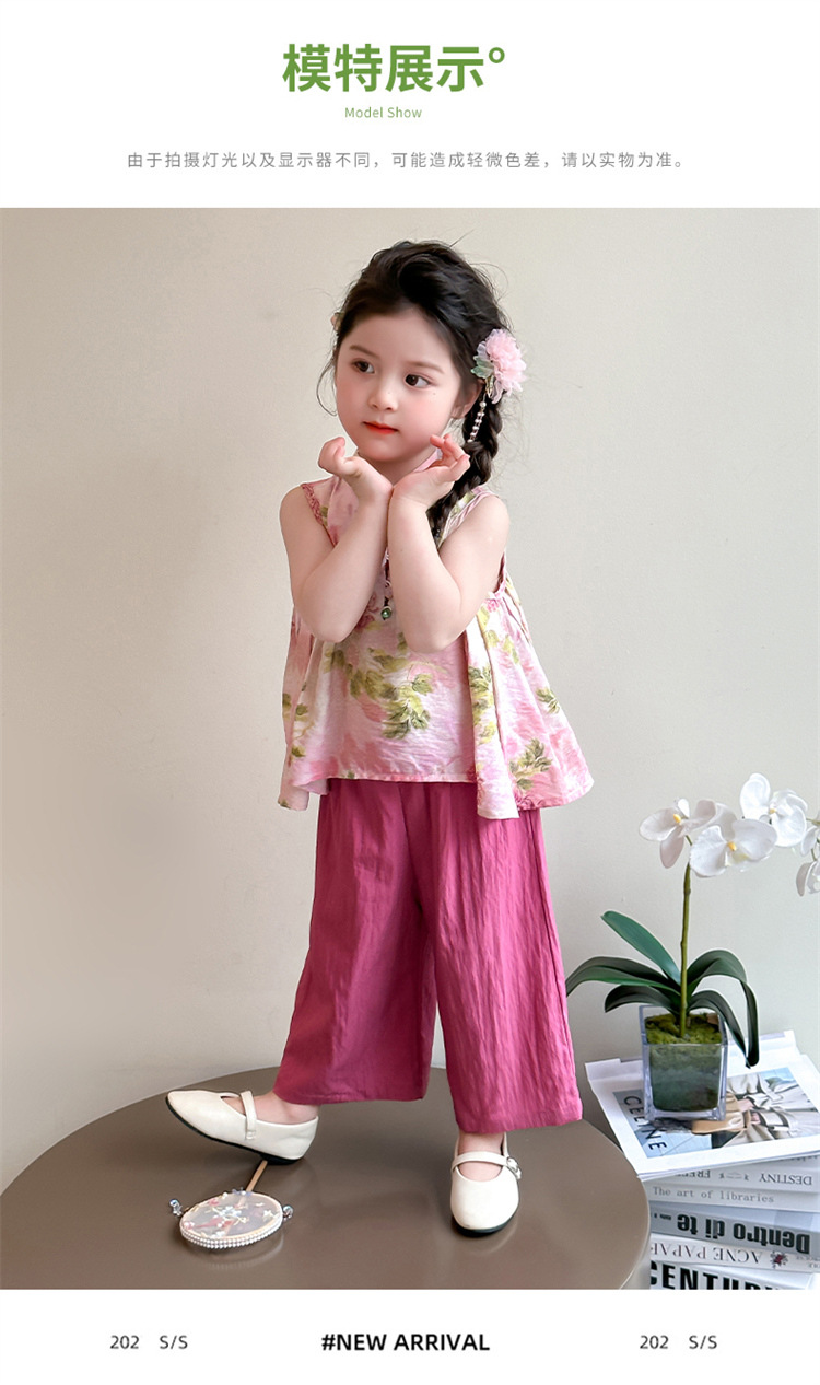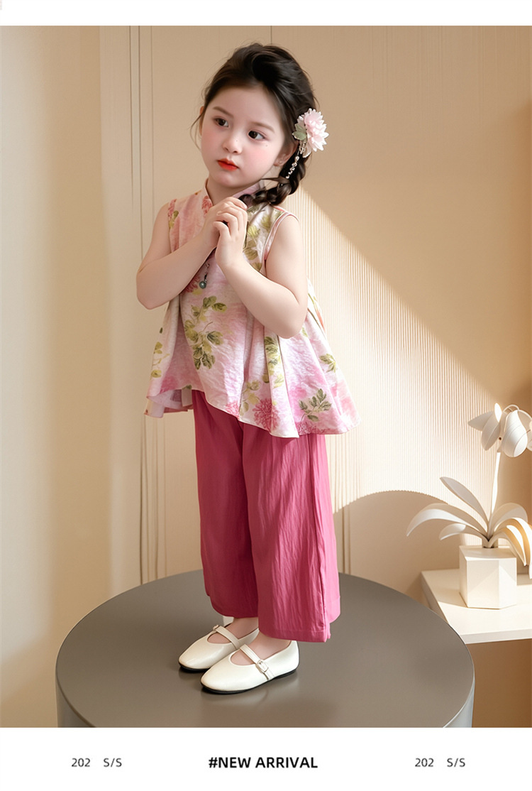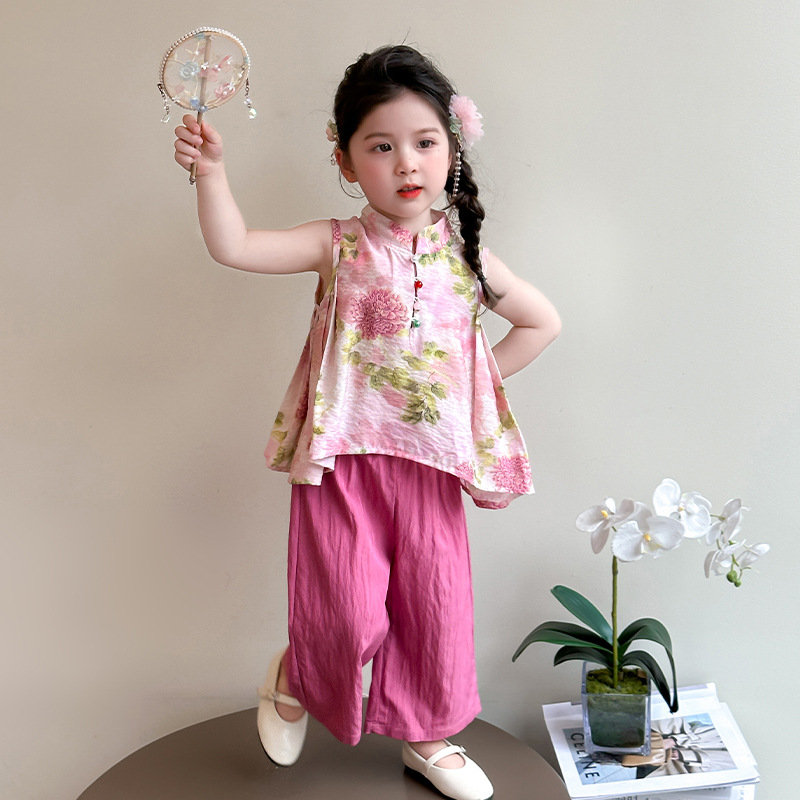 새로운 중국식 소녀의 투피스 여름 원피스 2025 새로운 서양식 어린이 꽃 세트 세트 소녀 넓은 다리 바지