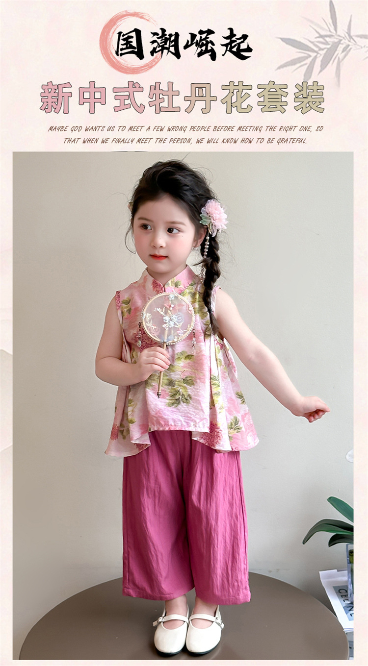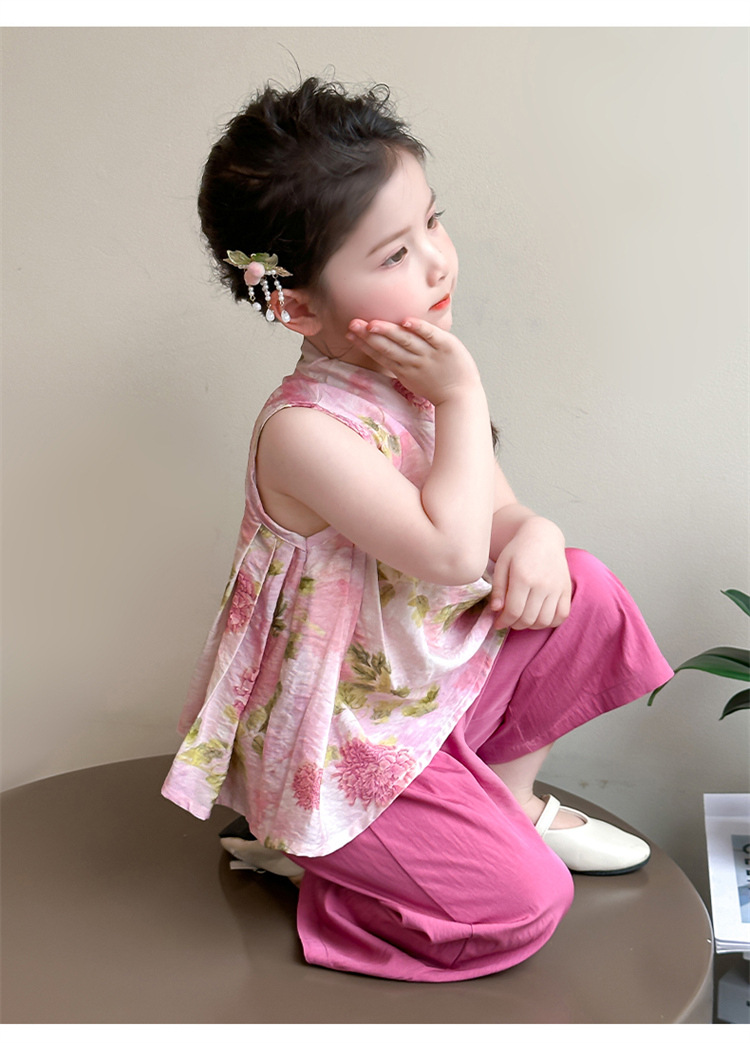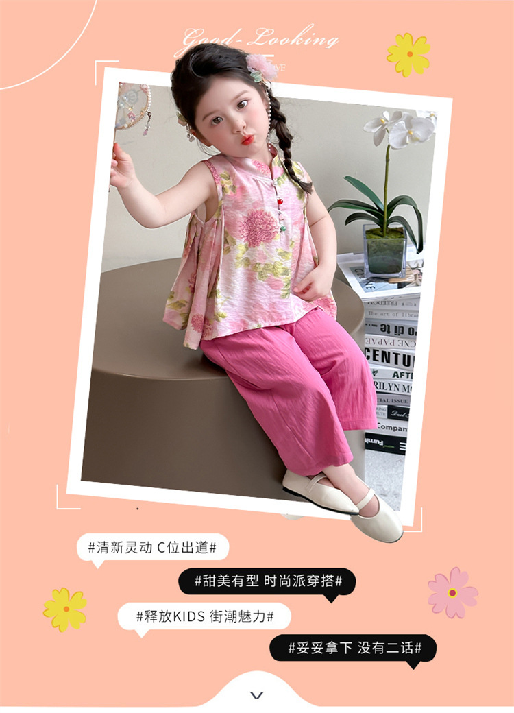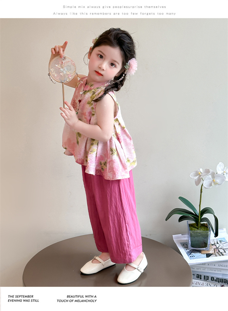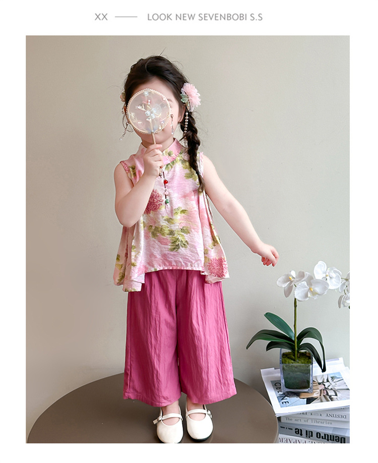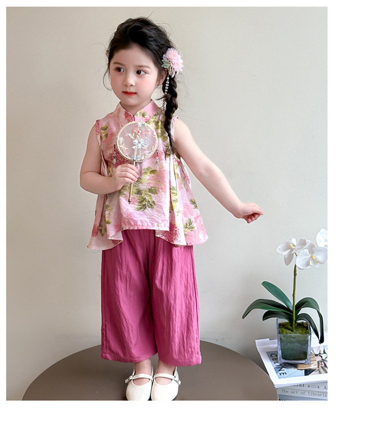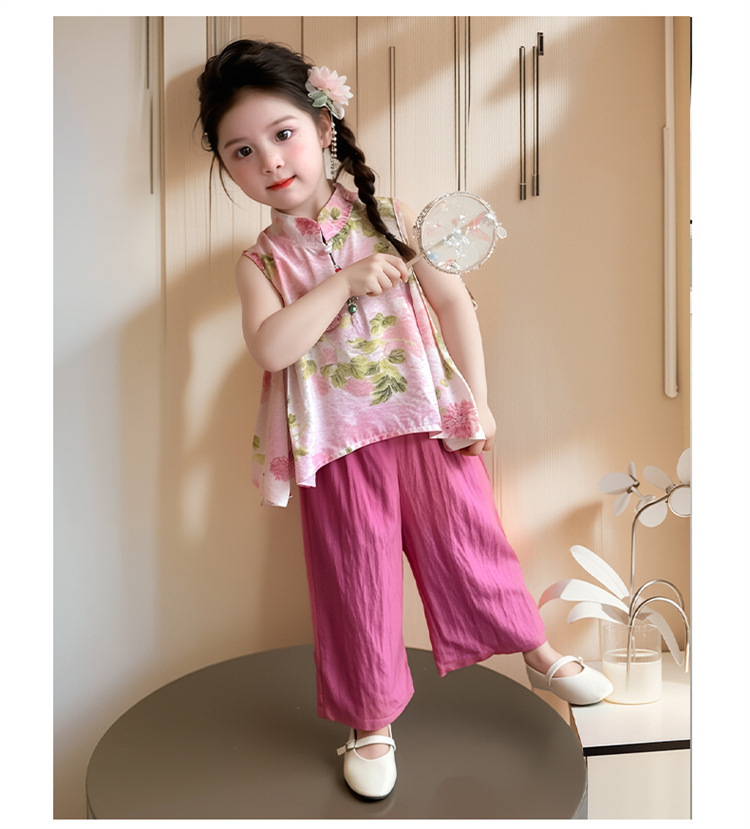 새로운 중국식 소녀의 투피스 여름 원피스 2025 새로운 서양식 어린이 꽃 세트 세트 소녀 넓은 다리 바지
