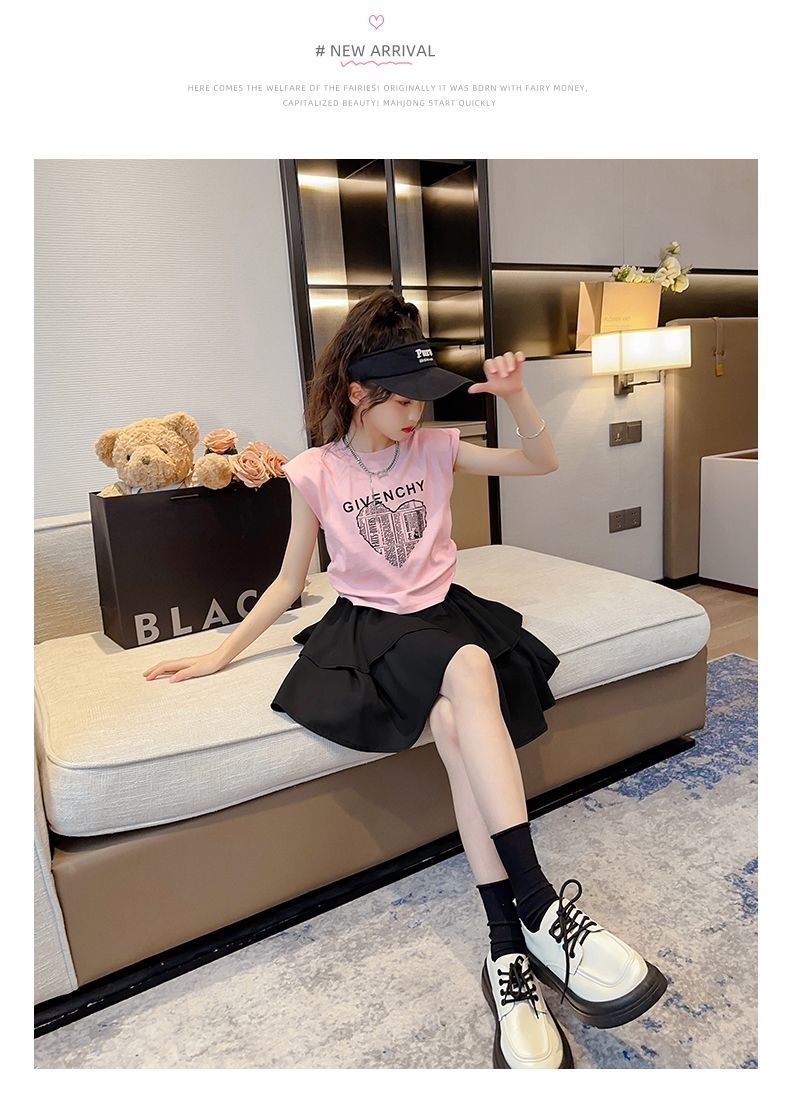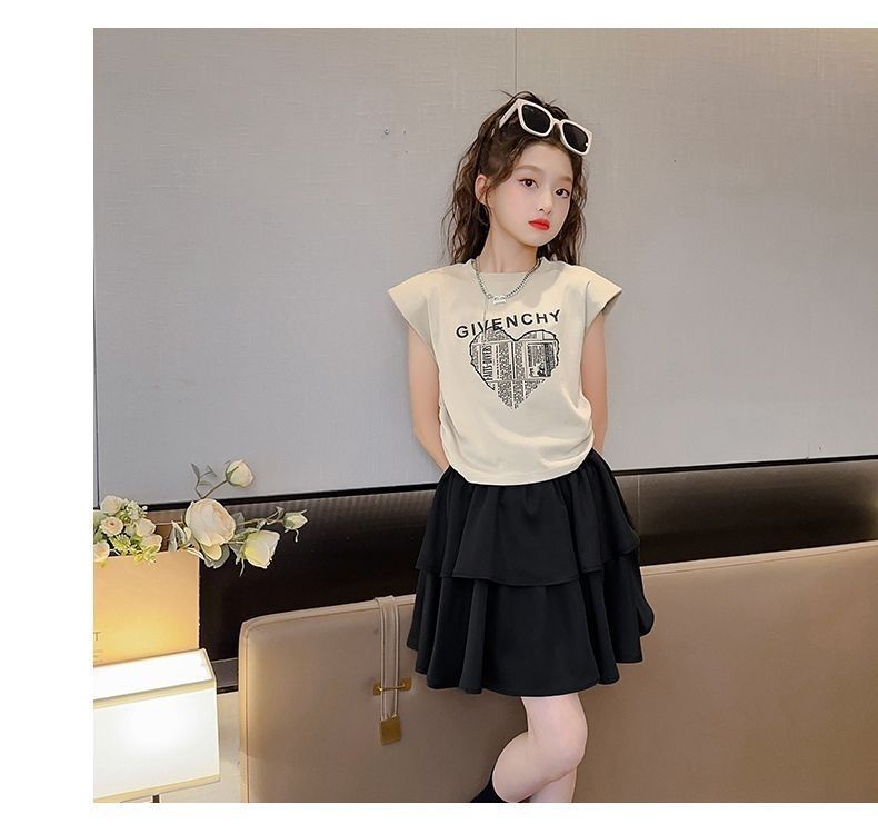 여아 정장 2025 새로운 여름 스타일 아동 패션 인터넷 연예인 반팔 티셔츠 중대형 여아 투피스 세트