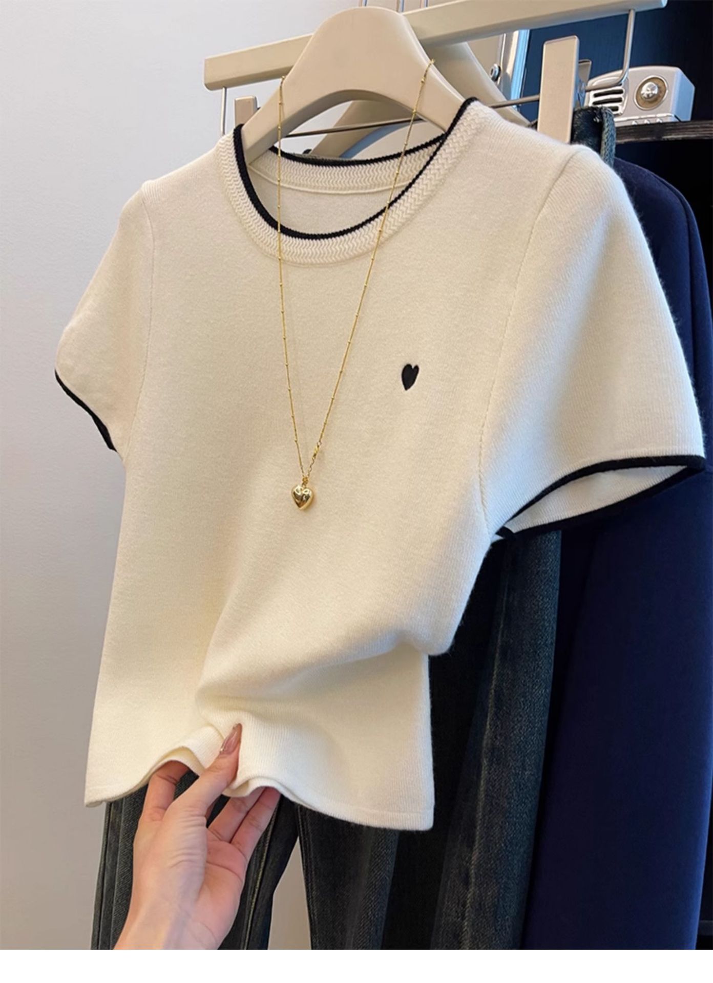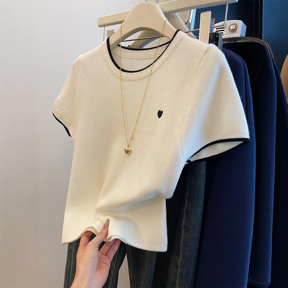 살구색 수 놓은 사랑 반팔 니트 스웨터 여성의 2025 년 여름 새 스타일 보팅 크루 넥 티셔츠 작은 남성