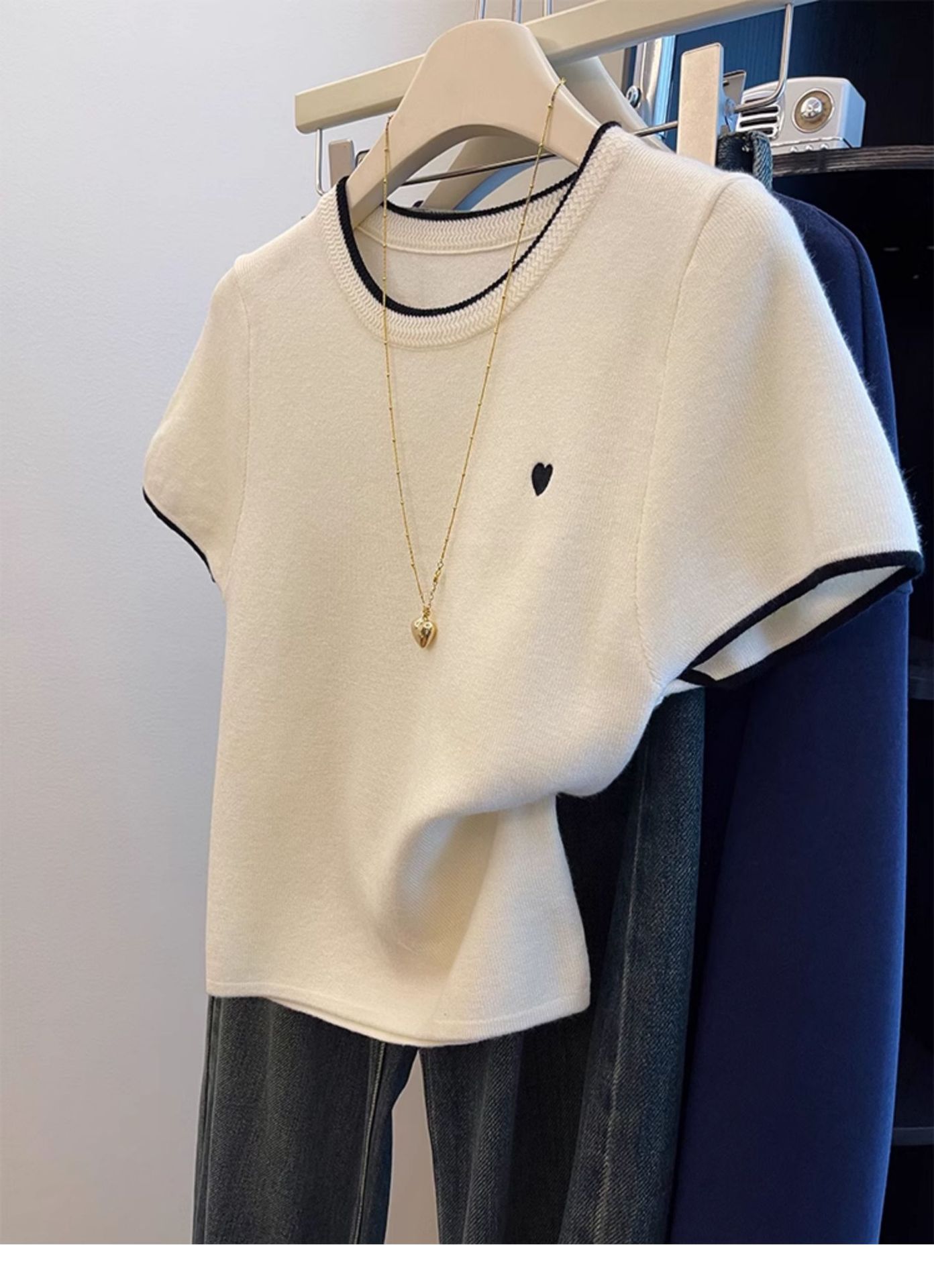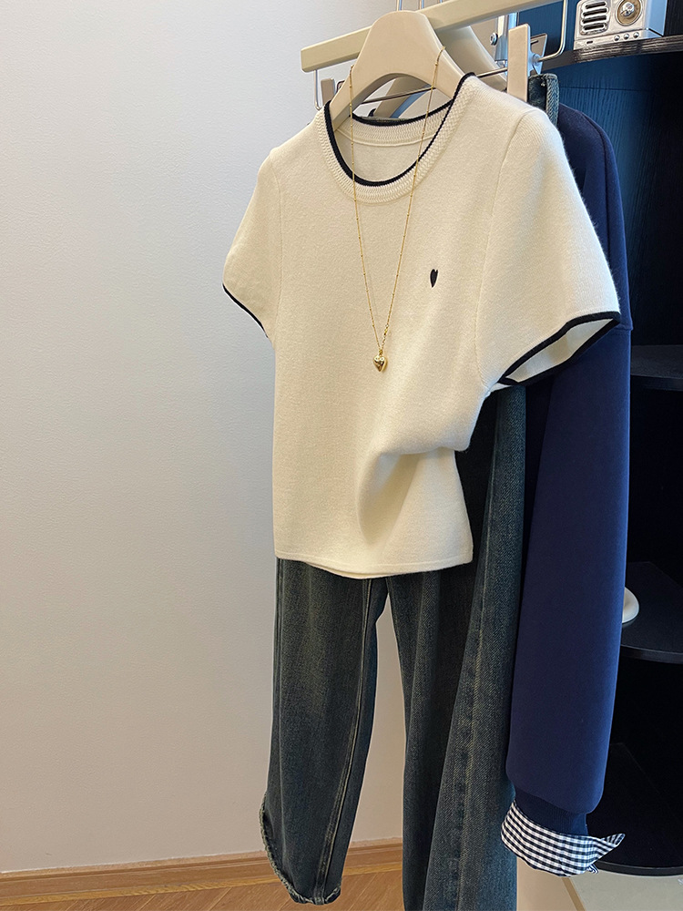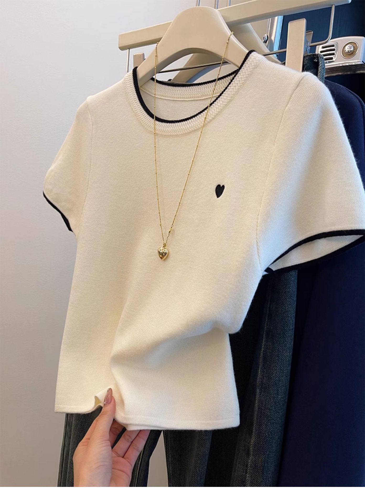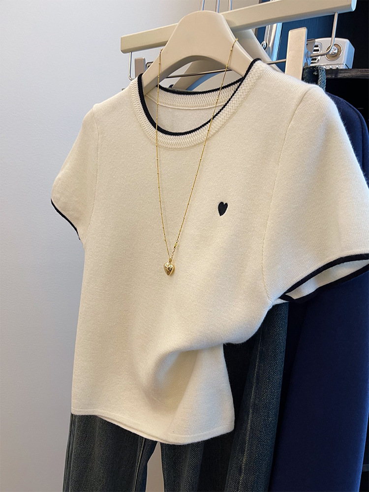 살구색 수 놓은 사랑 반팔 니트 스웨터 여성의 2025 년 여름 새 스타일 보팅 크루 넥 티셔츠 작은 남성스토어 가기