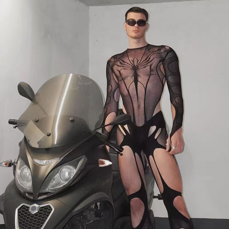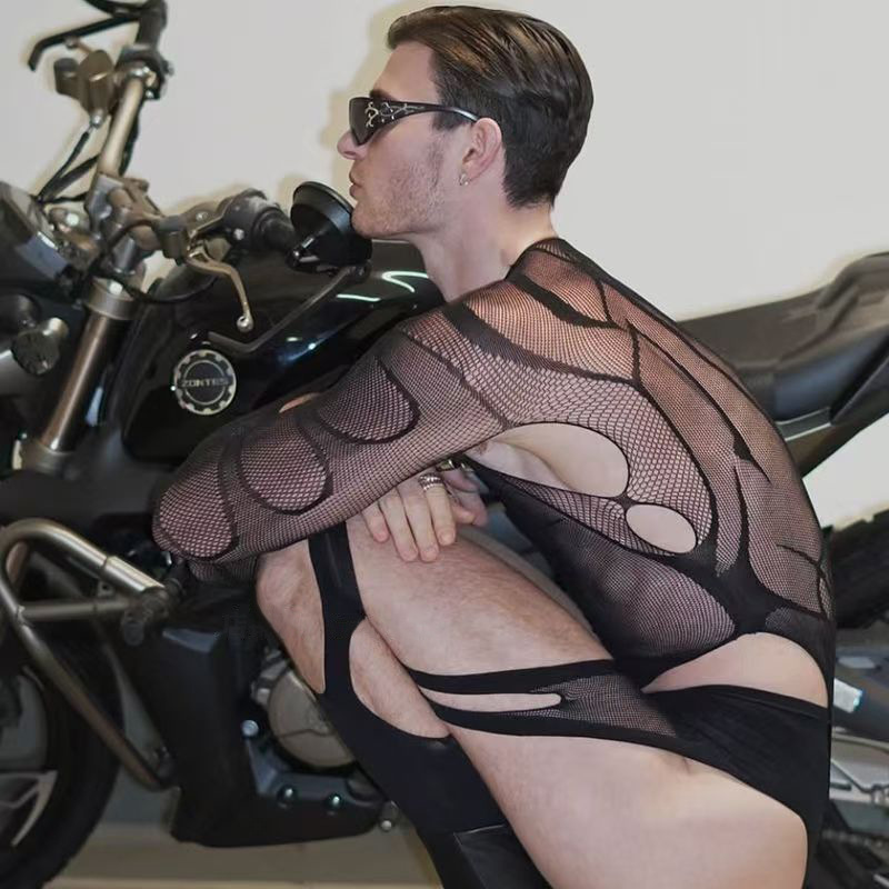 유럽과 미국 남성의 섹시한 망사 양말, 섹시한 속이 빈 점프수트 오픈 파일