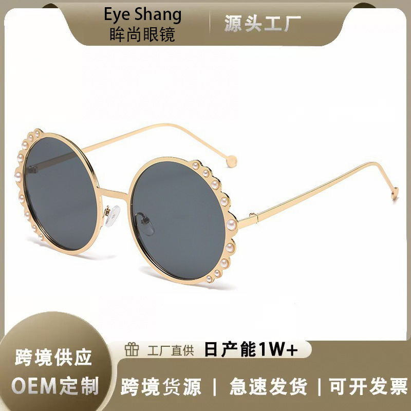 2025 국경 새로운 독특한 힙합 라운드 프레임 세트 진주 선글라스 여성 유럽과 미국의 꽃 모양 금속 선글라스
