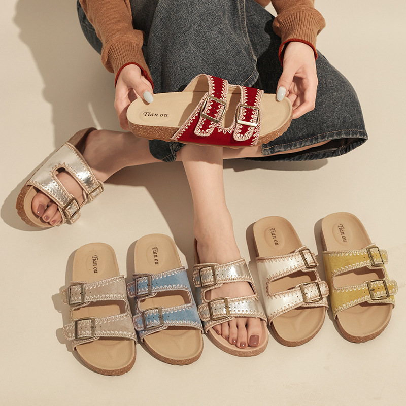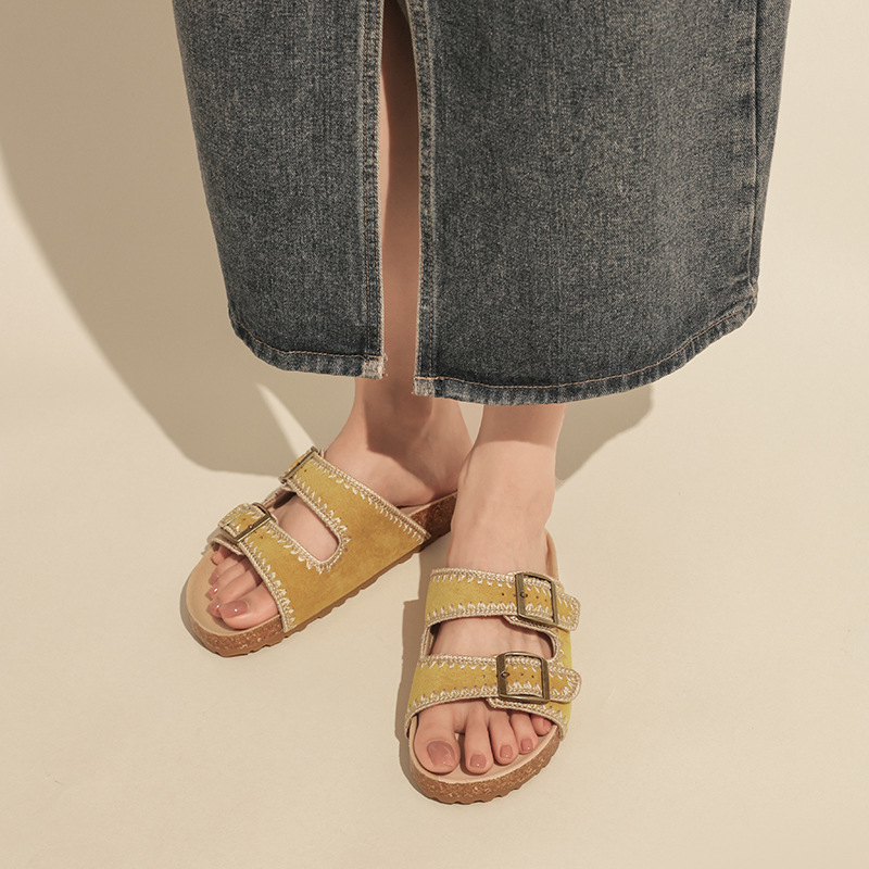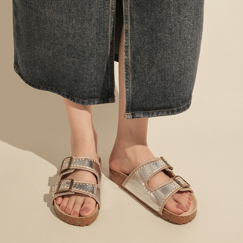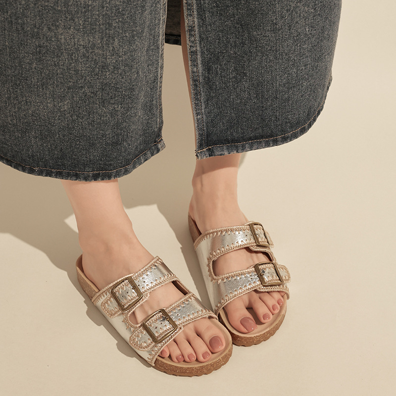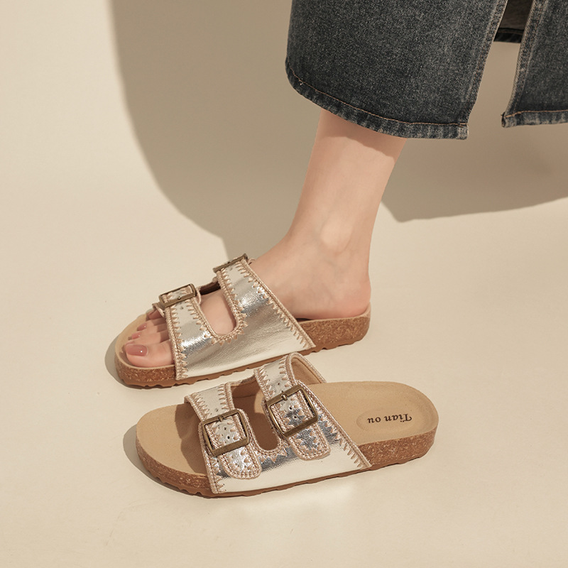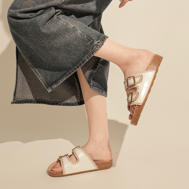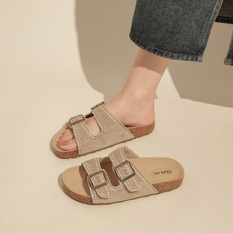 정품 가죽 두꺼운 바닥 슬리퍼 여성 여름 외부 착용 2025 새로운 Birkenstocks 스커트 캐주얼 비치 샌들