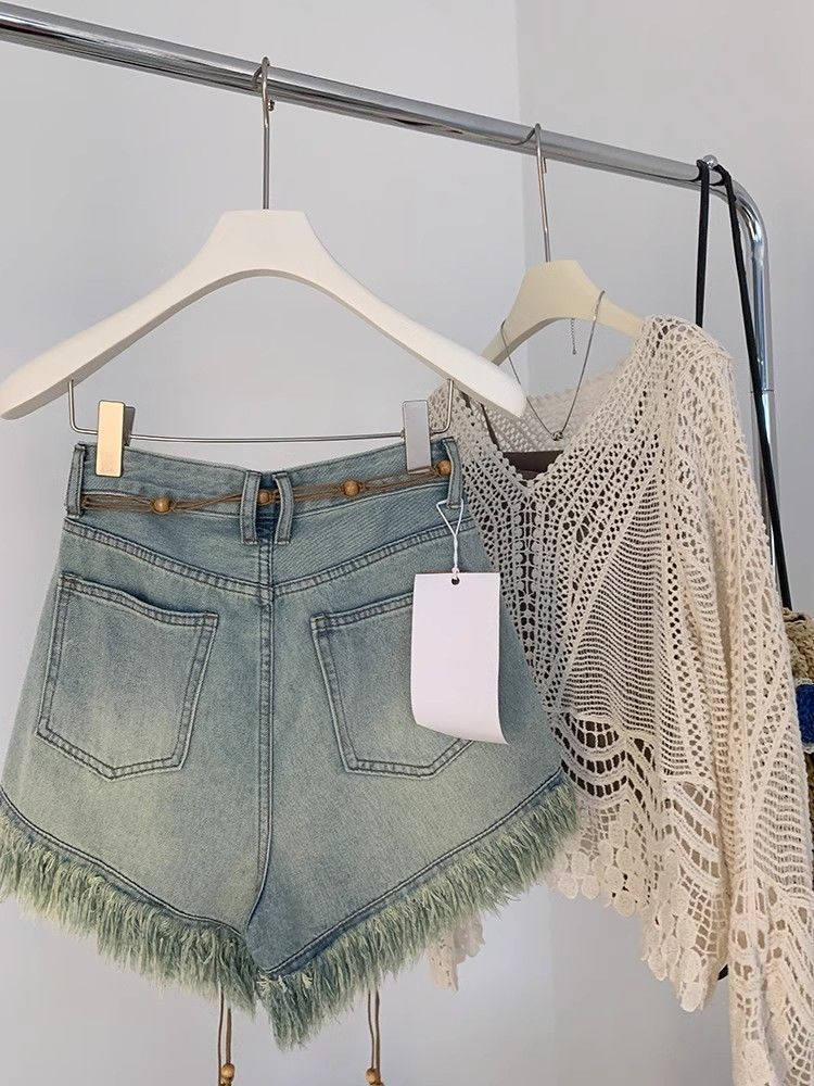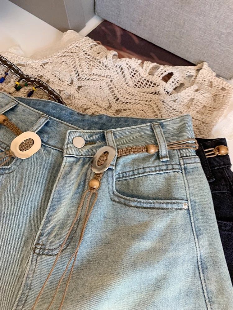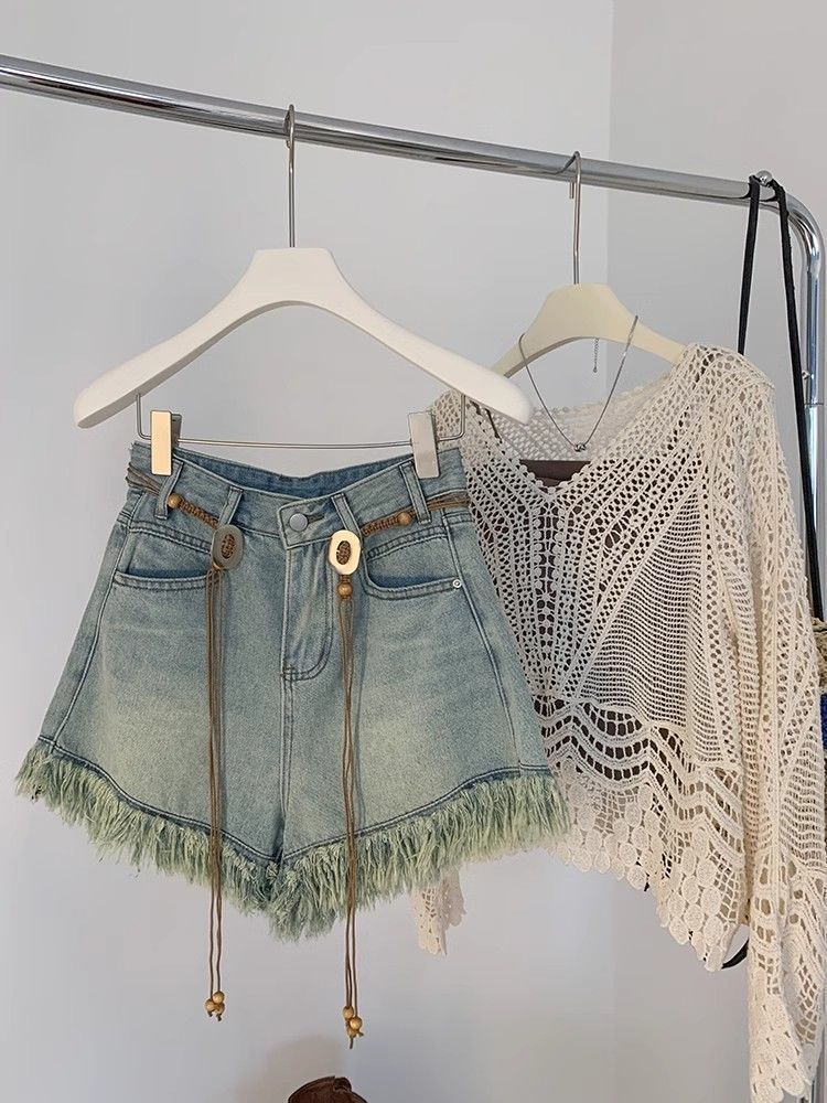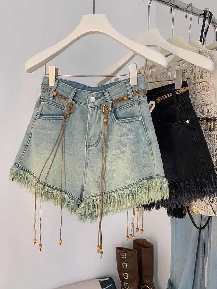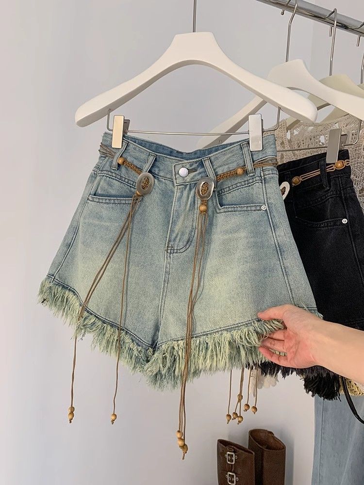 Tassel 데님 반바지 여성 여름 2025 새로운 디자인 감각 허리 체인 높은 허리 넓은 다리 핫 바지스토어 가기