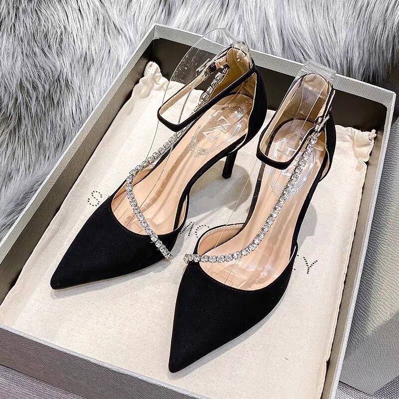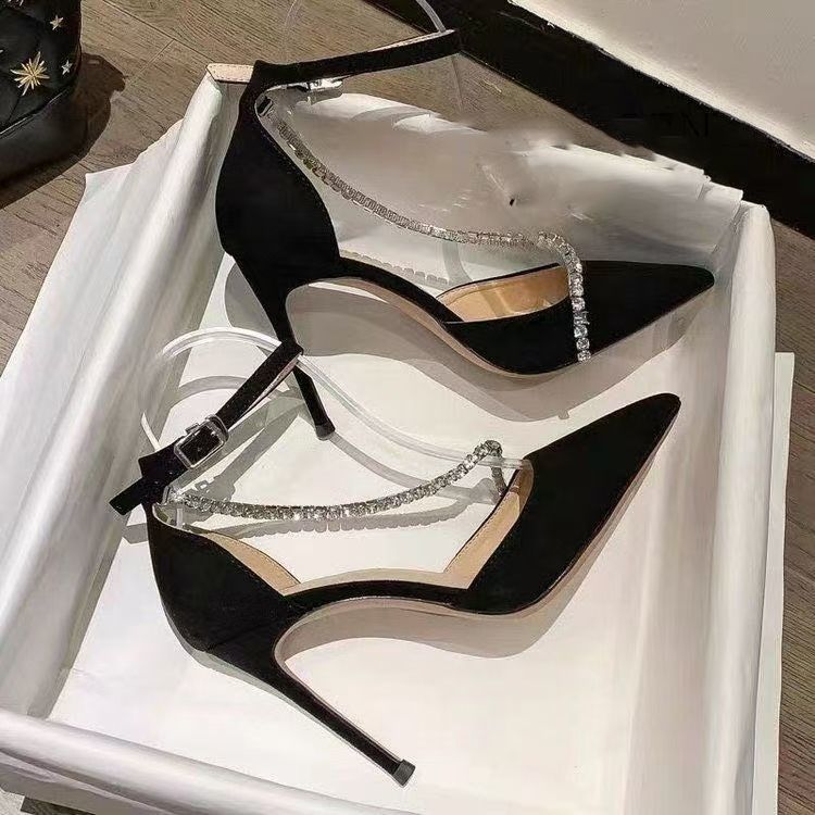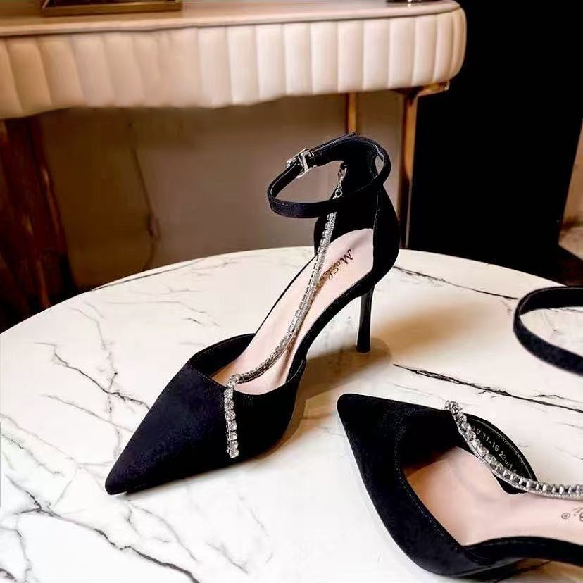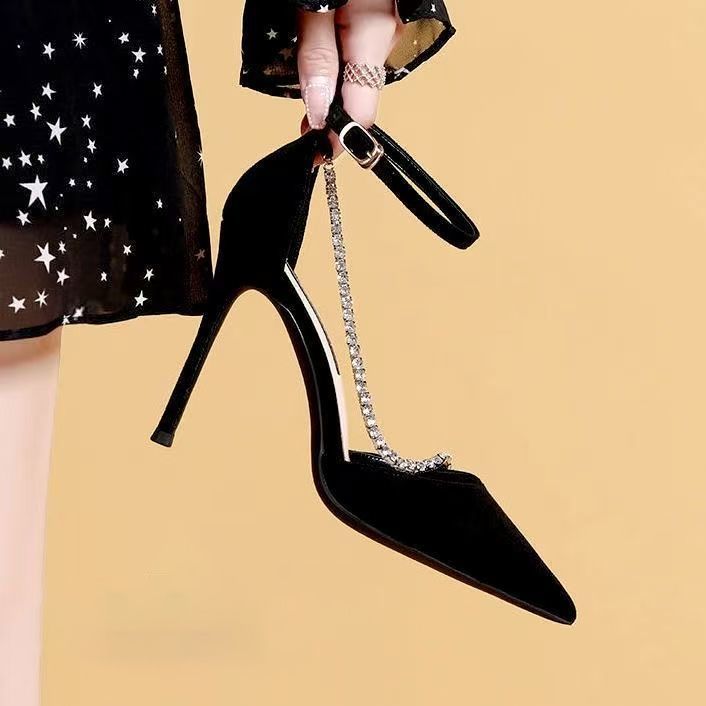2025 신상 여성용 포인티드 토 스틸레토 토 스웨이드 중공 여성화 라인스톤 원라인 하이힐 우아한 슈즈스토어 가기