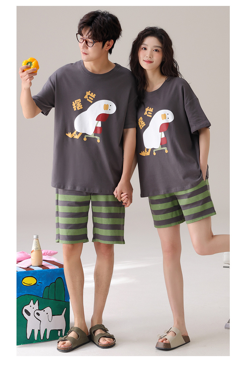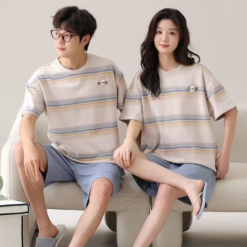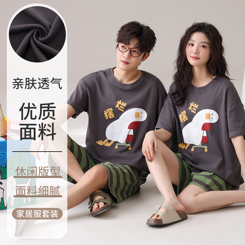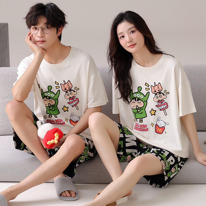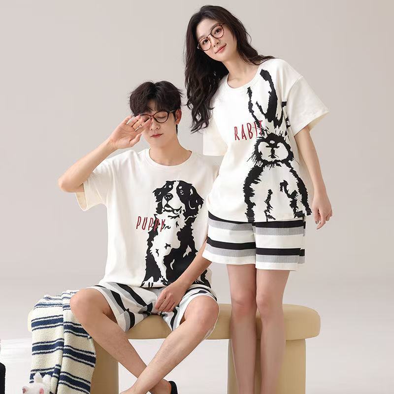커플 잠옷 여름 100% 면 여성 한국 스타일 정장 반팔 반바지 캐주얼 만화 귀여운 남성 가정복
