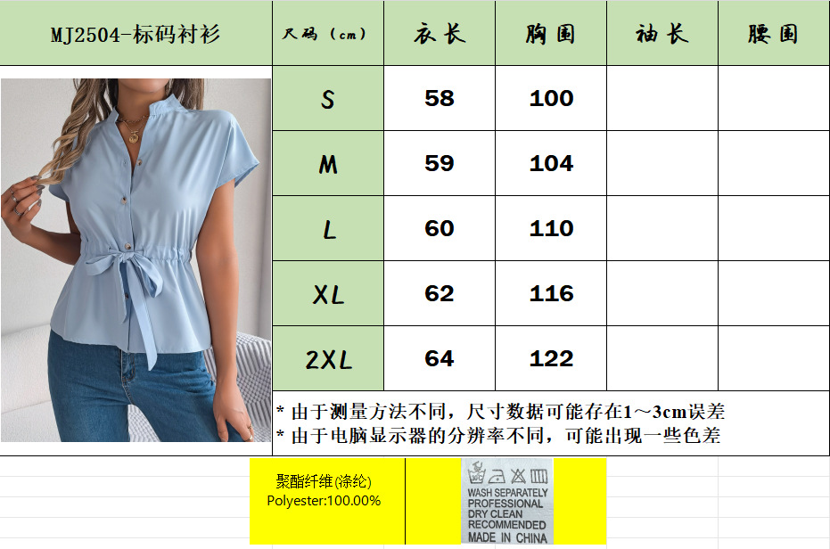2026 하지아마존 크로스보더 셔츠 반팔 쉬폰 브이넥 버튼 셔츠 우아한 벨트 스타일 여성복스토어 가기