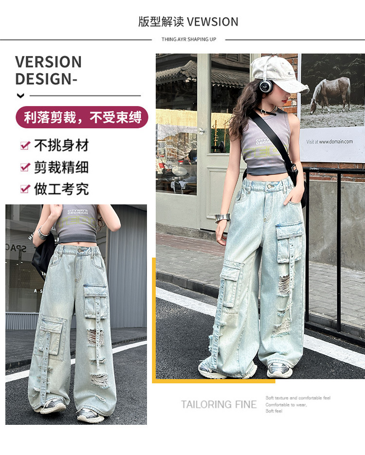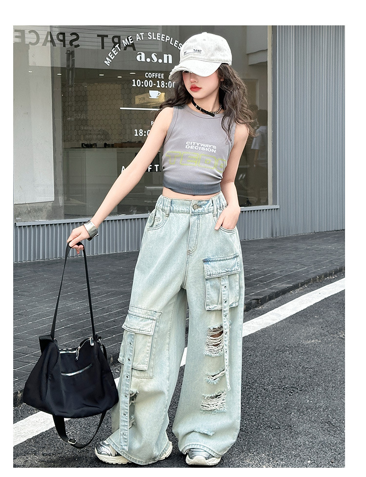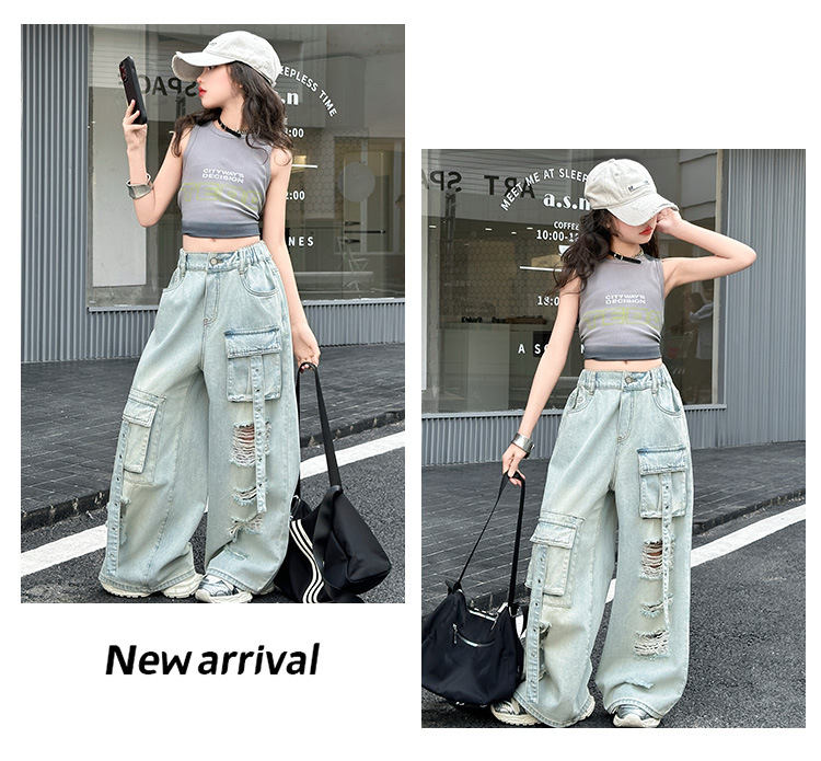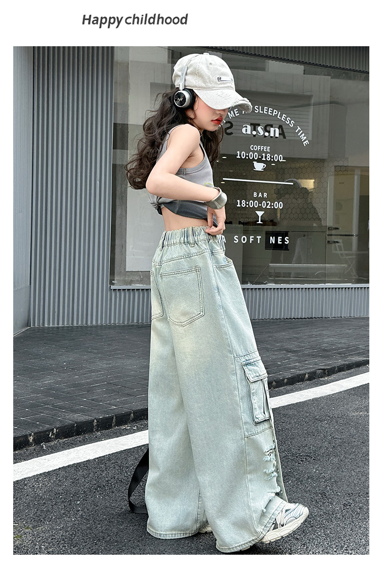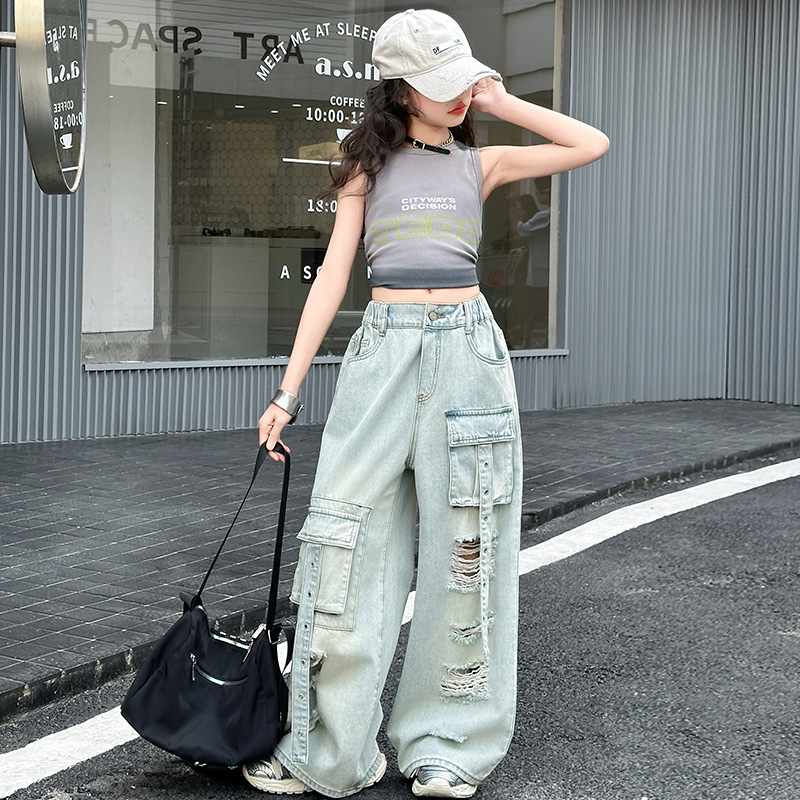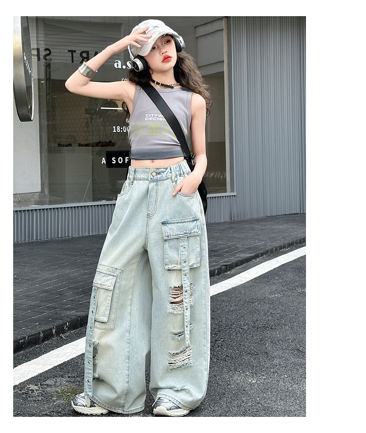 소녀 크록 팬츠 얇은 여름 2025 새로운 스타일 중대형 어린이 패셔널 리핑 청바지 어린이 거리 댄스 와이드 레그 팬츠
