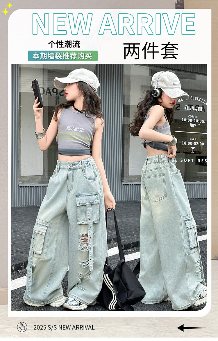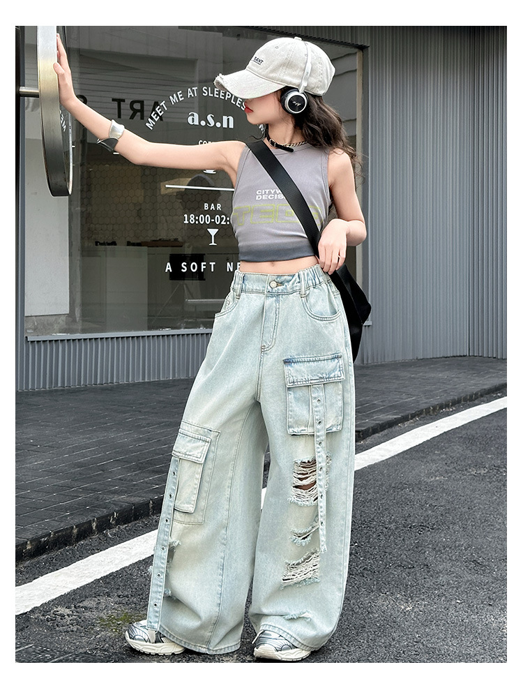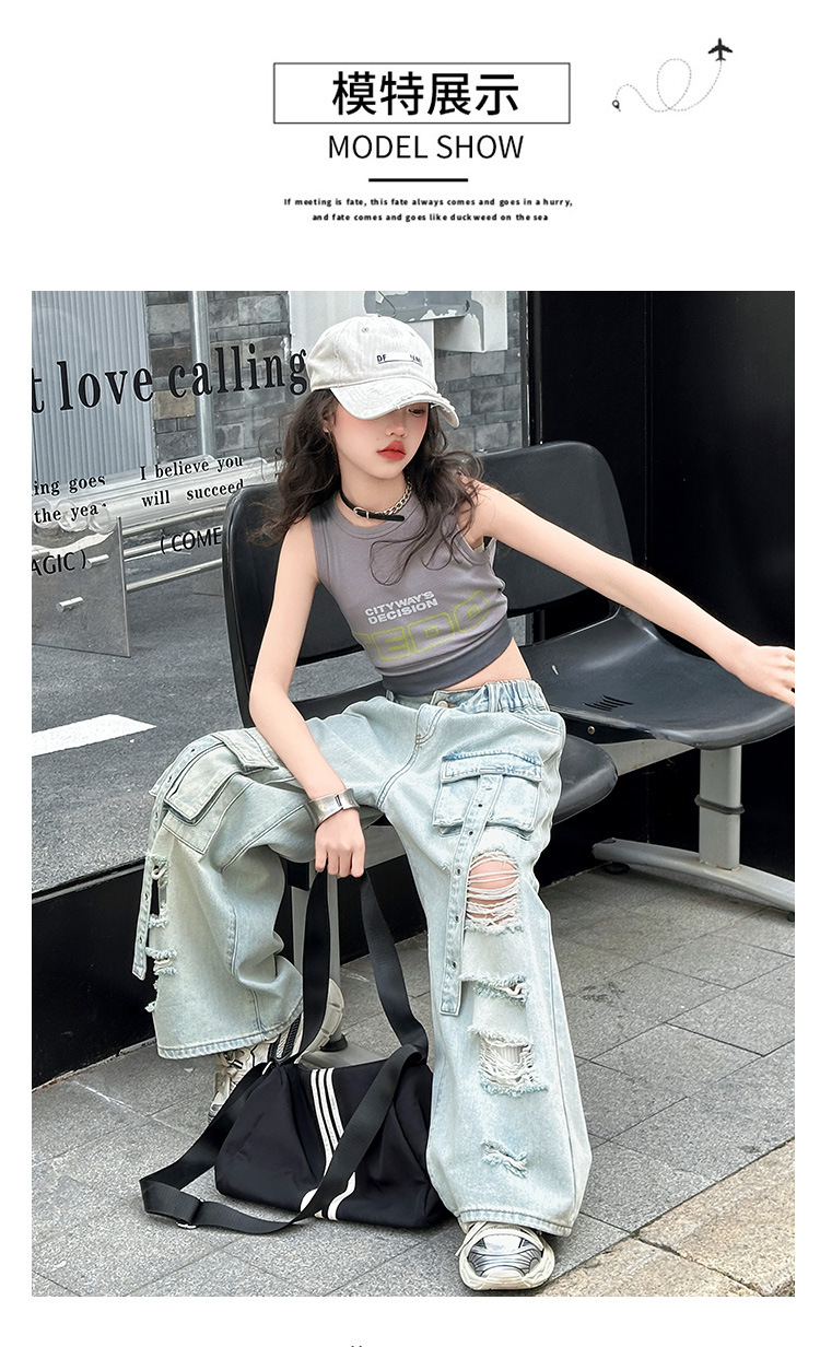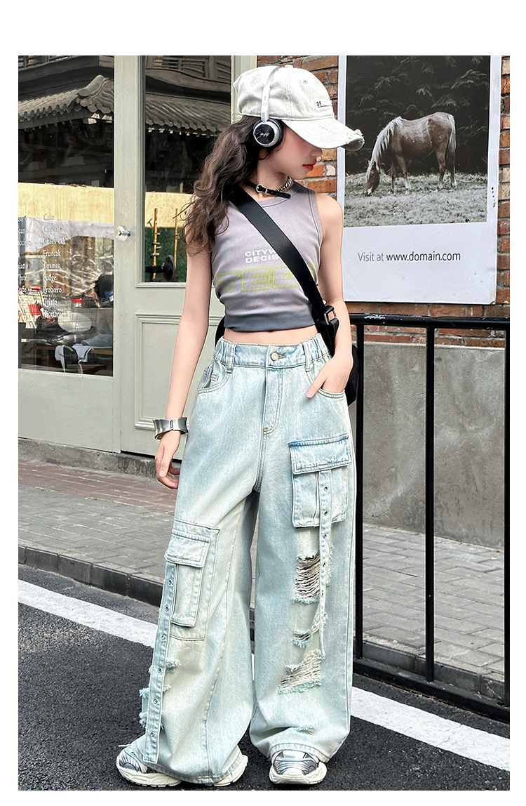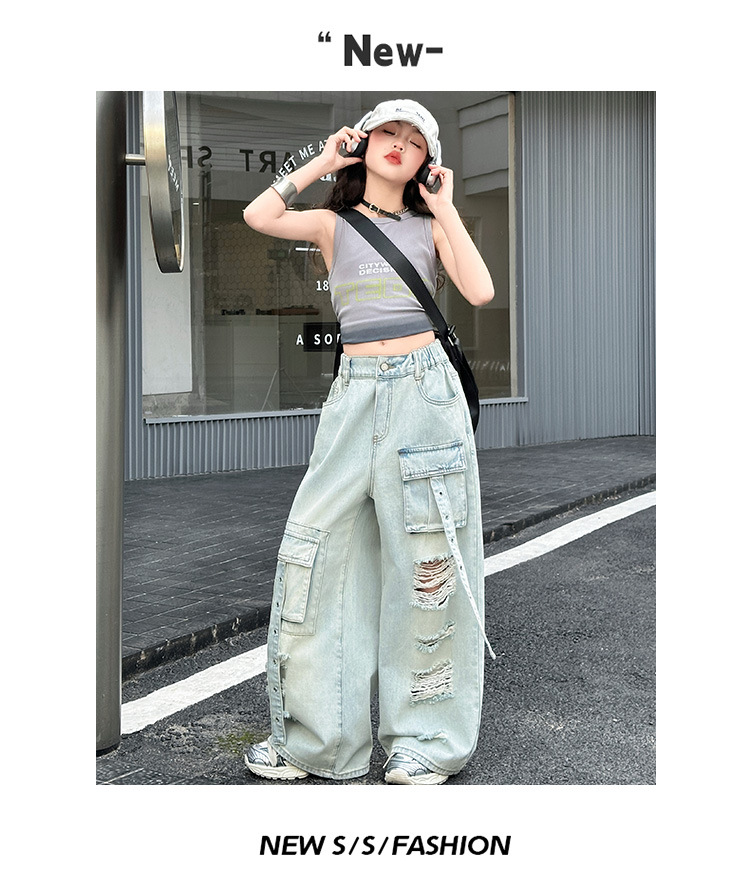 소녀 크록 팬츠 얇은 여름 2025 새로운 스타일 중대형 어린이 패셔널 리핑 청바지 어린이 거리 댄스 와이드 레그 팬츠