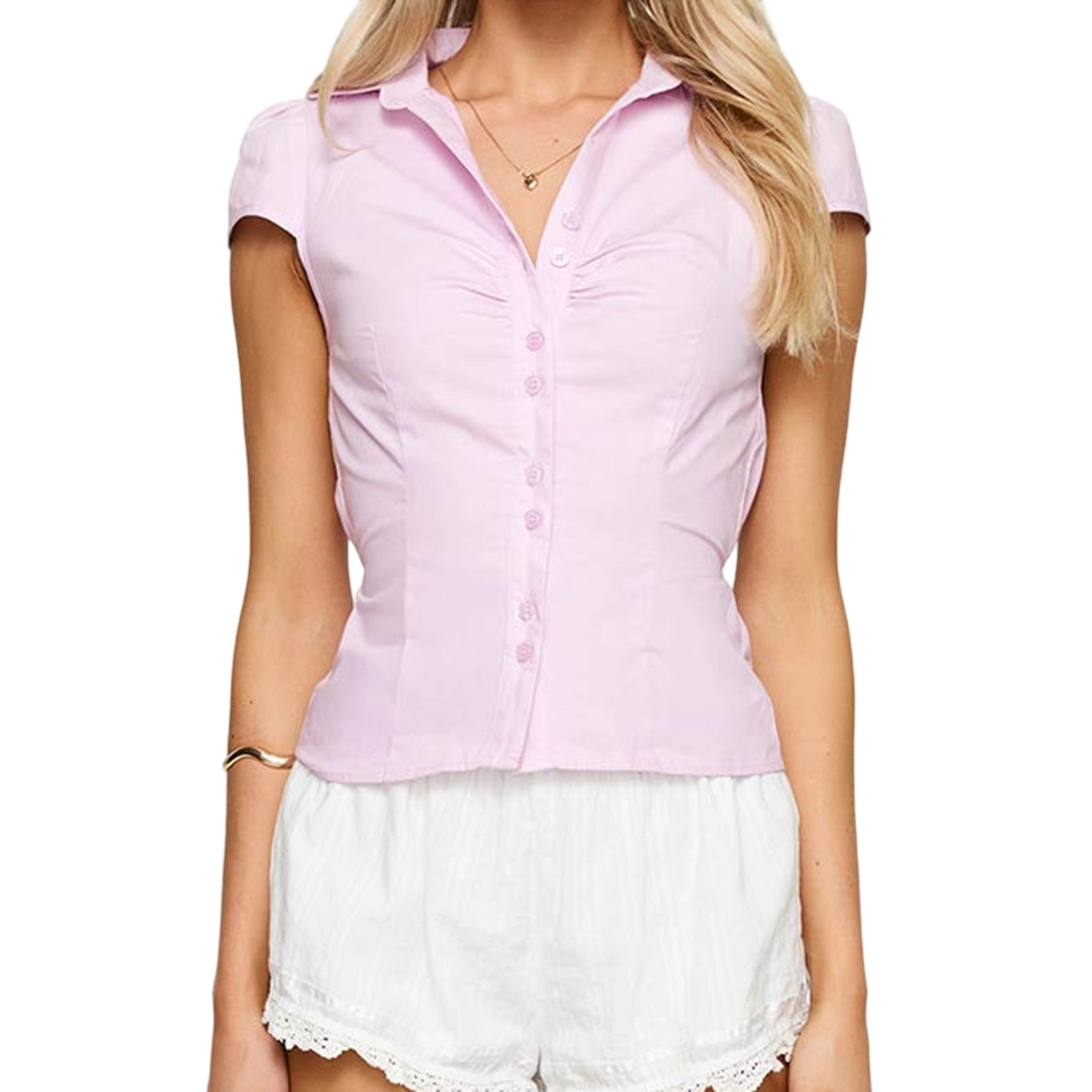 2025 AliExpress 신상 여름 여성용 작은 주름 캐주얼 버튼 솔리드 컬러 심플 백 스트랩 반소매 셔츠