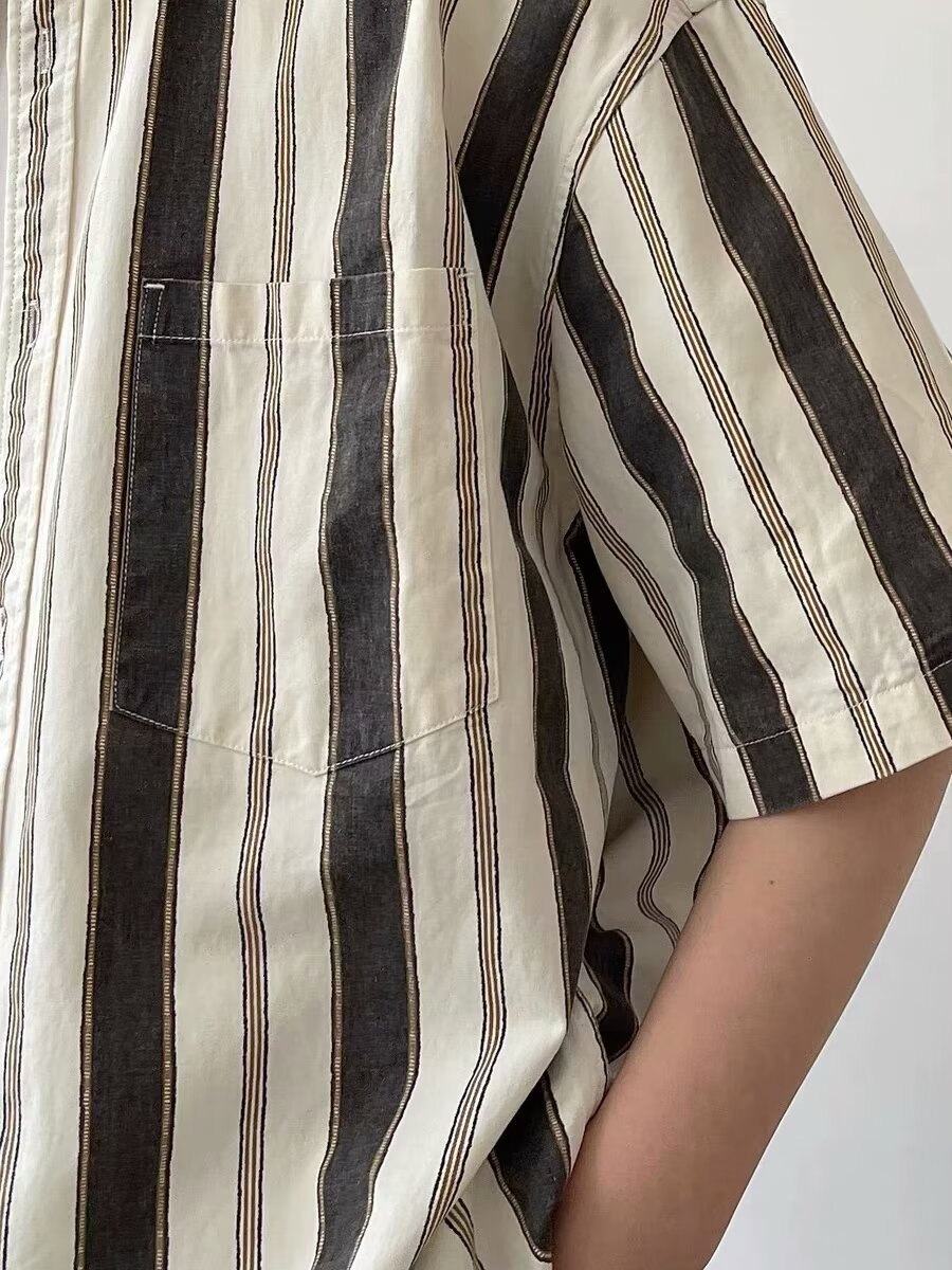 캐주얼 패션 2025 여름 새로운 일본 스트리트 패션 틈새 느슨한 캐주얼 스트라이프 반팔 셔츠스토어 가기
