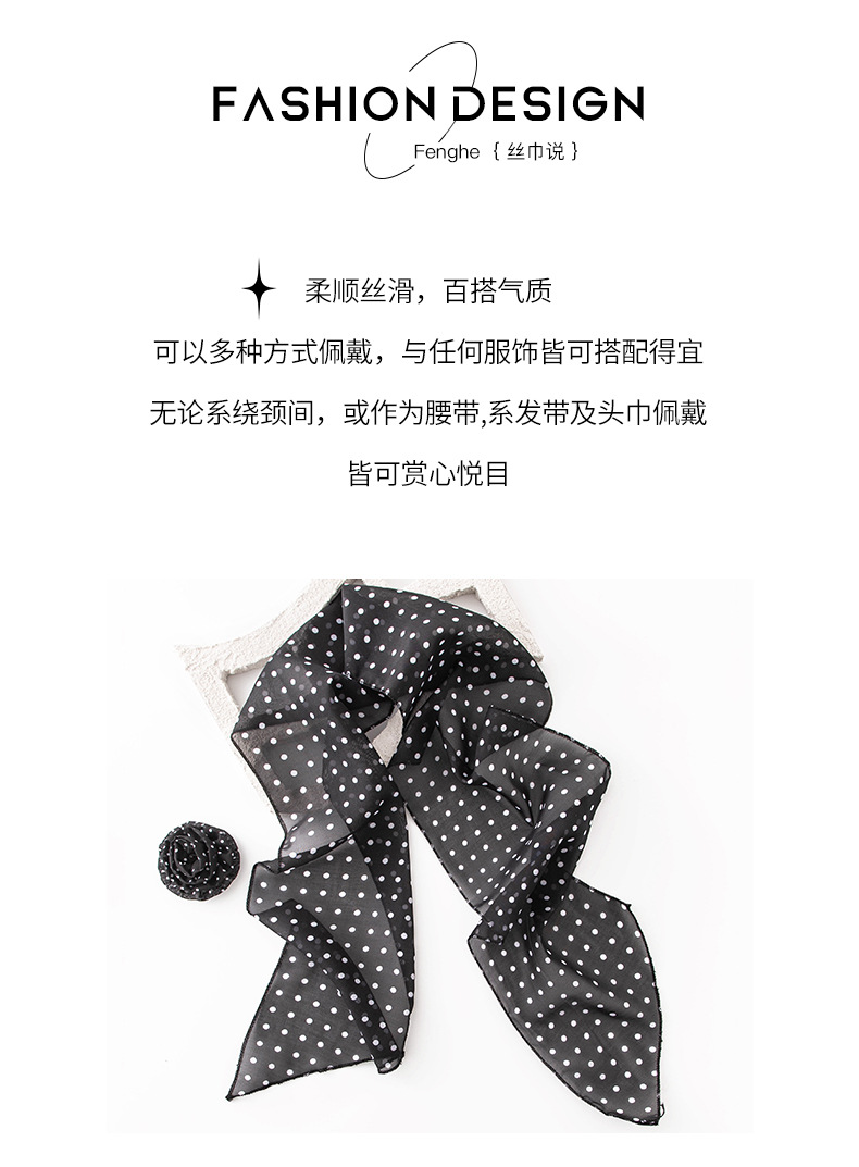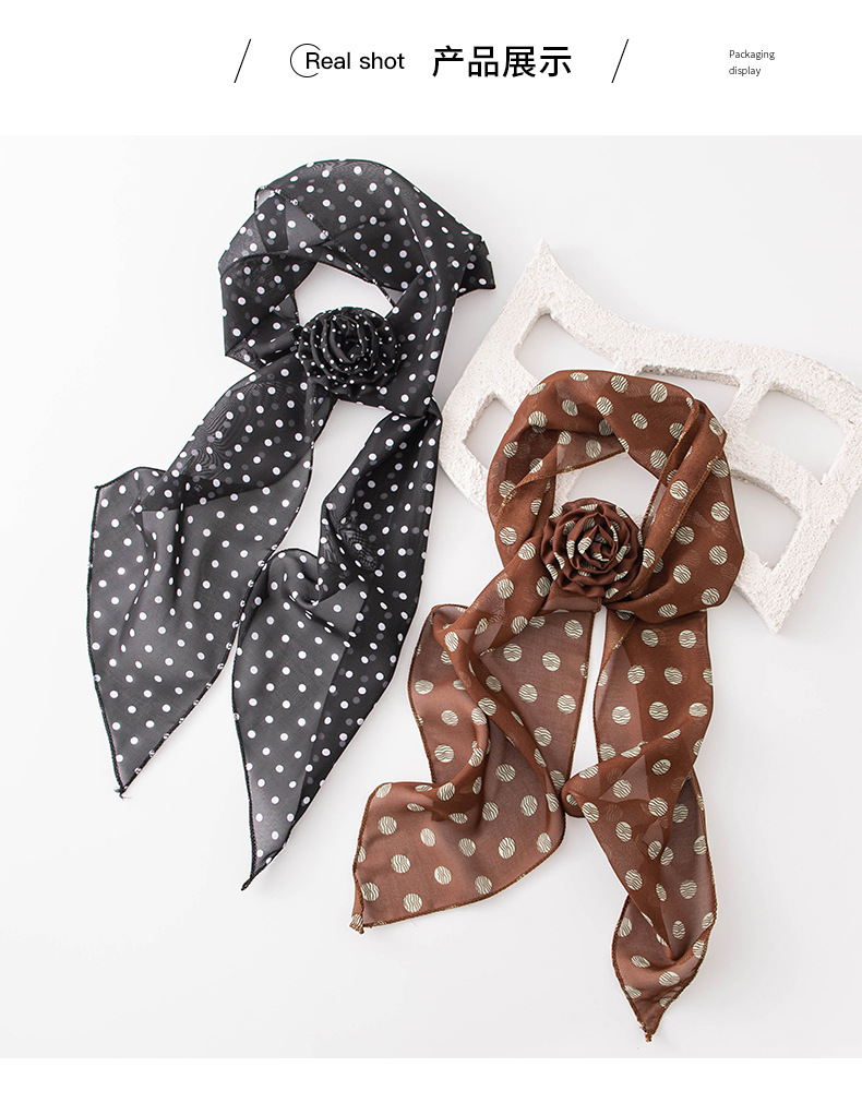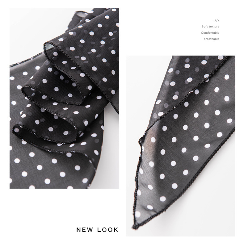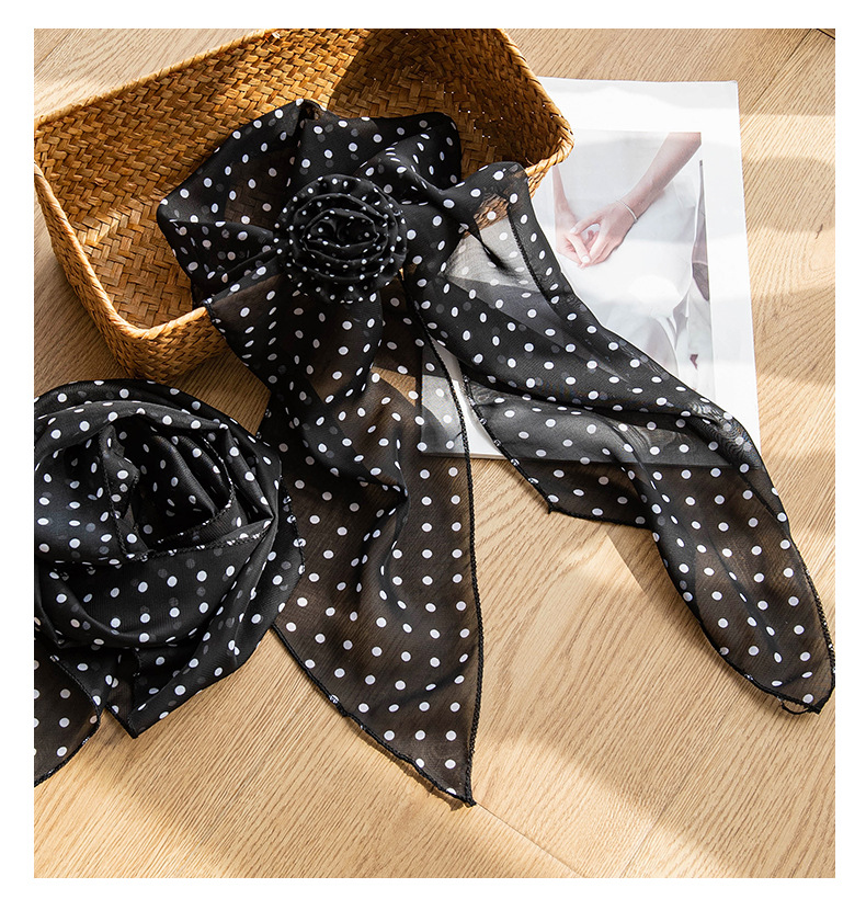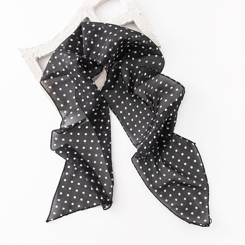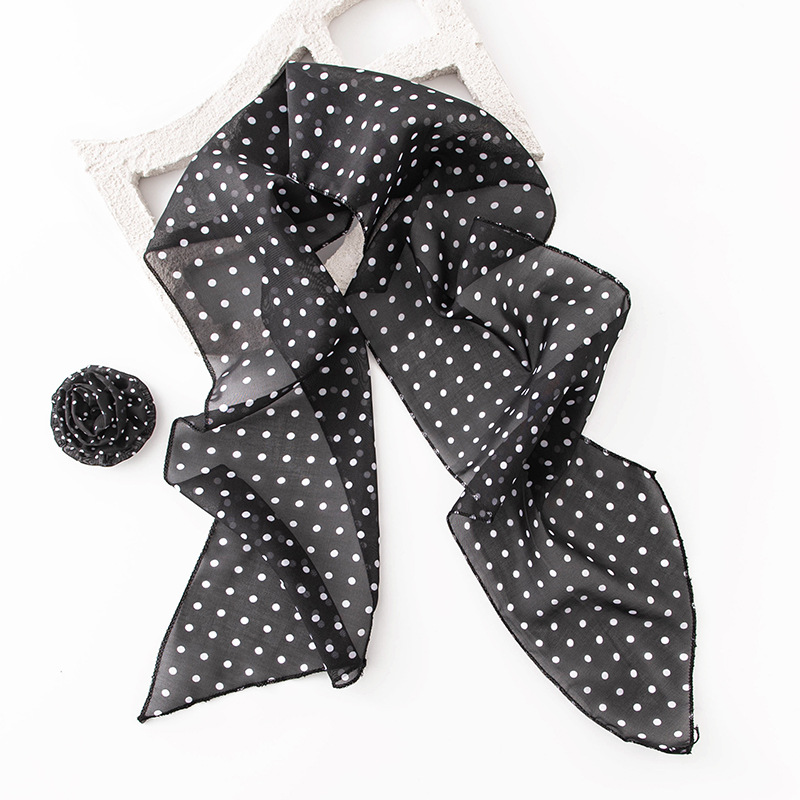 한국 스타일의 분위기 있는 블랙 물방울 무늬 머리띠 스카프, 고급스러운 롱 스카프, 얇고 긴 스카프, 목에 묶는 스카프