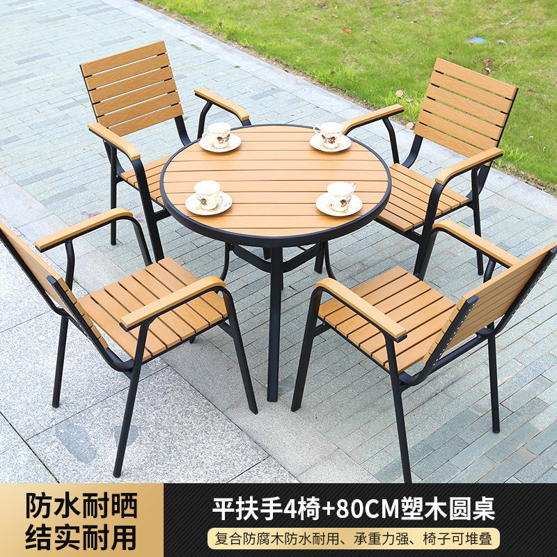 • 플랫 팔걸이 의자 4개 + 80cm 플라스틱 목재 원형 테이블