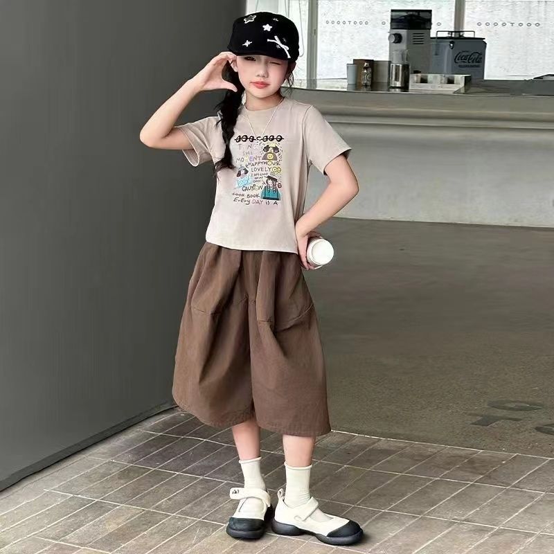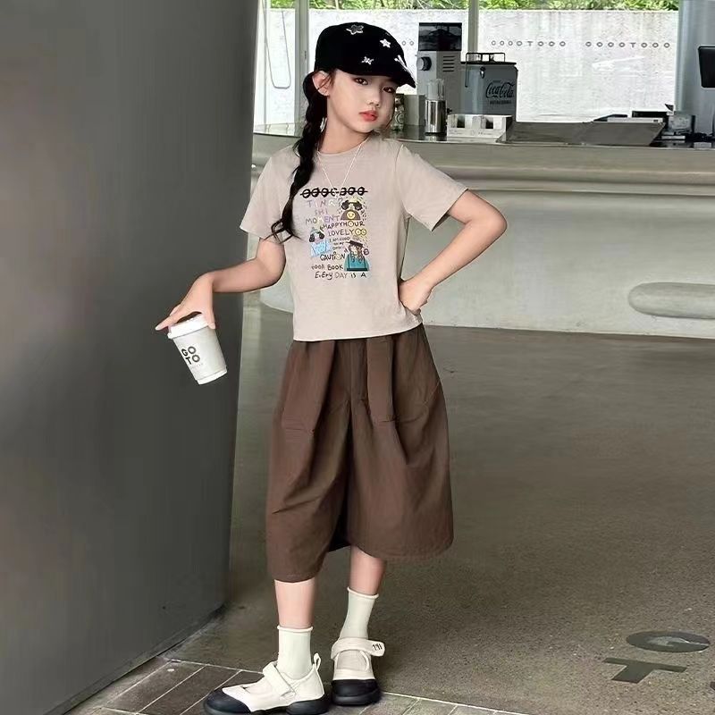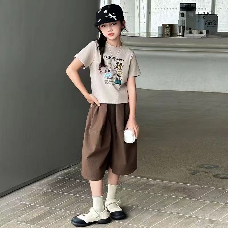 소녀 여름 대학 스타일 반팔 세트 새로운 스타일 느슨한 올매치 크롭 팬츠 2 피스 세트 어린이와 소녀 및 학생스토어 가기