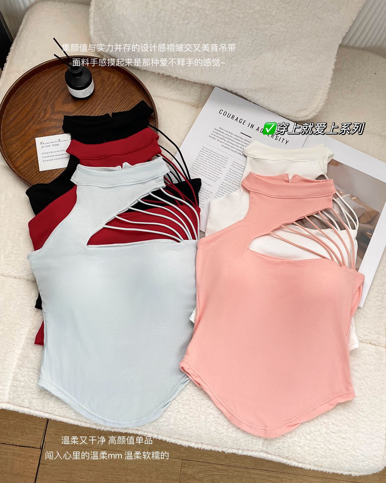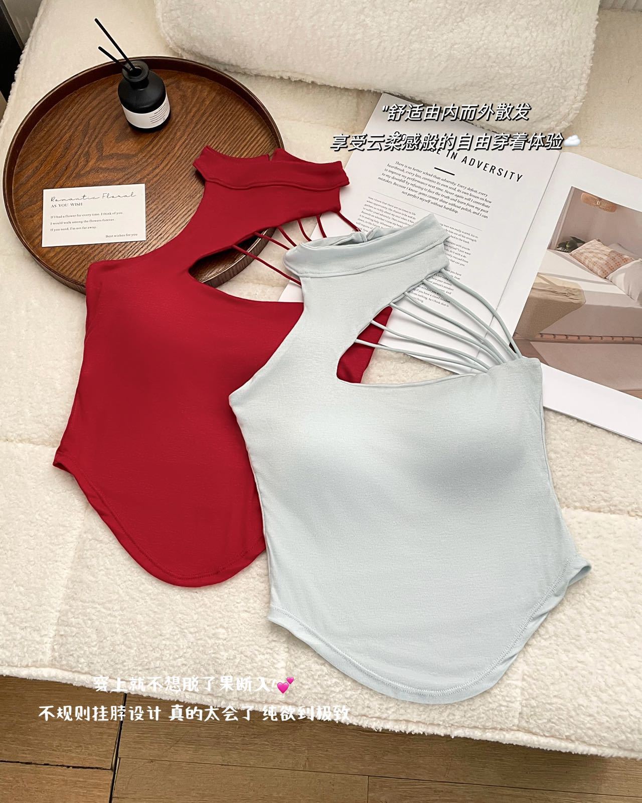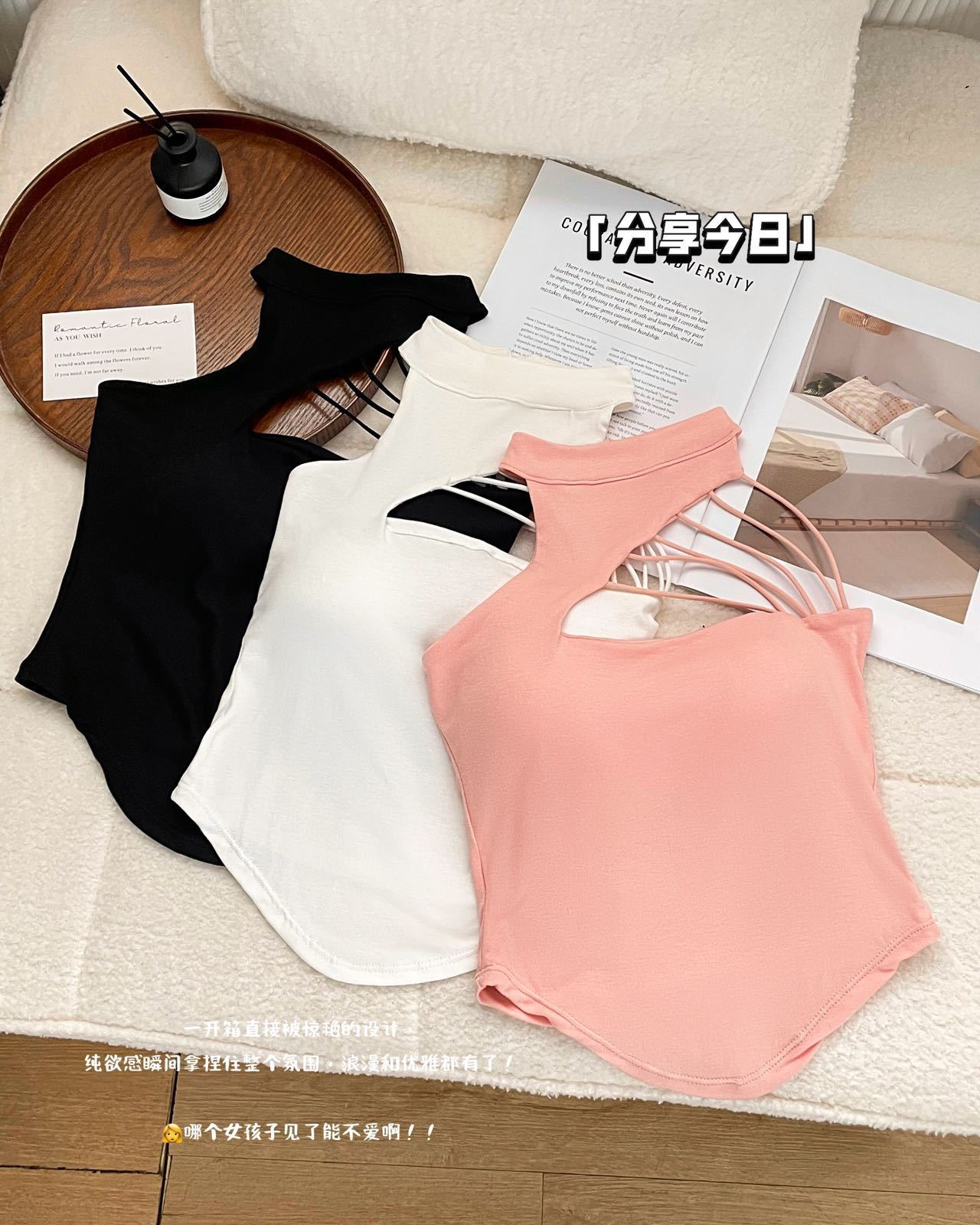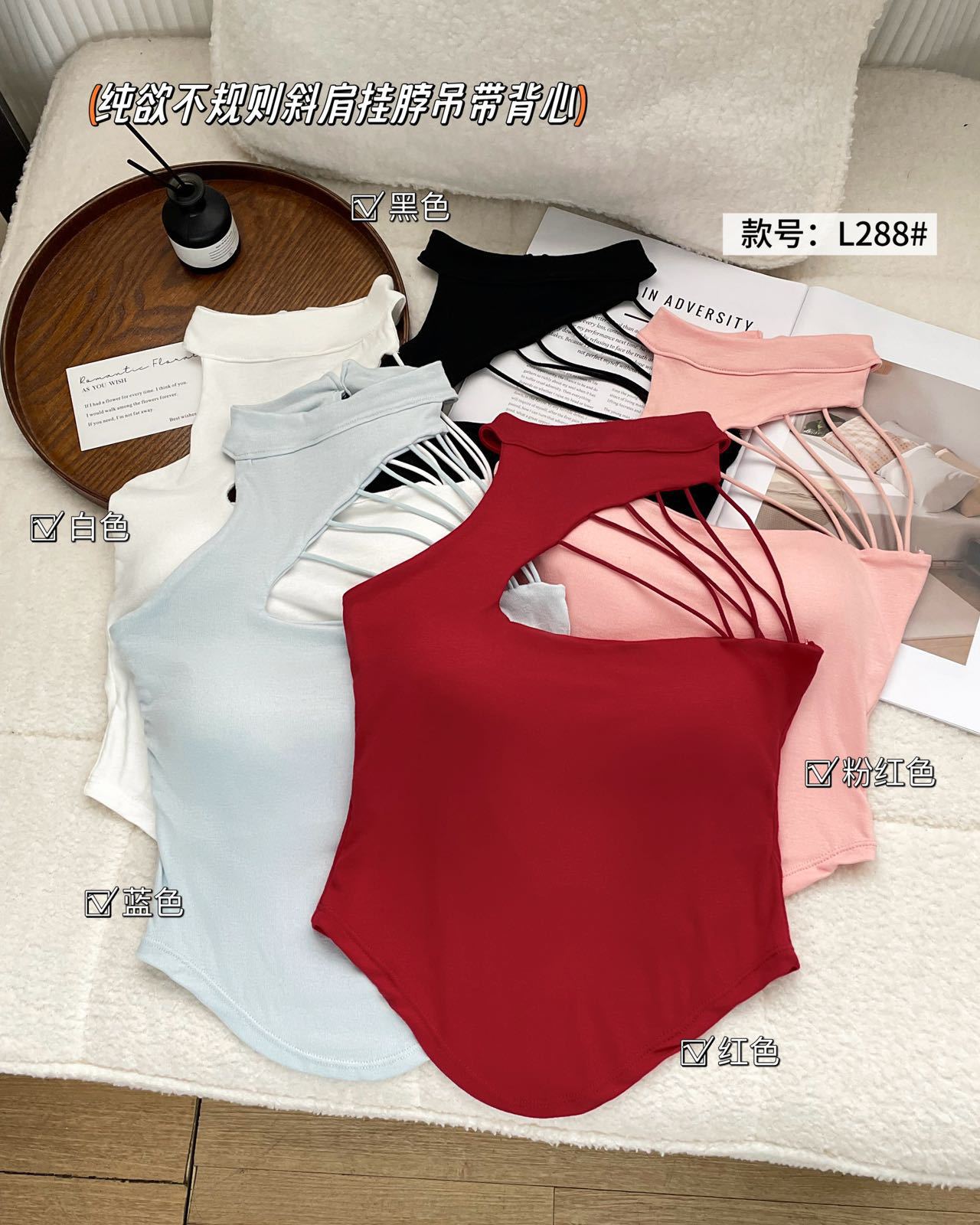 L288을 한국어로 번역하세요 # 아름다운 소녀 중공 홀터넥 캐미솔 여름 슬림핏 불규칙한 짧은 탑