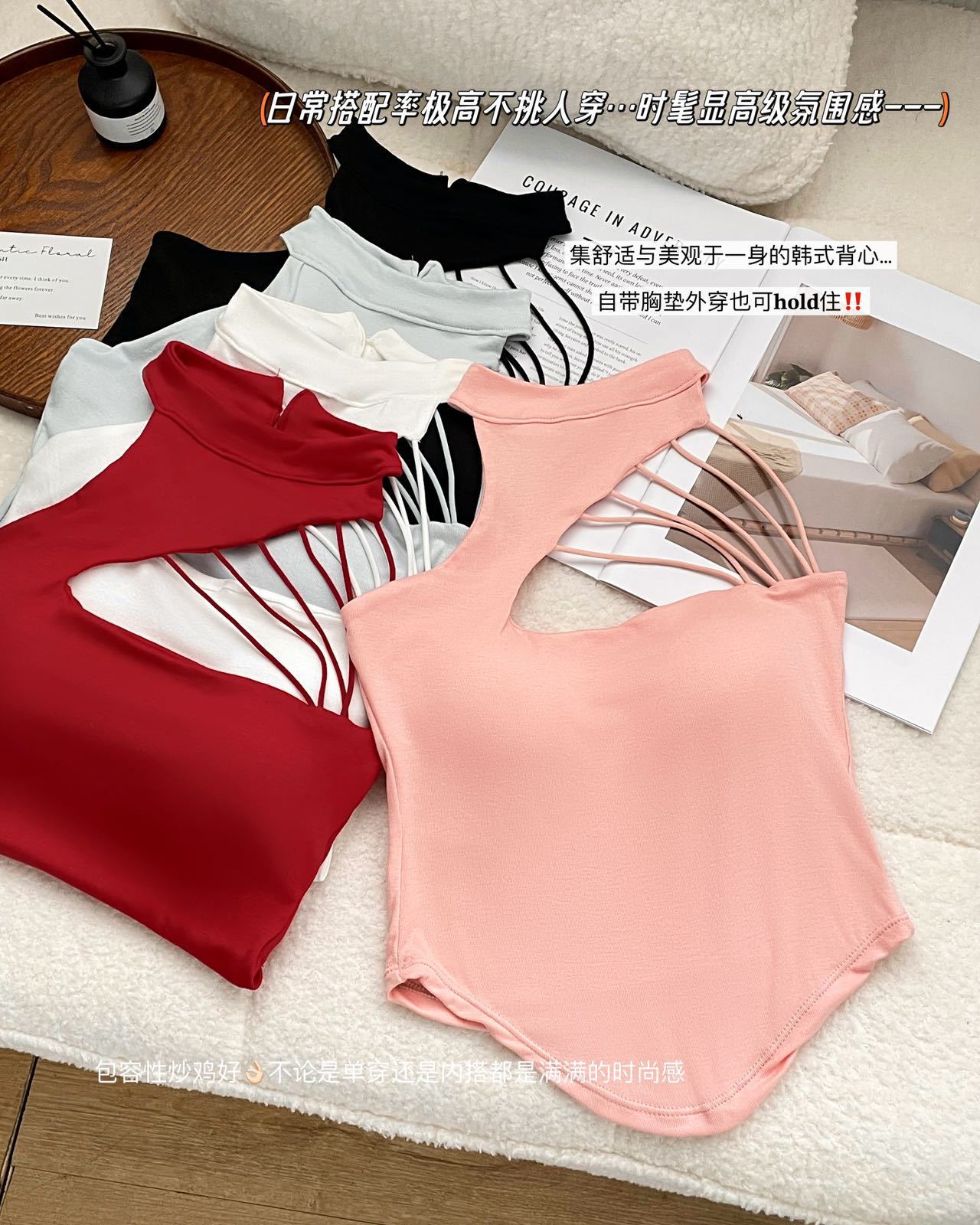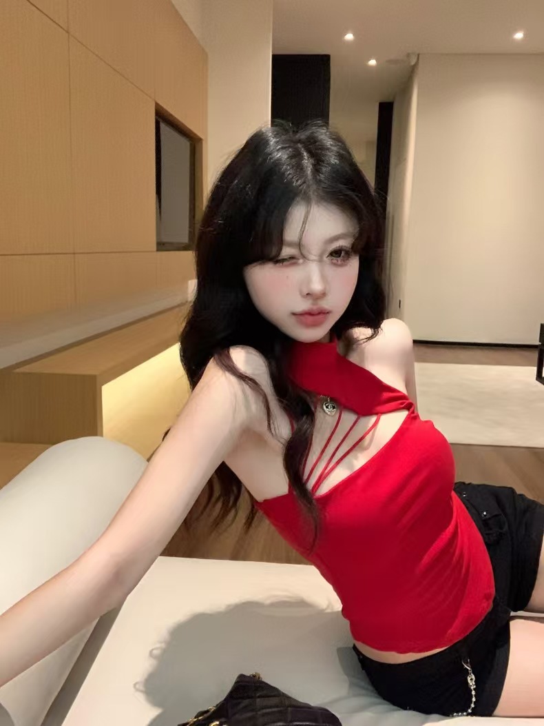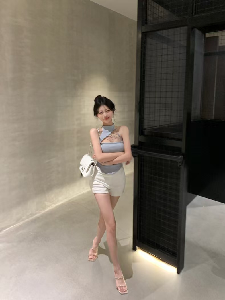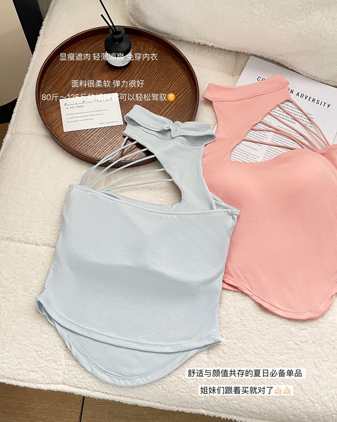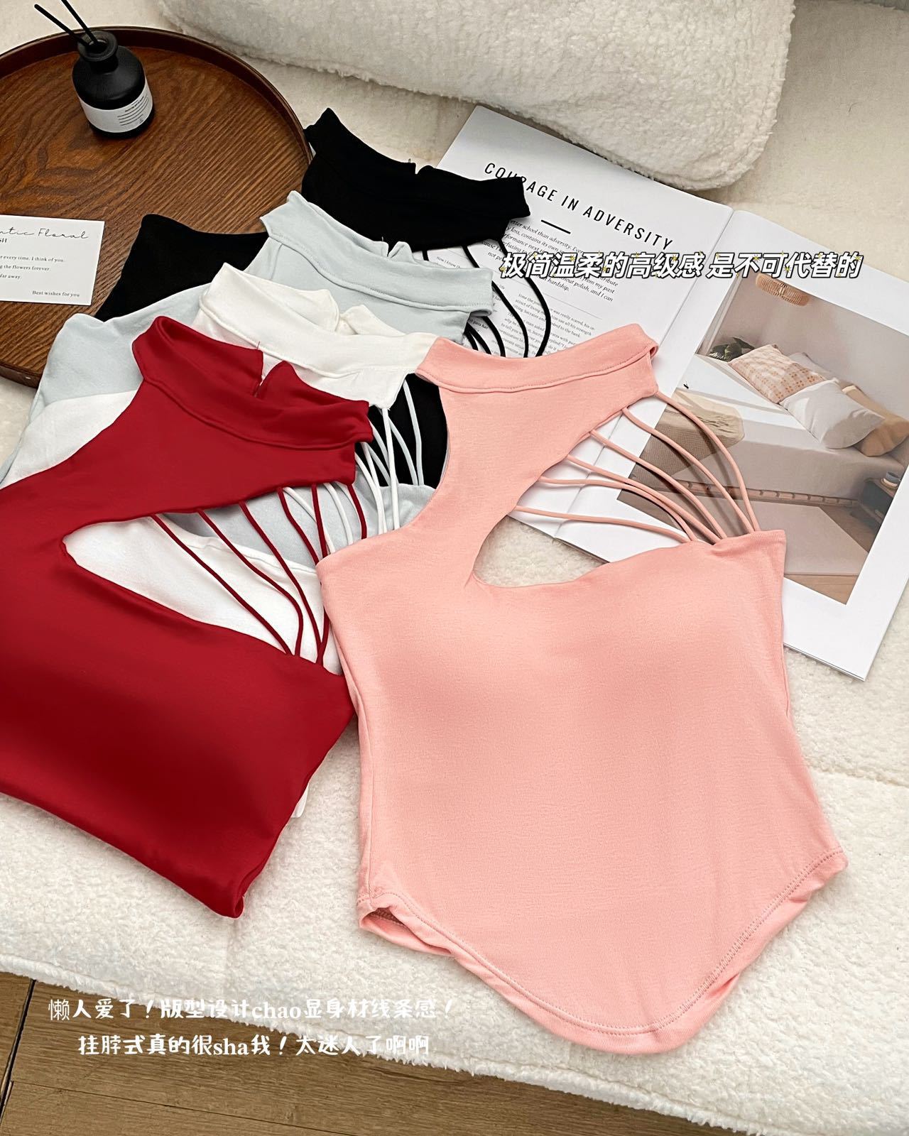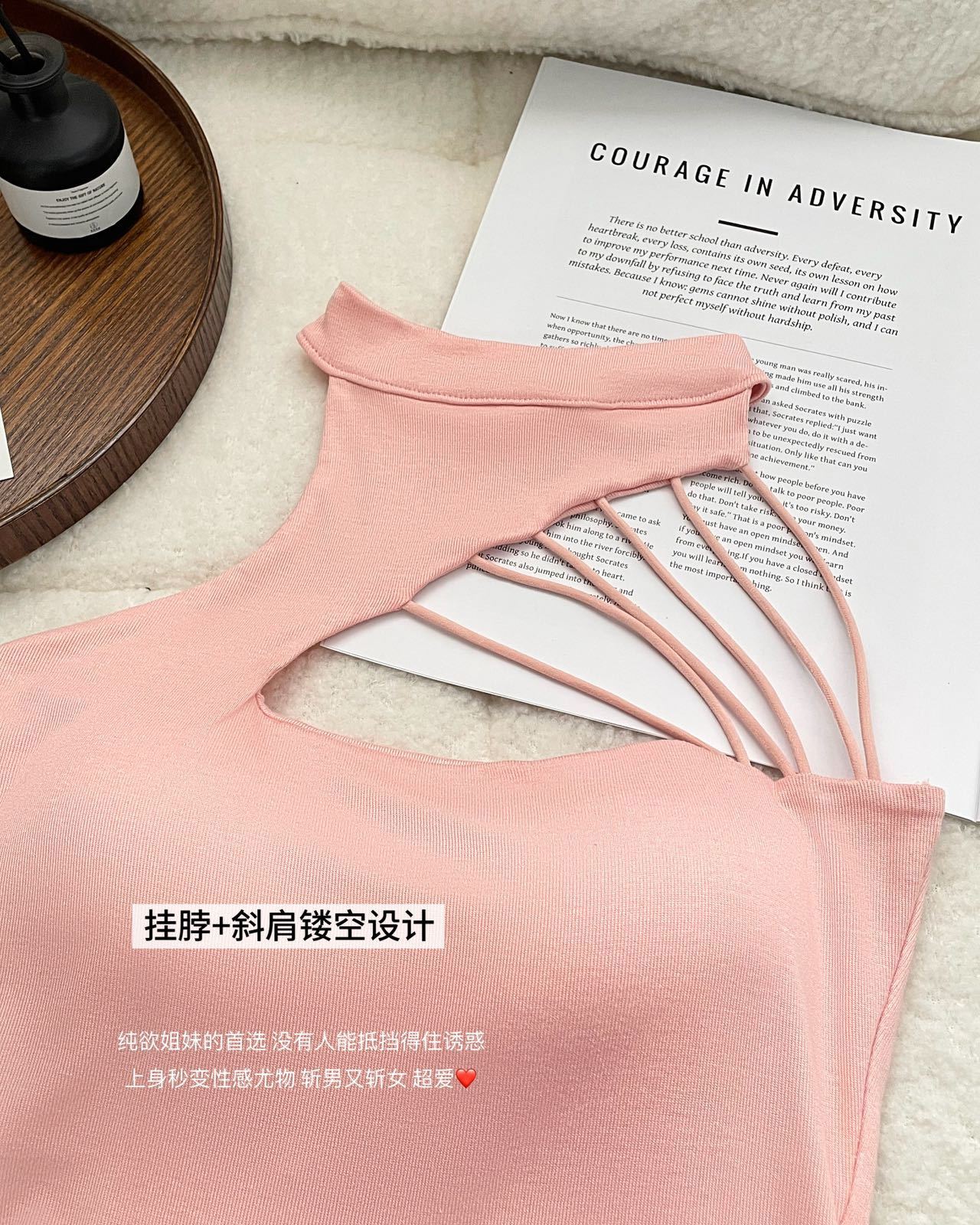 L288을 한국어로 번역하세요 # 아름다운 소녀 중공 홀터넥 캐미솔 여름 슬림핏 불규칙한 짧은 탑
