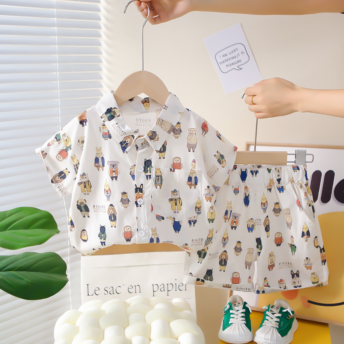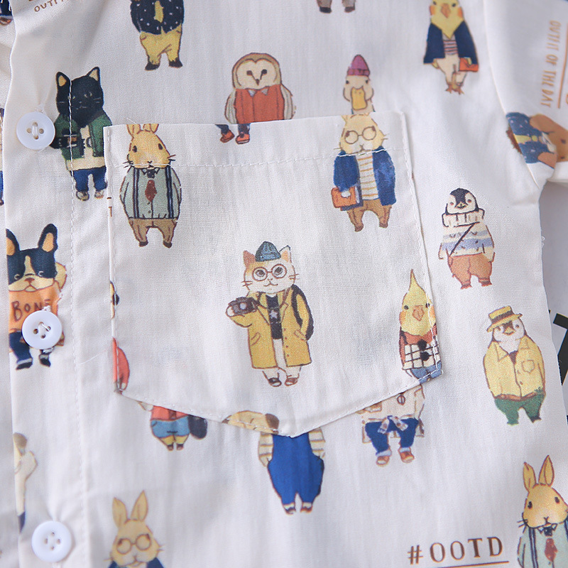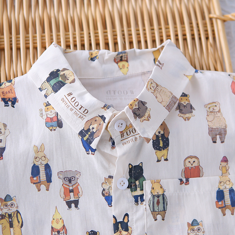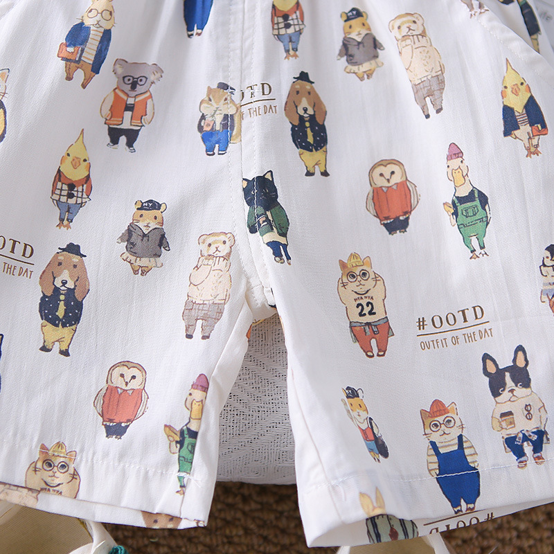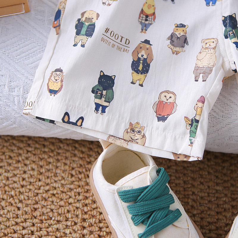 • 화이트 X25071 - 올오버 프린트 애니멀 셔츠 반팔 투피스 세트