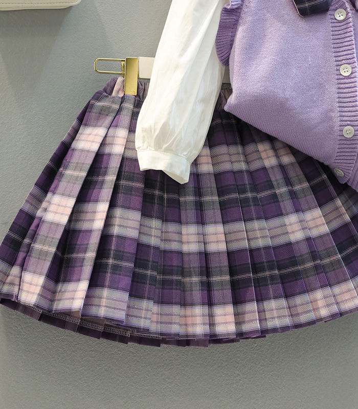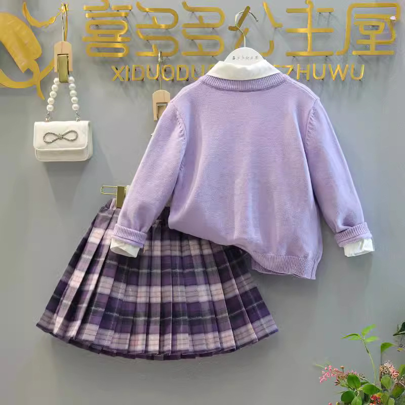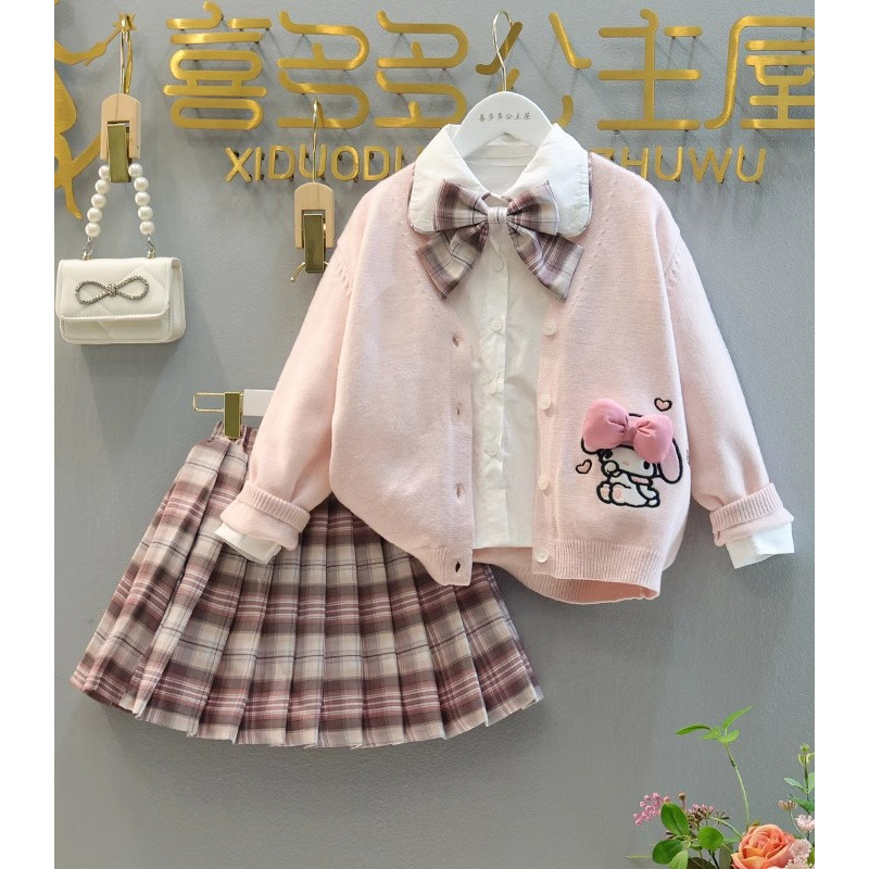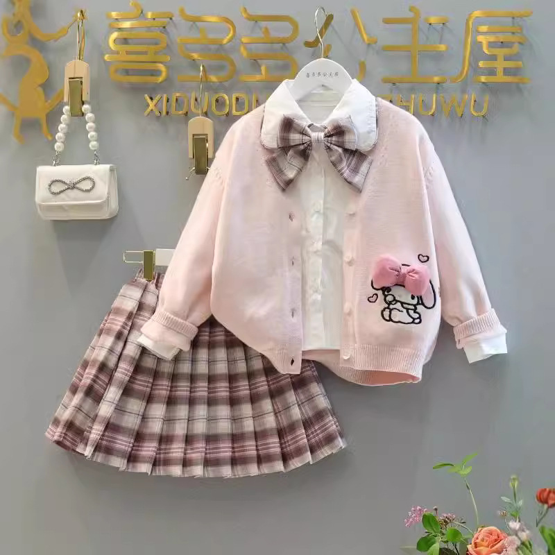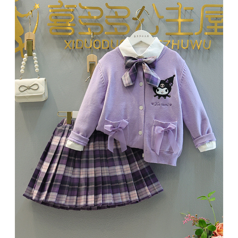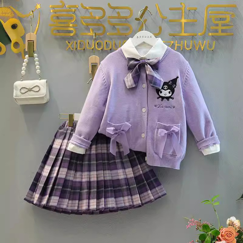 여자 JK 정장 2024 봄 새로운 스타일 Kuromi 만화 대학 스타일 스웨터 긴팔 셔츠 어린이 3 피스 세트스토어 가기