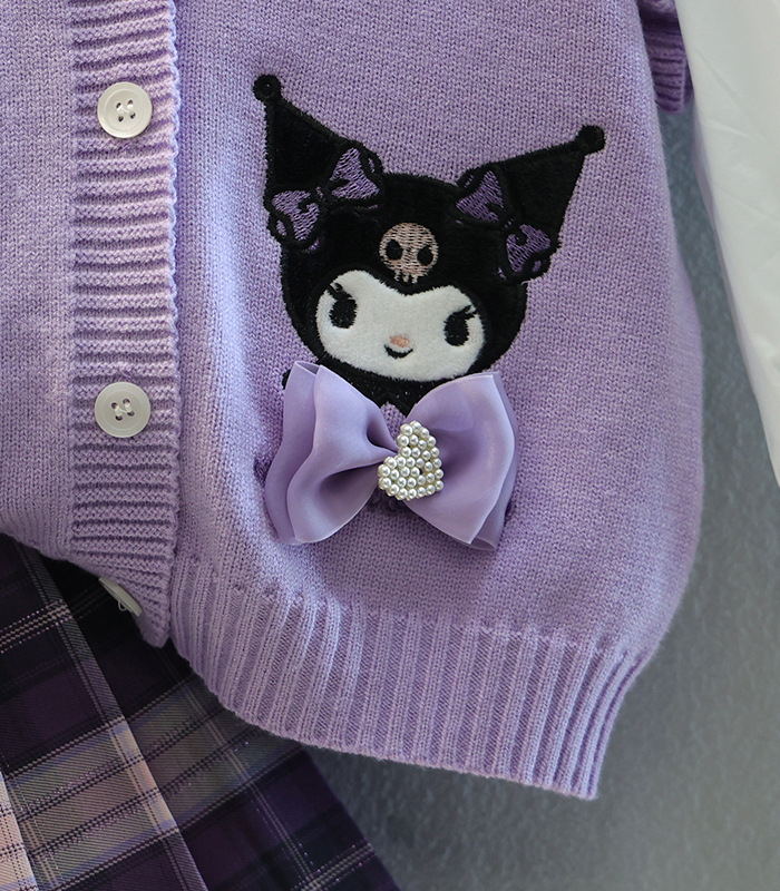 여자 JK 정장 2024 봄 새로운 스타일 Kuromi 만화 대학 스타일 스웨터 긴팔 셔츠 어린이 3 피스 세트