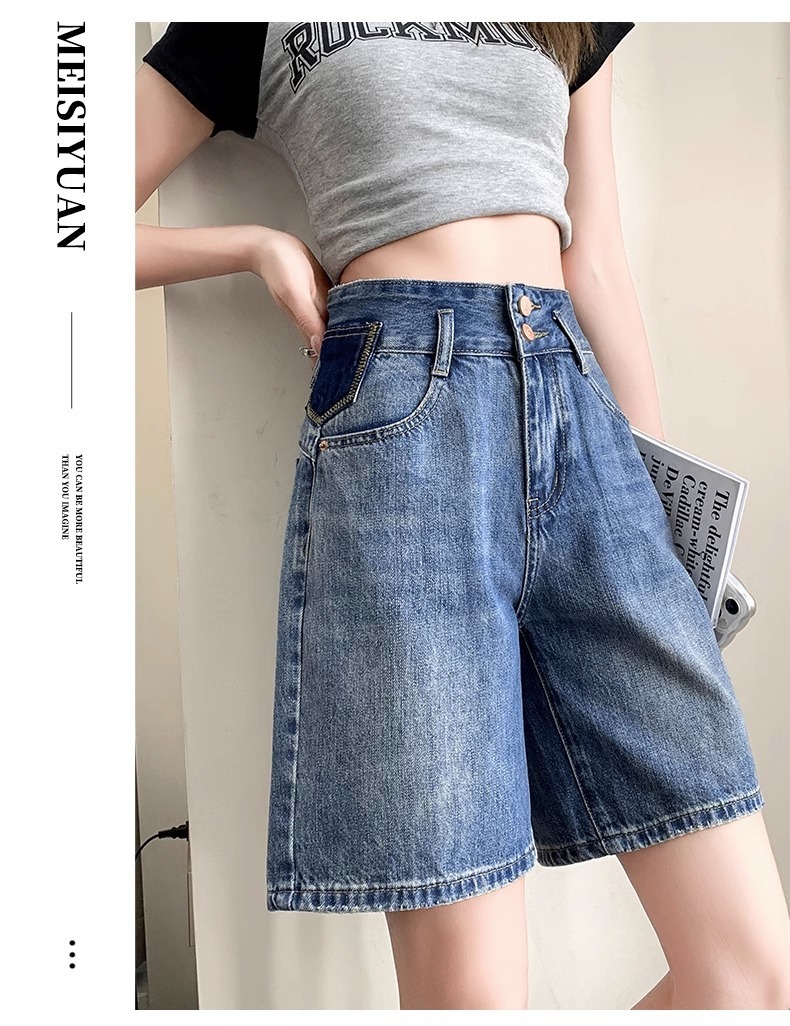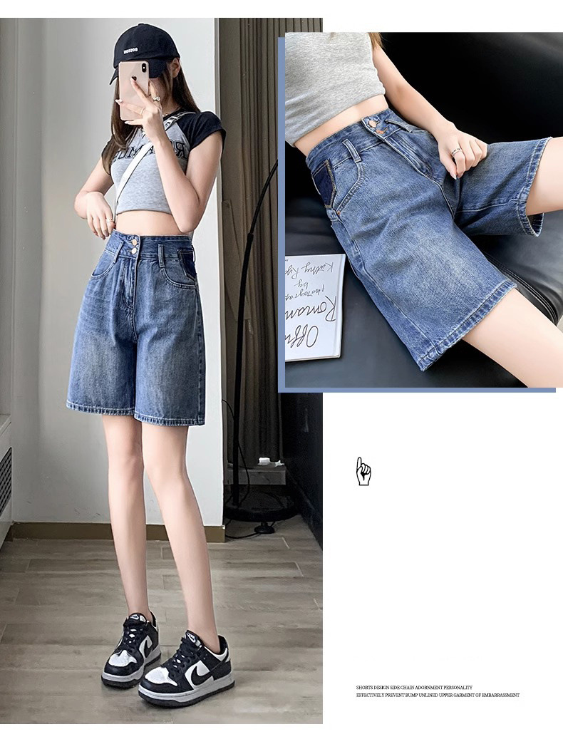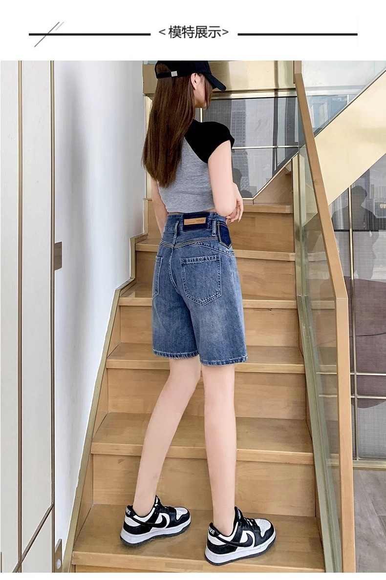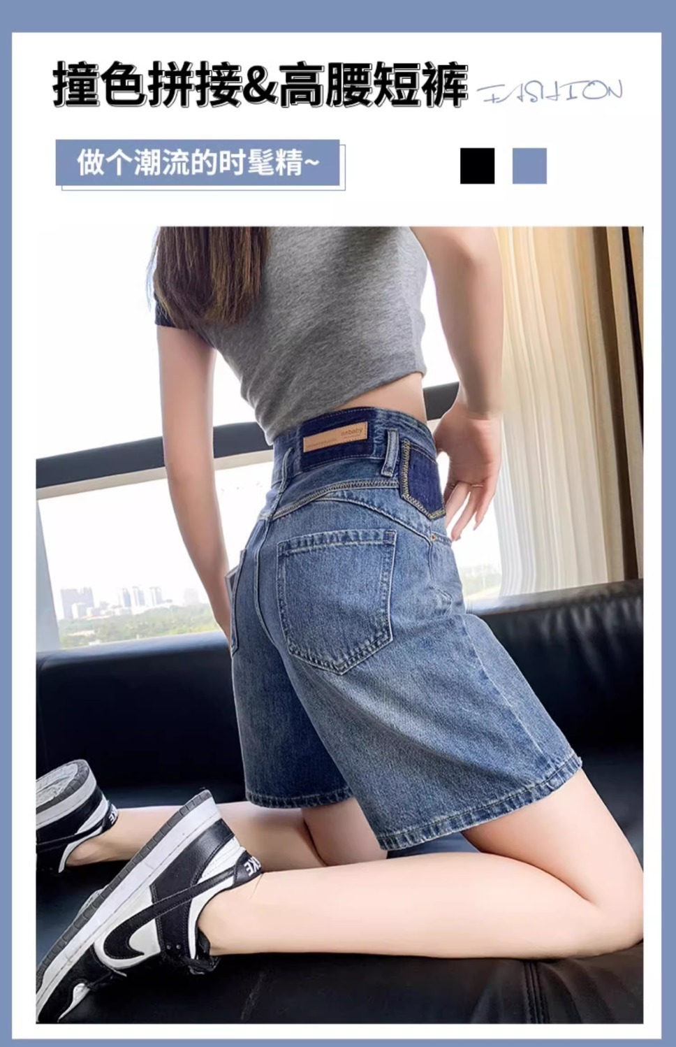 5 점 데님 반바지 여성의 여름 얇은 2024 새로운 대비 색상 스티칭 플러스 사이즈 높은 허리 슬리밍 스트레이트 트렌디 중간 바지스토어 가기