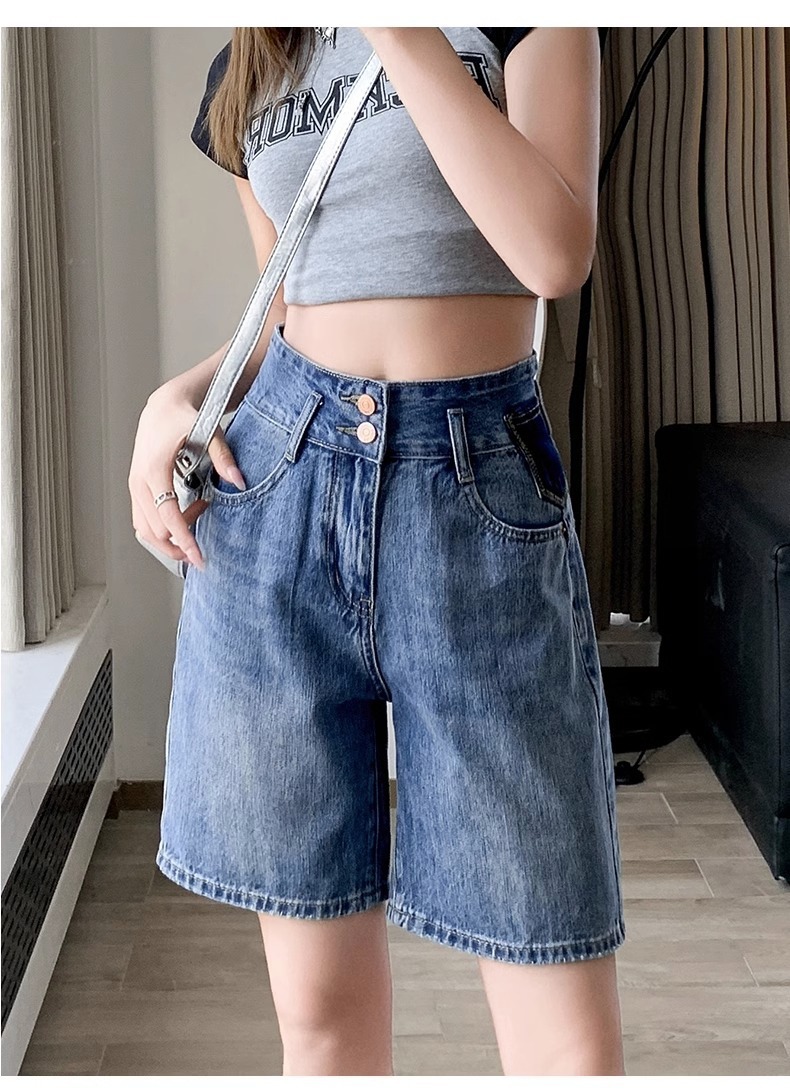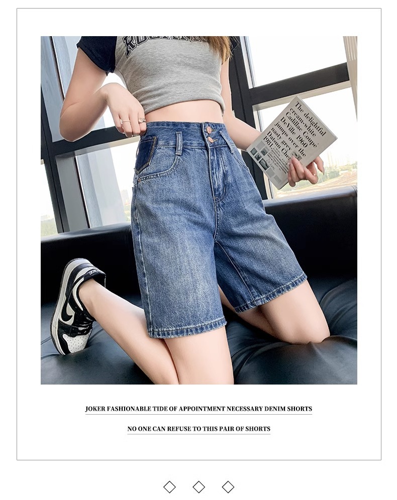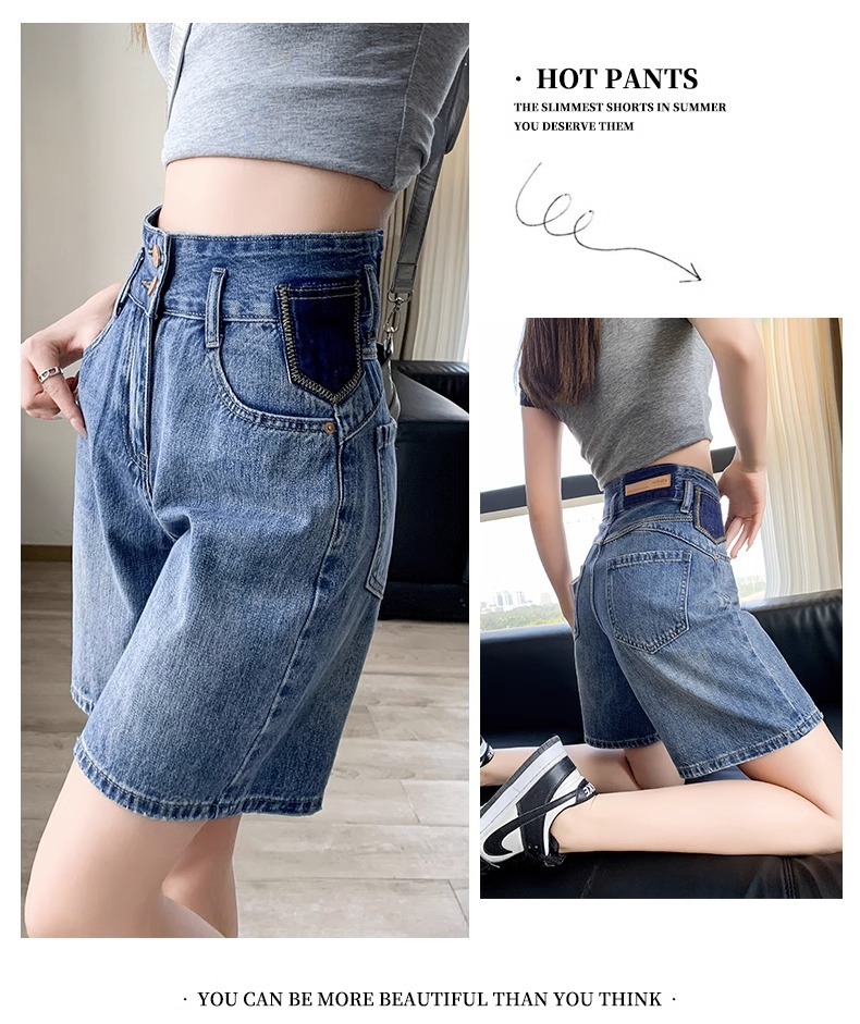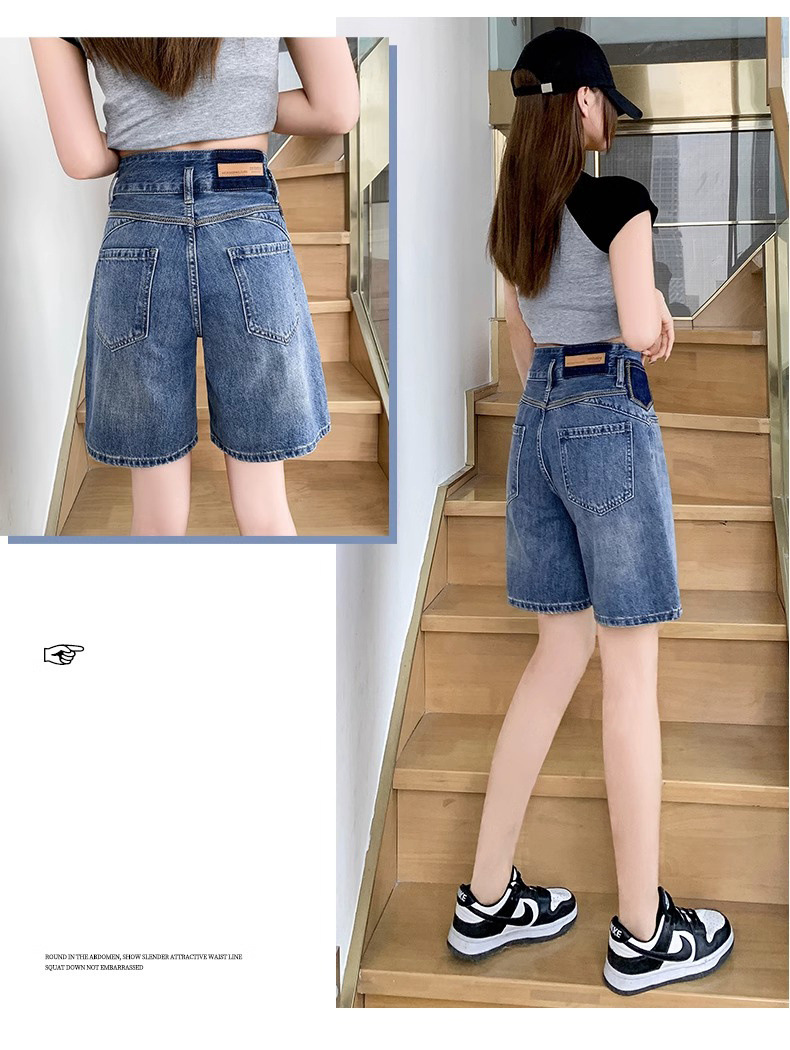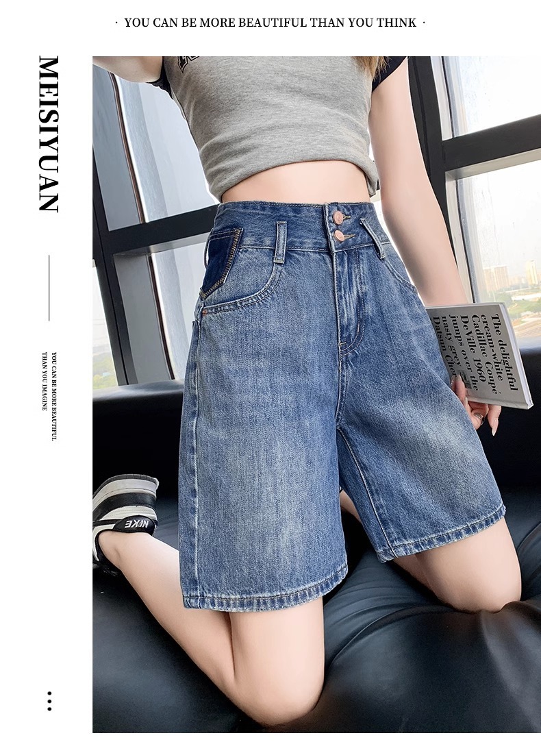 5 점 데님 반바지 여성의 여름 얇은 2024 새로운 대비 색상 스티칭 플러스 사이즈 높은 허리 슬리밍 스트레이트 트렌디 중간 바지스토어 가기