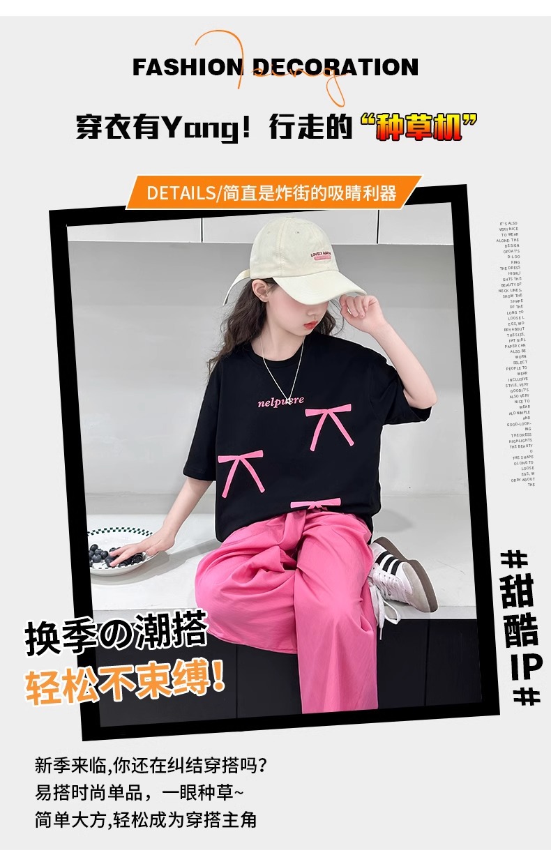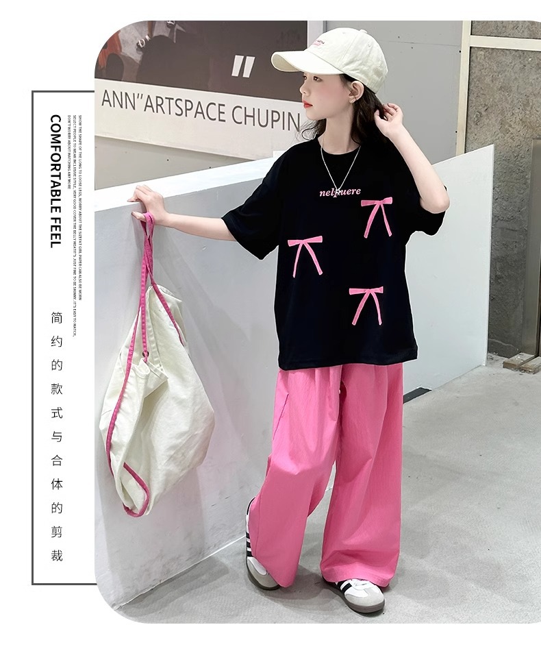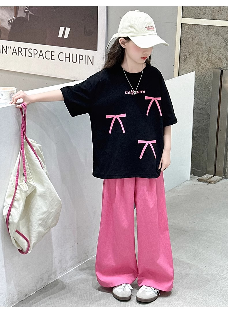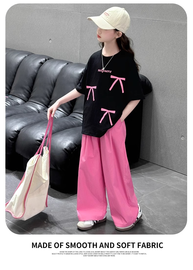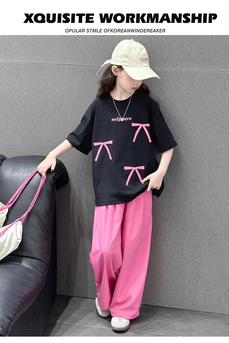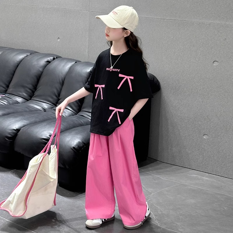 여자 여름 반팔 양복 2025 새로운 스타일 여름 옷 여자 어린이를위한 캐주얼 티셔츠 어린이 얇은 와이드 팬츠