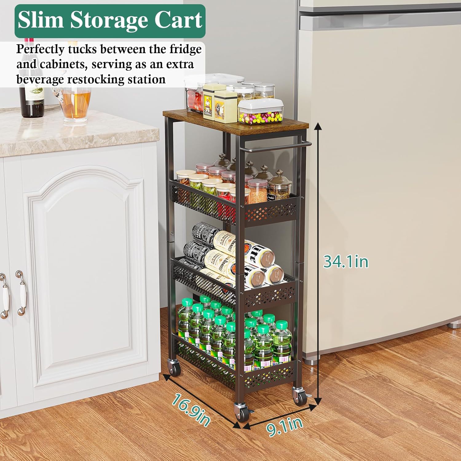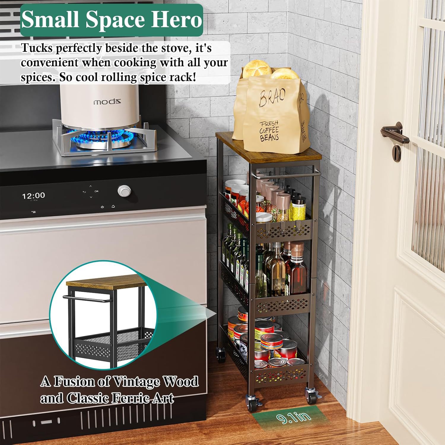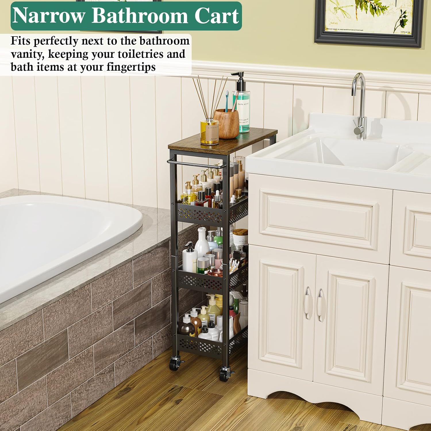 맞춤형 욕실 4층 좁은 스토리지 랙 레트로 나무 스토리지 카트 주방 거실 바퀴 달린 스토리지 랙