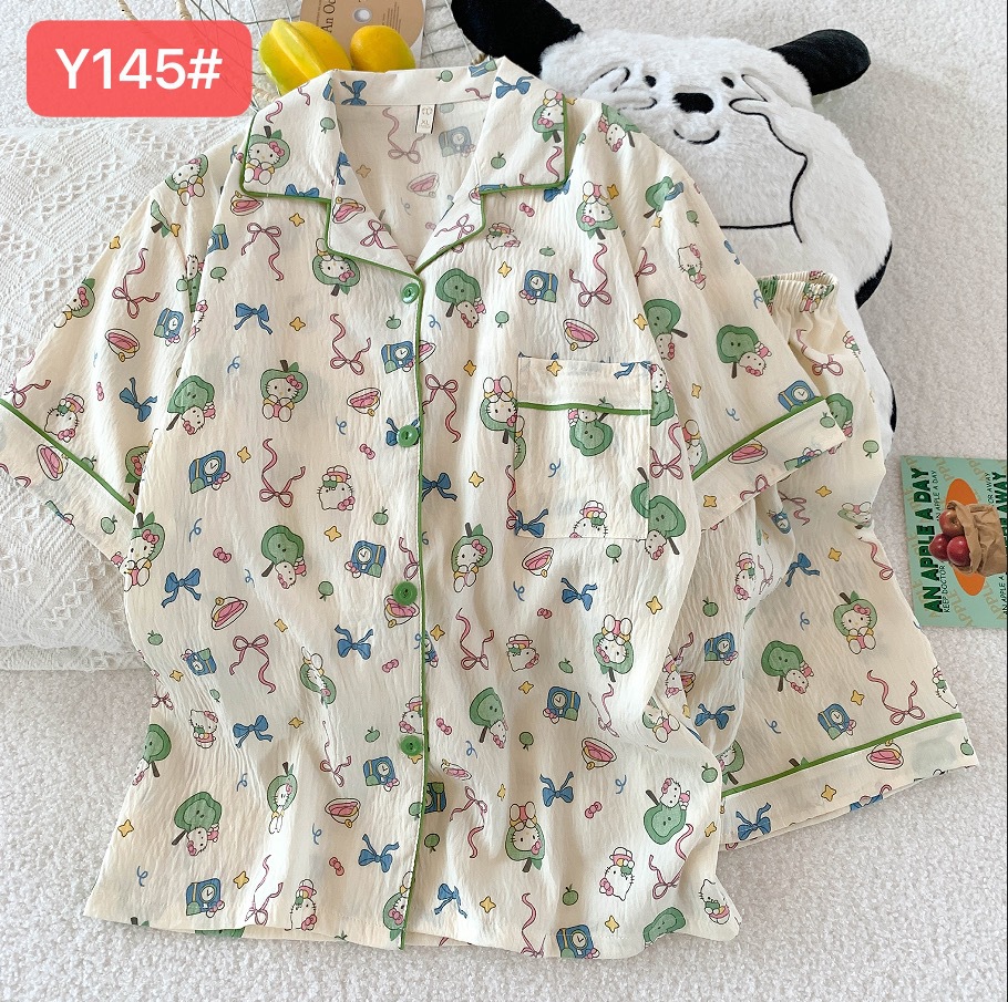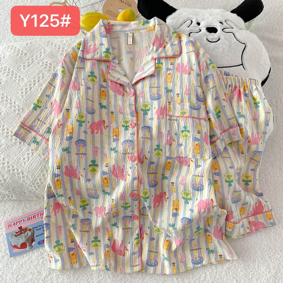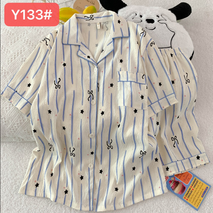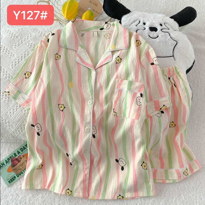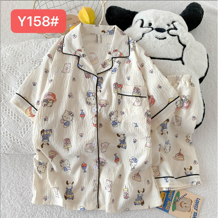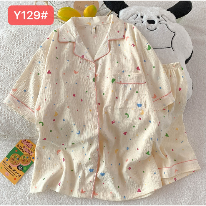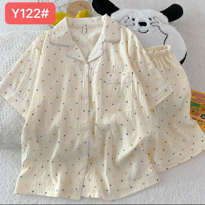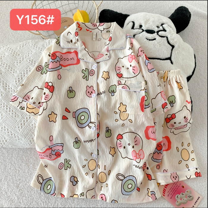 소스 공장 여름 새로운 구름면 카디건 옷깃 소녀 잠옷 짧은 소매 반바지 여성 홈 의류 세트스토어 가기