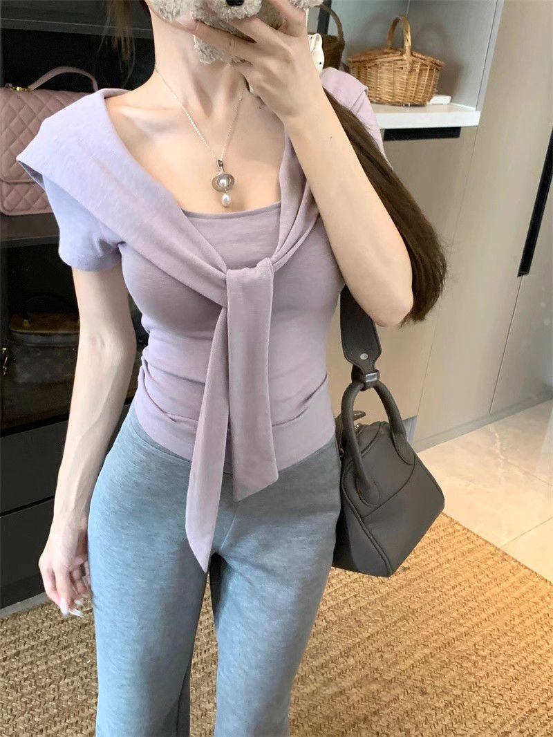 한국 스타일 순수한 욕망 스타일 스트랩 스퀘어 칼라 반팔 티셔츠 2025 여름 여성을위한 새로운 슬림핏 슬리밍 짧은 세련된 탑