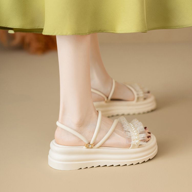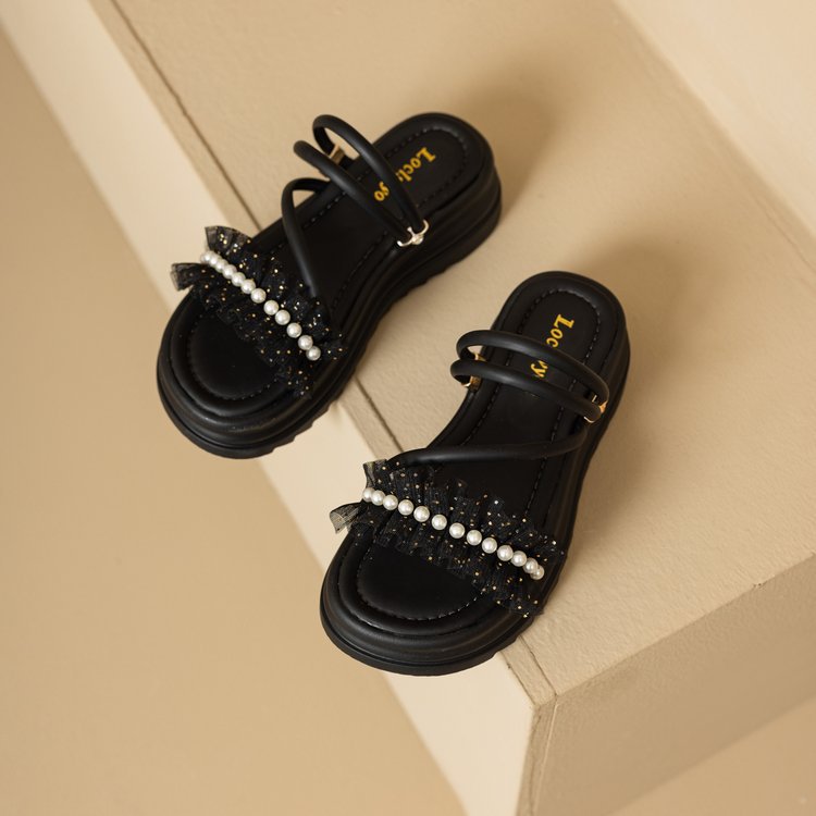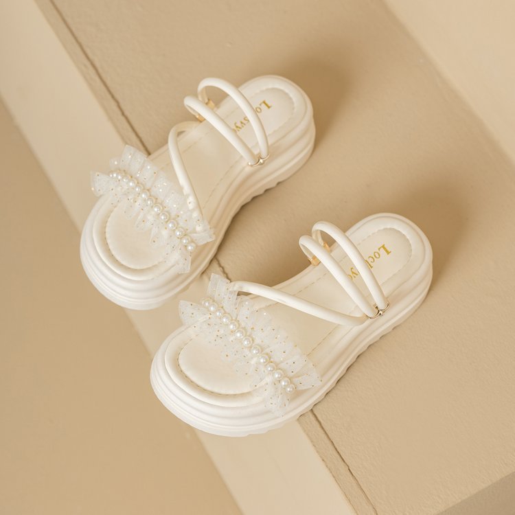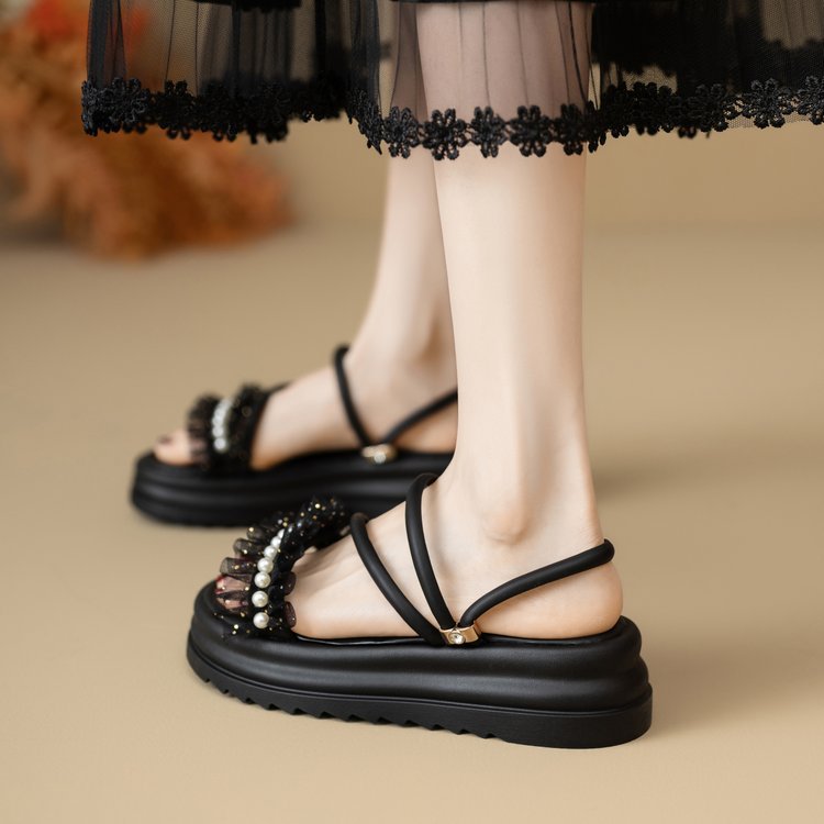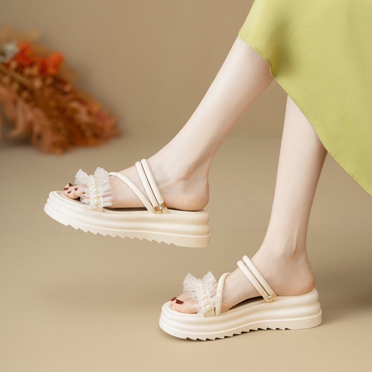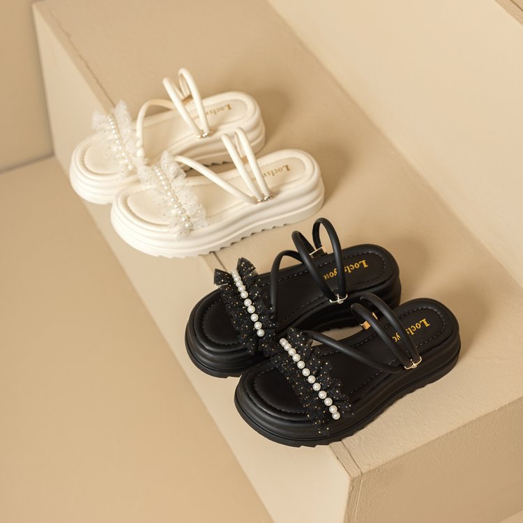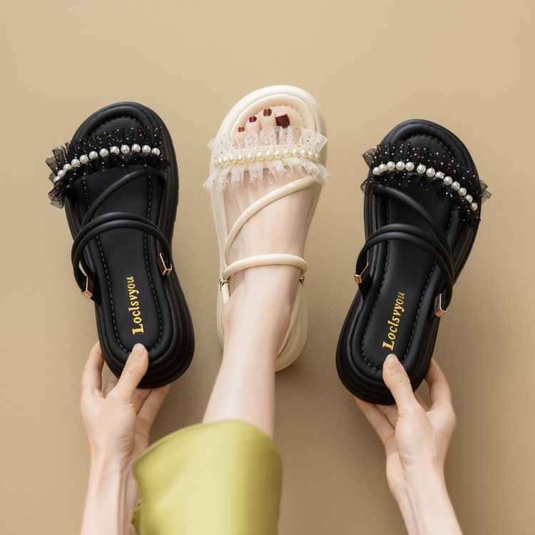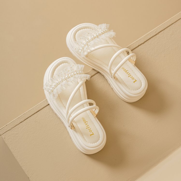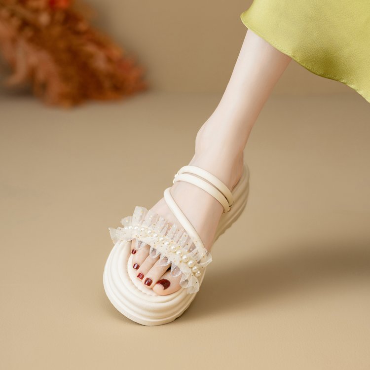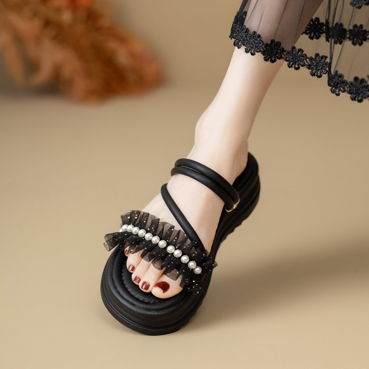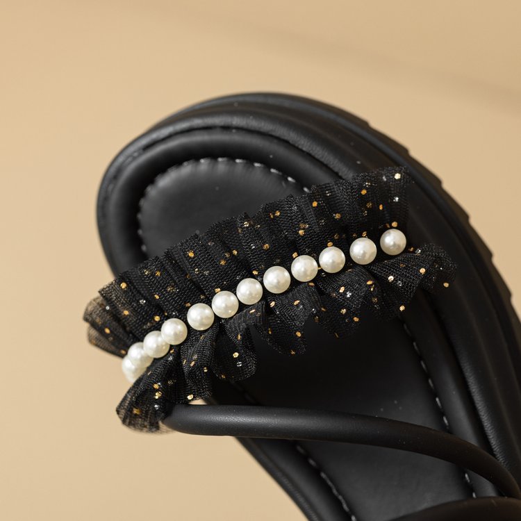 여성을위한 인터넷 연예인 진주 레이스 슬리퍼 2025 새로운 여름 겉옷 두꺼운 밑창 원 스트랩 경량 로마 샌들