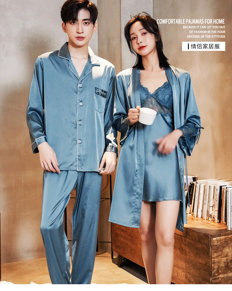 커플 잠옷 봄과 가을 아이스 실크 새로운 여름 하이 엔드 남성용 홈 옷 여자 잠옷 슬링 가슴 패드