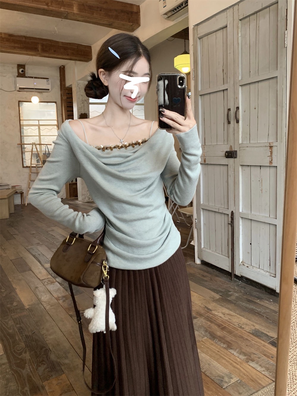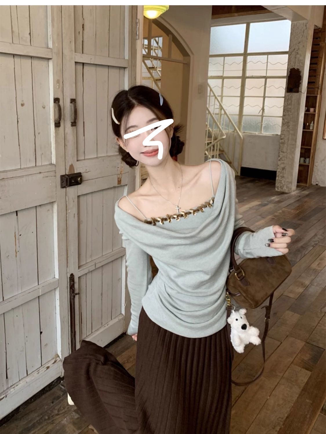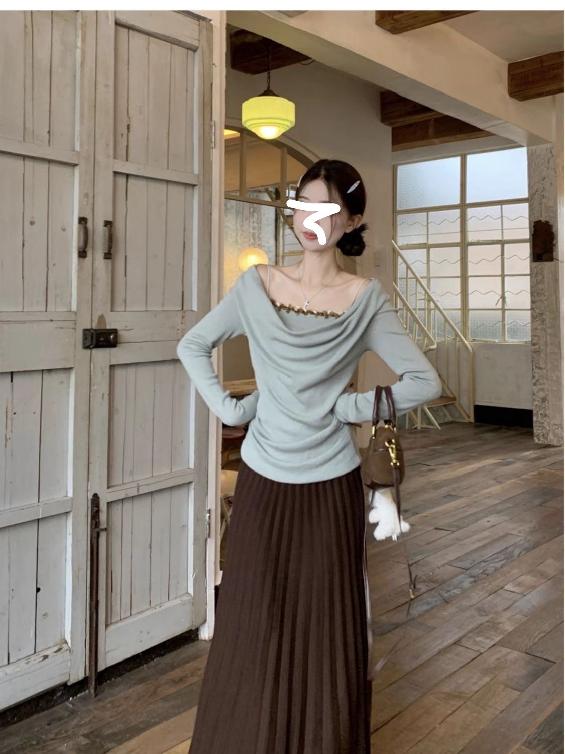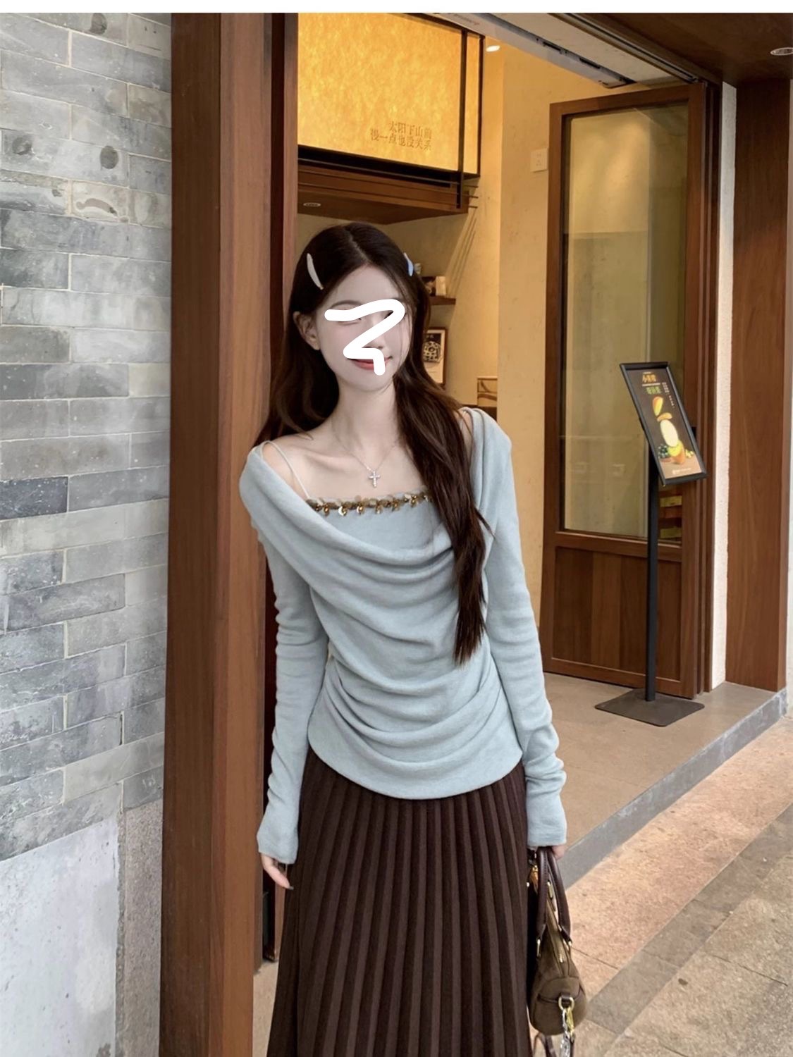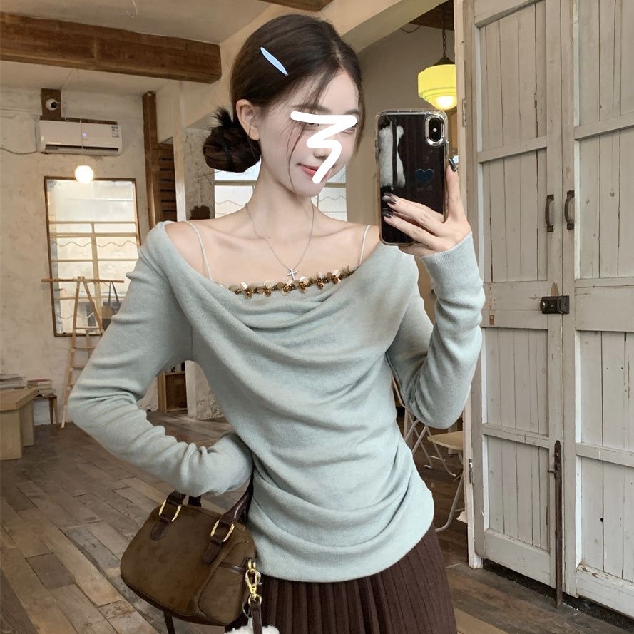 하이 엔드 센스 스윙 칼라 오프 숄더 가짜 투피스 최고 여성 2025 년 봄과 가을 새로운 프랑스 복고풍 세련된 디자인 센스 티셔츠스토어 가기