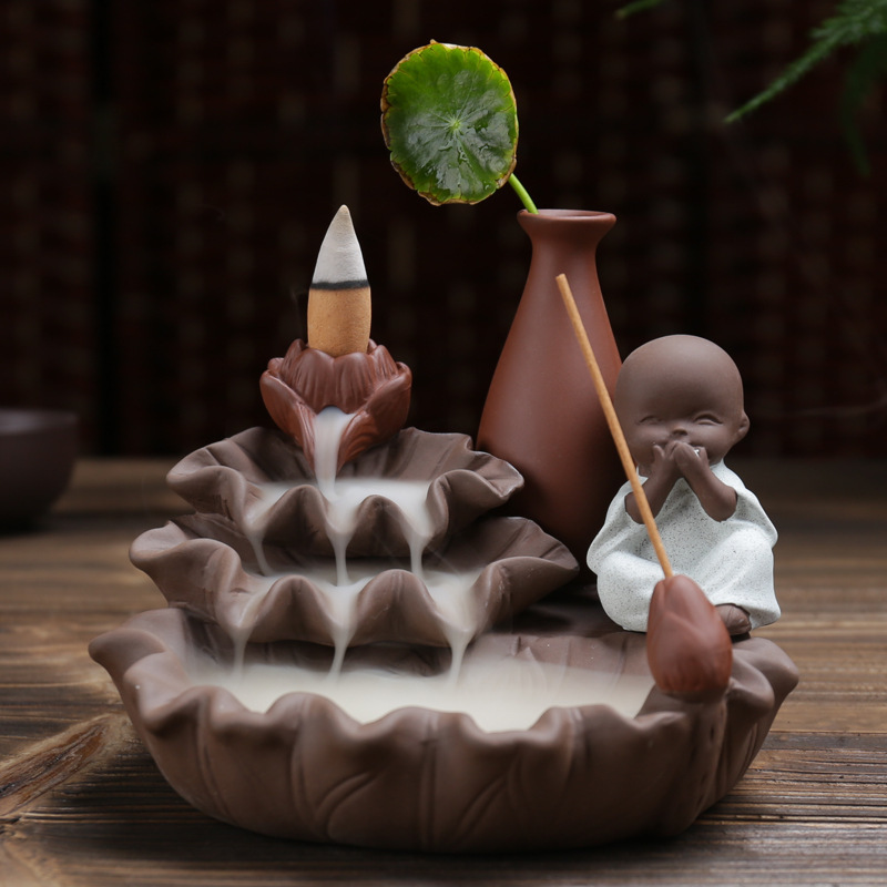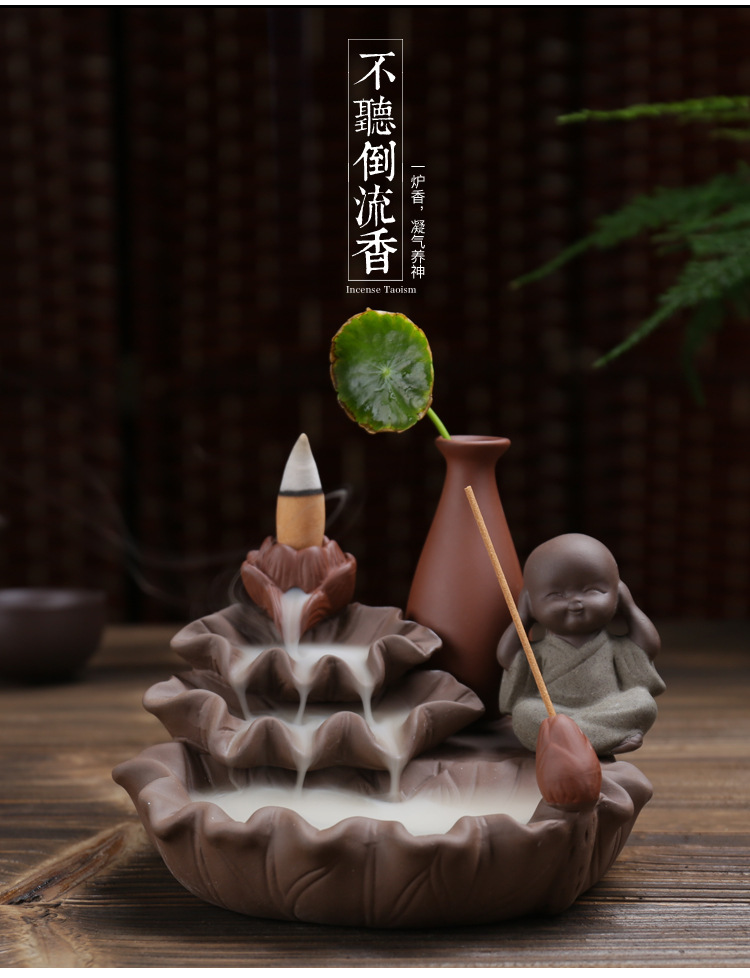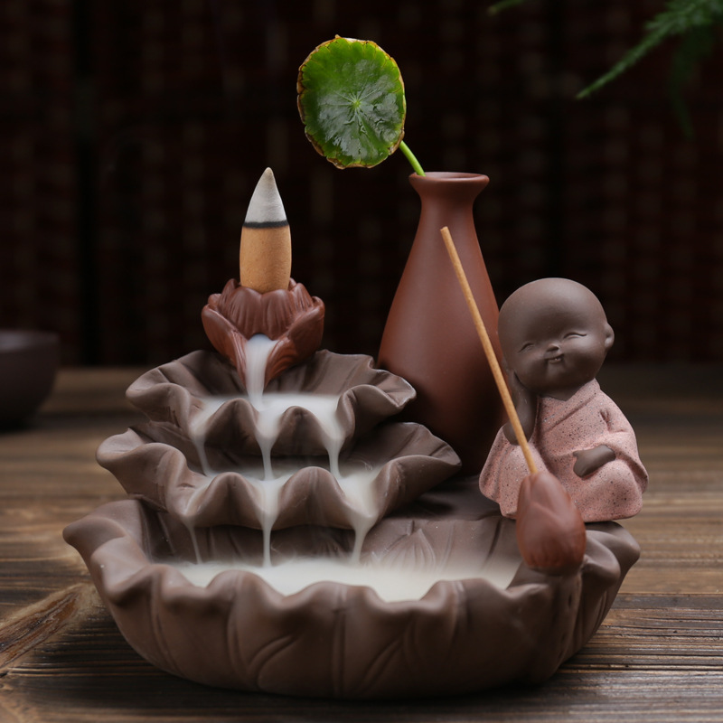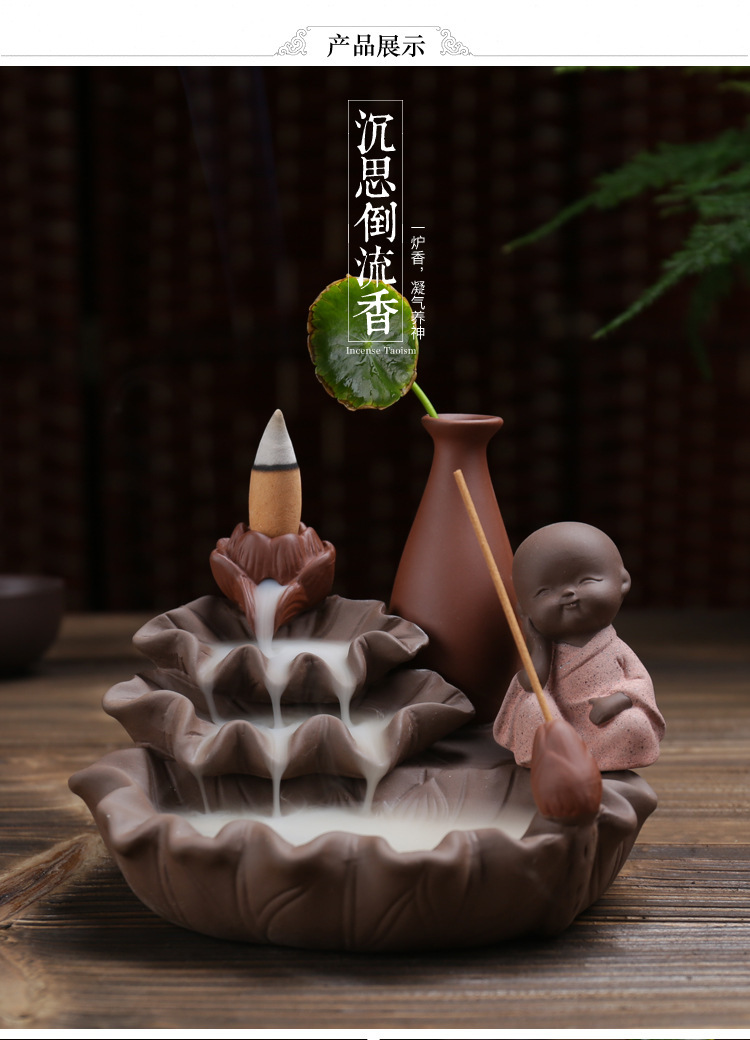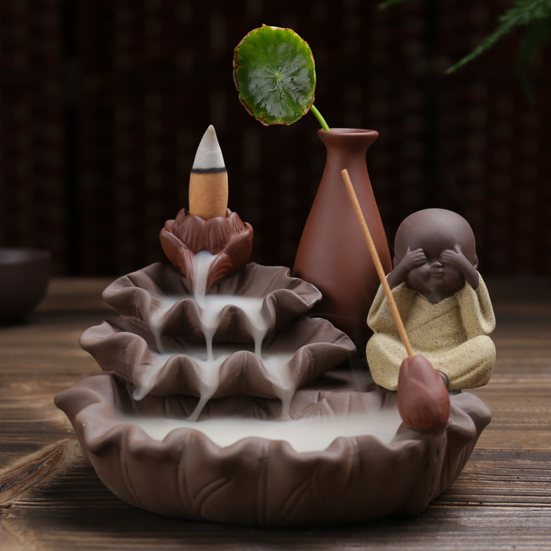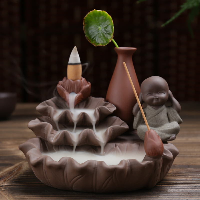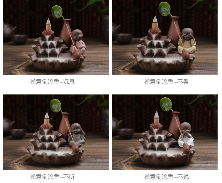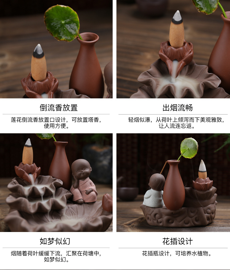 호리병 연꽃 역류 향로 보라색 모래 4개의 작은 스님 어린이 수경 장식품 향로 플러그인 향 역류 향스토어 가기