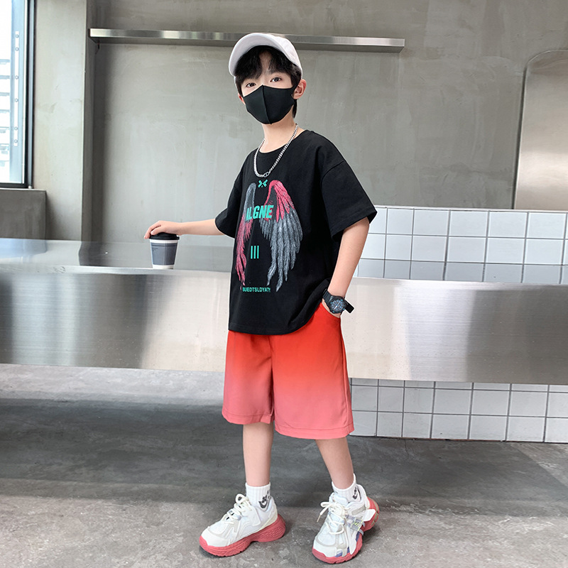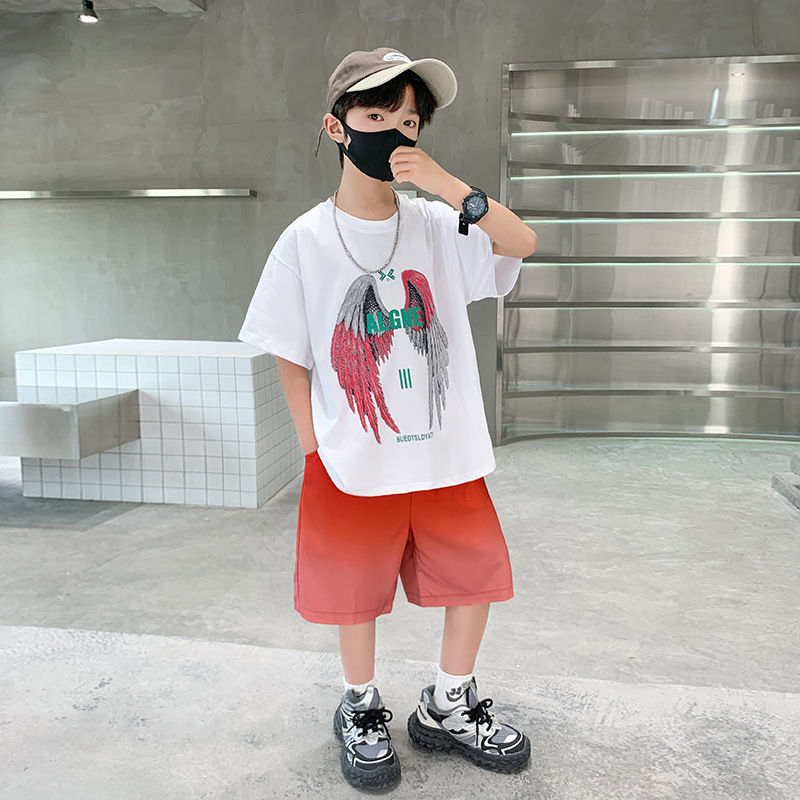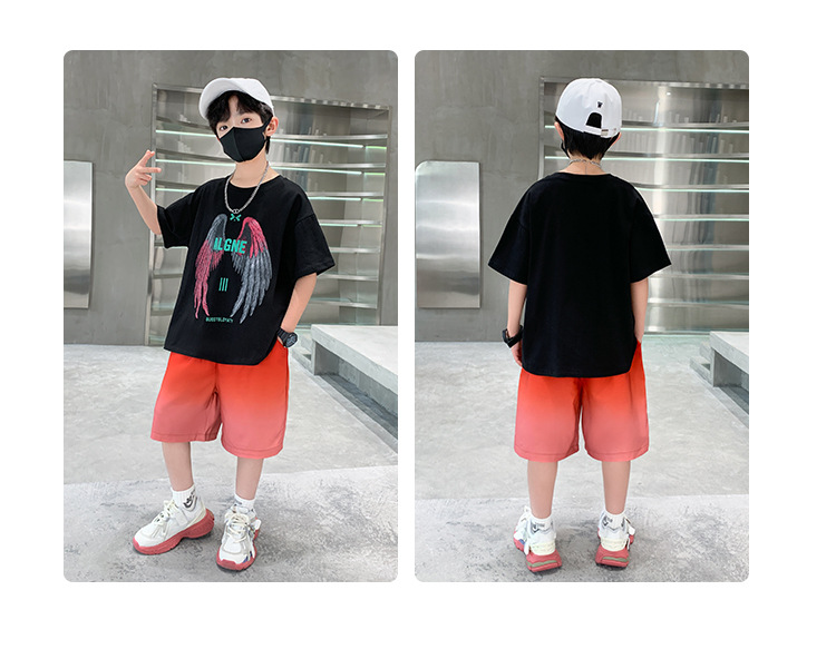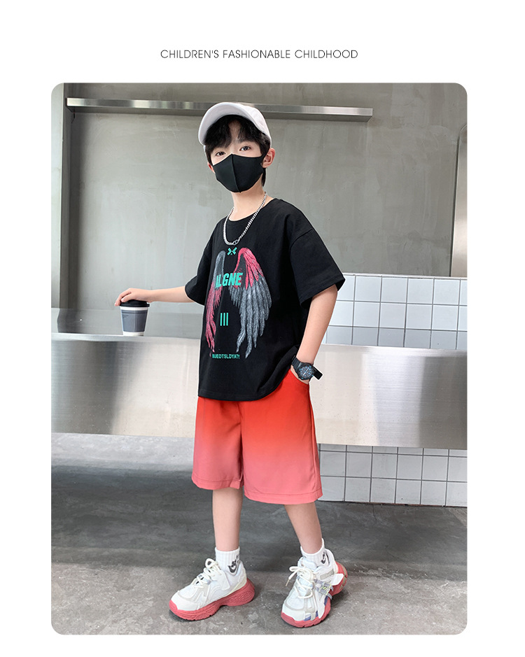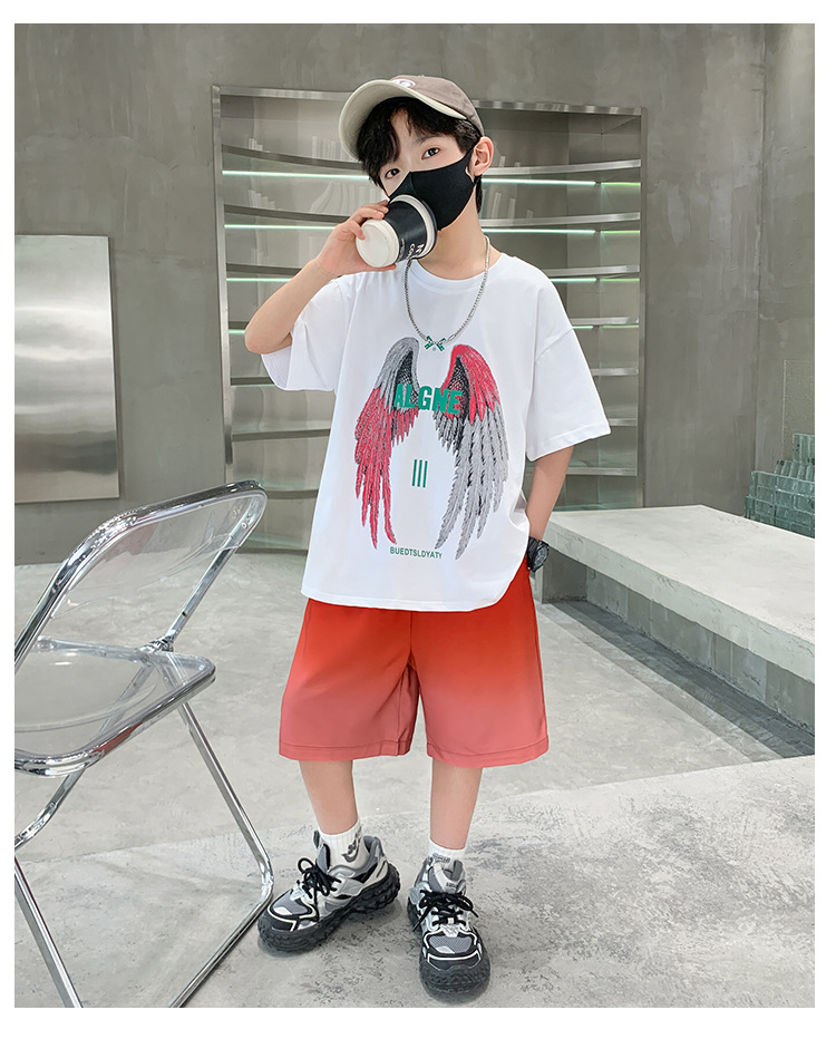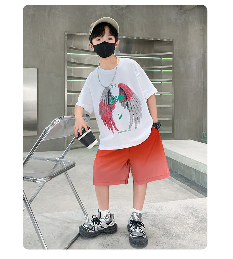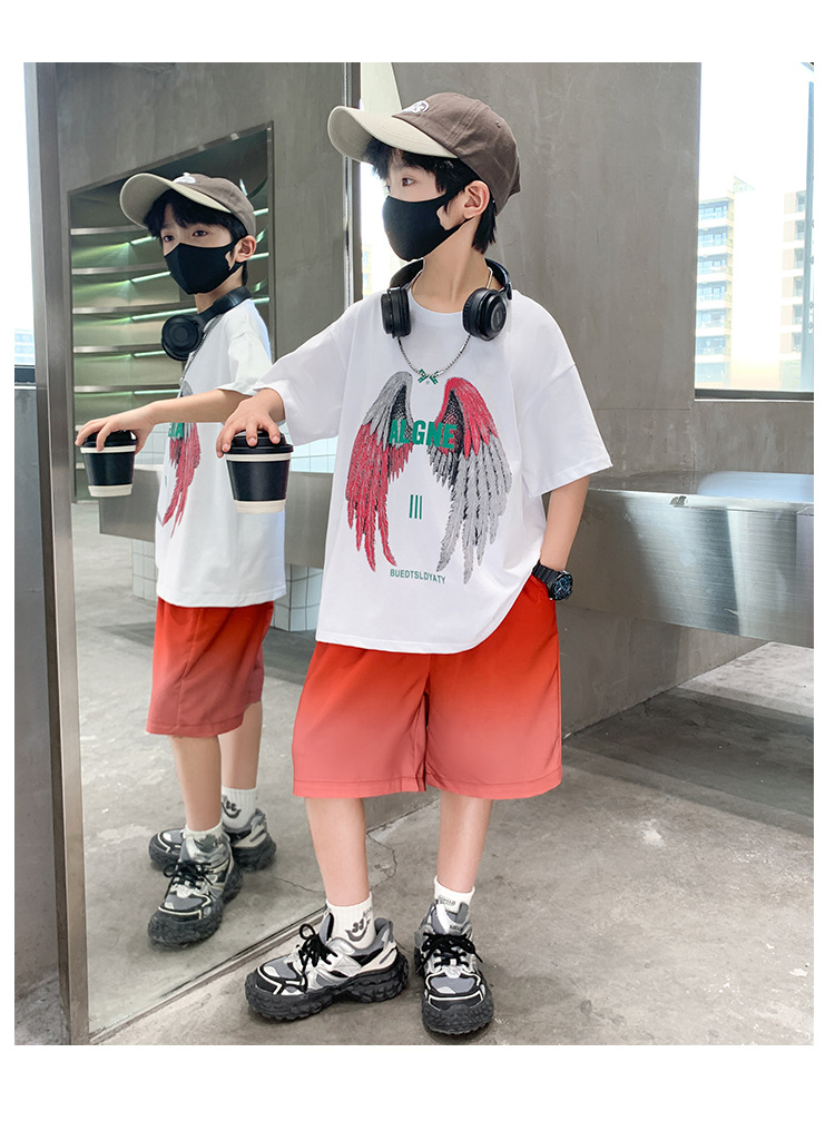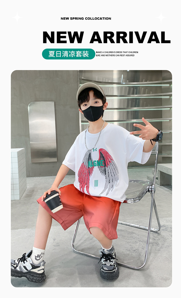 어린이 소년 여름 정장 2025 새로운 스타일 중대형 어린이 스포츠 및 레저 날개 반팔 티셔츠 반바지 투피스 세트 6