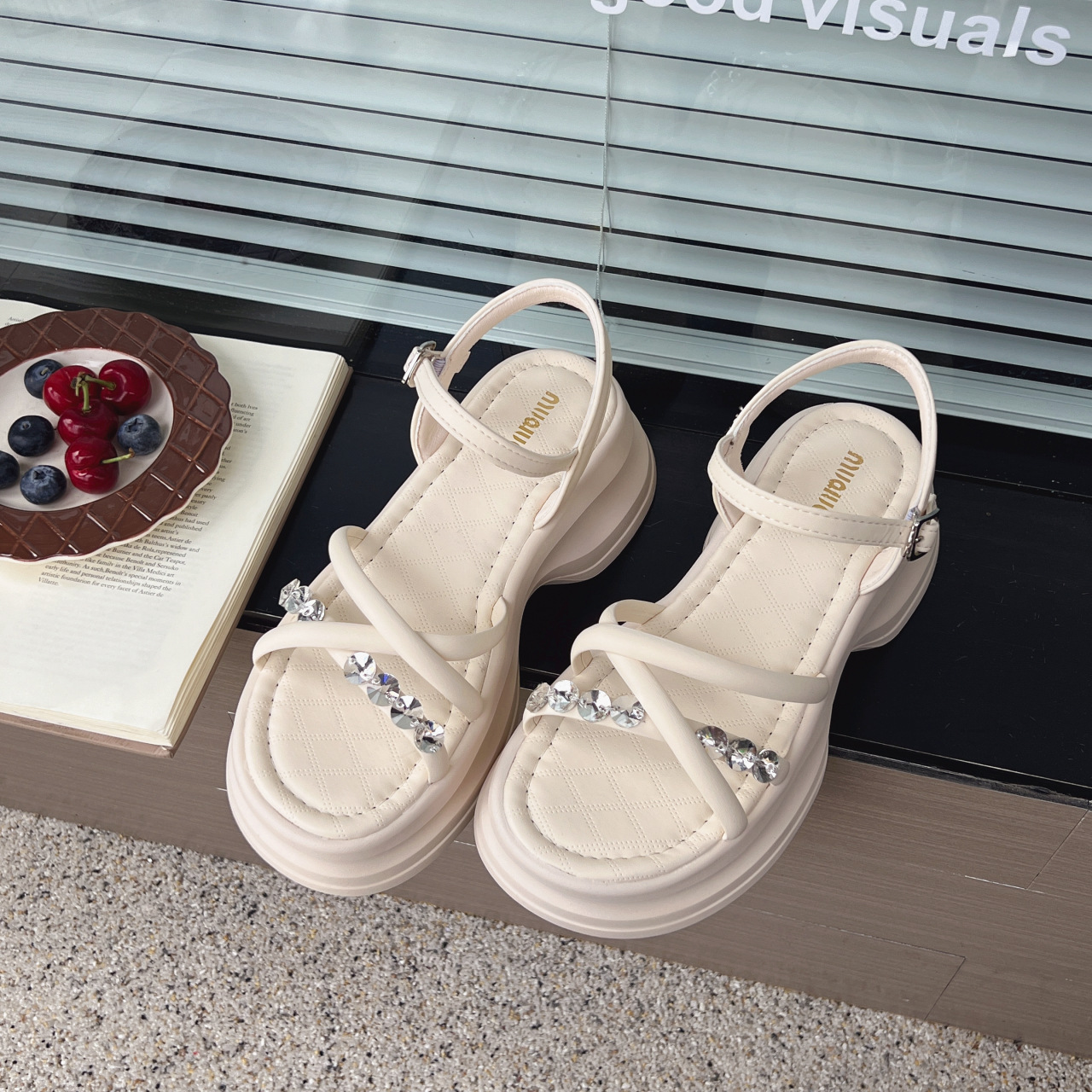 유럽 스탠드 두꺼운 밑창 플랫폼 샌들 2025 여름 새로운 고급 다용도 비치 라인스톤 로마 아우터 샌들