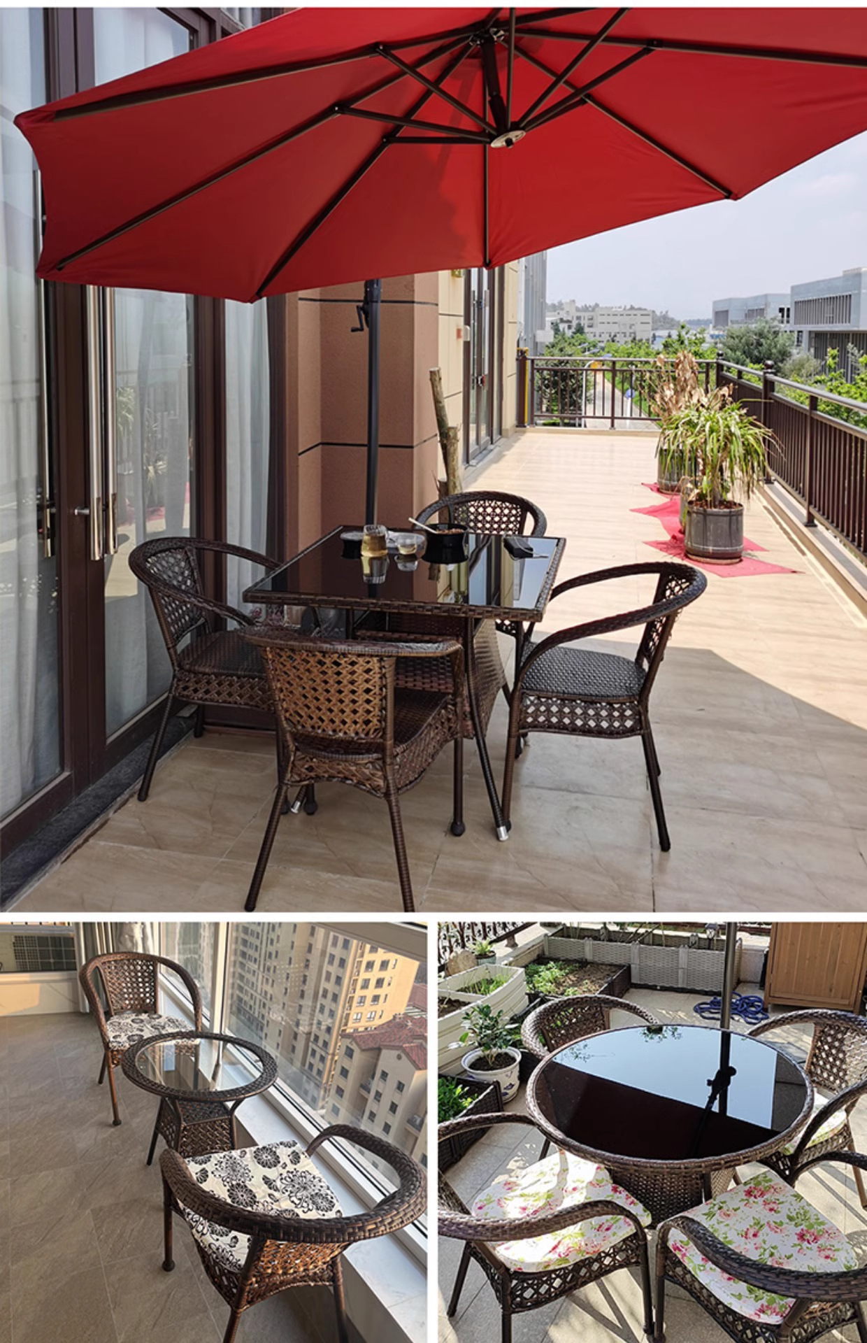 • 의자 4개 + 등나무 90개 원형 테이블 + 버건디 바나나 우산 (사각형 테이블로 교체 가능)
